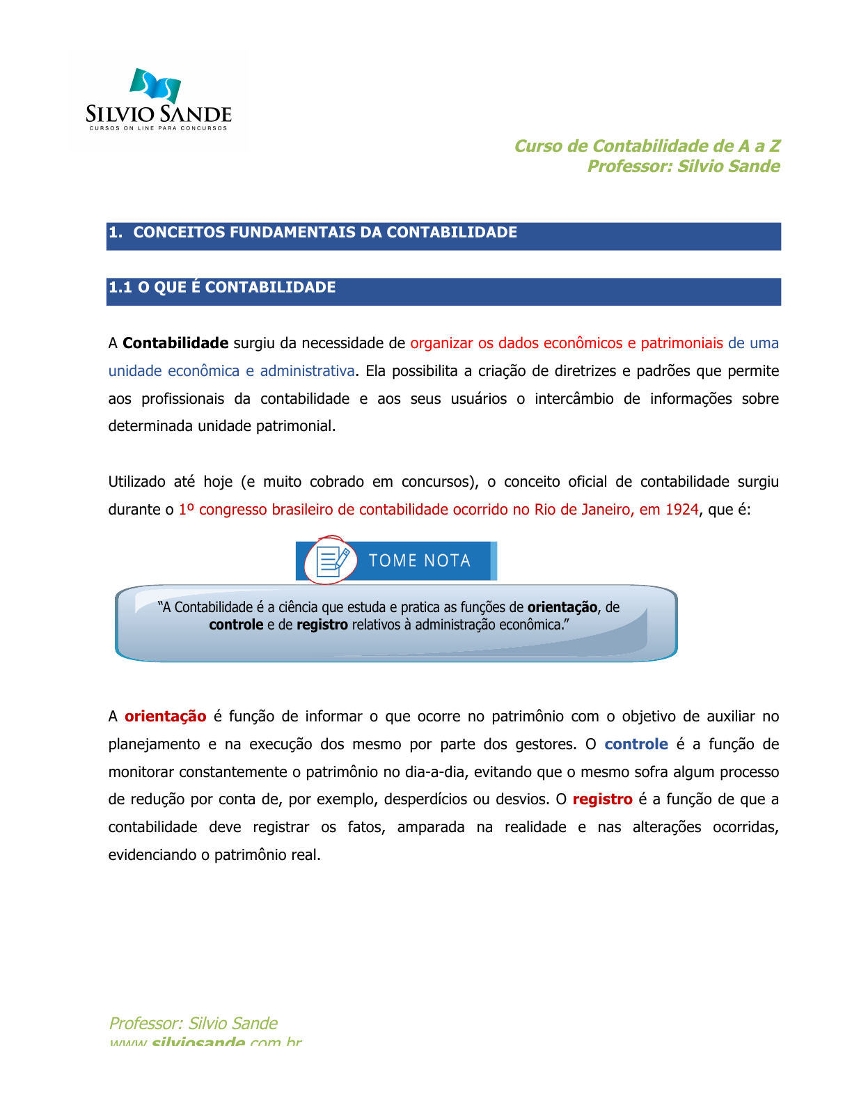 <p>Curso de Contabilidade de A a Z</p><p>Professor: Silvio Sande</p><p>Professor: Silvio Sande</p><p>www.silviosande.com.br</p><p>1. CONCEITOS FUNDAMENTAIS DA CONTABILIDADE</p><p>1.1 O QUE É CONTABILIDADE</p><p>A Contabilidade surgiu da necessidade de organizar os dados econômicos e patrimoniais de uma</p><p>unidade econômica e administrativa. Ela possibilita a criação de diretrizes e padrões que permite</p><p>aos profissionais da contabilidade e aos seus usuários o intercâmbio de informações sobre</p><p>determinada unidade patrimonial.</p><p>Utilizado até hoje (e muito cobrado em concursos), o conceito oficial de contabilidade surgiu</p><p>durante o 1º congresso brasileiro de contabilidade ocorrido no Rio de Janeiro, em 1924, que é:</p><p>A orientação é função de informar o que ocorre no patrimônio com o objetivo de auxiliar no</p><p>planejamento e na execução dos mesmo por parte dos gestores. O controle é a função de</p><p>monitorar constantemente o patrimônio no dia-a-dia, evitando que o mesmo sofra algum processo</p><p>de redução por conta de, por exemplo, desperdícios ou desvios. O registro é a função de que a</p><p>contabilidade deve registrar os fatos, amparada na realidade e nas alterações ocorridas,</p><p>evidenciando o patrimônio real.</p><p>“A Contabilidade é a ciência que estuda e pratica as funções de orientação, de</p><p>controle e de registro relativos à administração econômica.”</p><p>-</p><p>Curso de Contabilidade de A a Z</p><p>Professor: Silvio Sande</p><p>Professor: Silvio Sande</p><p>www.silviosande.com.br</p><p>Podemos definir a Contabilidade como:</p><p>Como uma ciência, a contabilidade possui um objeto, uma finalidade e um campo de aplicação.</p><p>1.2 OBJETO DA CONTABILIDADE</p><p>O objeto de estuda da contabilidade é o patrimônio das aziendas (entidades). Entende-se por</p><p>patrimônio o conjunto de bens, direitos e obrigações e aziendas são as entidades com ou</p><p>sem fim lucrativo.</p><p>Entidades com fins lucrativos são as empresas, ao passo que sem fins lucrativos são os entes</p><p>públicos, as associações, as entidades de classe, etc.</p><p>Desta forma, o objeto de estudo da contabilidade é o conjunto de bens, direitos e obrigações</p><p>pertencentes a qualquer entidade, seja ela pública ou privada e ainda com fins lucrativos ou não.</p><p>1.3 OBJETIVO DA CONTABILIDADE</p><p>O objetivo meio da contabilidade é controlar o Patrimônio ao passo que o objetivo fim é</p><p>fornecer informações sobre esse patrimônio controlado.</p><p>A ciência que estuda e controla o patrimônio, objetivando representá-lo</p><p>graficamente, evidenciar suas variações, estabelecer normas para sua</p><p>interpretação, análise e auditagem e servir como instrumento básico para a</p><p>tomada de decisões de todos os setores direta ou indiretamente envolvidos com</p><p>a empresa.</p><p>-</p><p>Curso de Contabilidade de A a Z</p><p>Professor: Silvio Sande</p><p>Professor: Silvio Sande</p><p>www.silviosande.com.br</p><p>1.4 FINALIDADE DA CONTABILIDADE</p><p>A finalidade da Contabilidade é produzir informações fidedignas da situação de um patrimônio</p><p>para os seus usuários. Essas informações devem ser confiáveis e fundamentadas na realidade. As</p><p>informações geradas pela contabilidade são para usuários internos e externos e não são feitas</p><p>para atender necessidade específica de nenhum grupo.</p><p>1.5 CAMPO DE APLICAÇÃO DA CONTABILIDADE</p><p>Se atentarmos ao objeto da contabilidade e ao conceito, fica fácil para delimitar o seu campo de</p><p>atuação ou campo de aplicação, visto que esta é aplicada a todas as entidades que possuem um</p><p>patrimônio a ser controlado, ou seja a contabilidade se aplica às aziendas, que são entidades</p><p>econômico-administrativas. Entidades econômico-administrativas são as entidades que reúnem</p><p>pessoas, patrimônio, ação administrativa e finalidade estabelecida. O conceito de aziendas não se</p><p>confunde com o de empresas, que possuem fins lucrativos, uma vez que a contabilidade também</p><p>controla o patrimônio de entidades sem fins lucrativos e de governos, por exemplo.</p><p>As aziendas podem ser classificadas:</p><p>a) Quanto ao fim:</p><p>• Social: não visam lucro. São as entes públicos, as sociedades de caráter beneficente,</p><p>esportivo, cultural, recreativo, religioso, etc;</p><p>• Econômico-Social: são aziendas que buscam superávit para revertê-lo reverter em</p><p>benefício de seus filiados como as cooperativas, as entidades de classe, as sociedades de</p><p>pecúlios, as aposentadorias e os benefícios;</p><p>-</p><p>Curso de Contabilidade de A a Z</p><p>Professor: Silvio Sande</p><p>Professor: Silvio Sande</p><p>www.silviosande.com.br</p><p>• Econômica: visam o lucro voltado para seu próprio benefício, como as empresas</p><p>comerciais e industriais.</p><p>b) Quanto a seus proprietários</p><p>• Pública: pertencente à coletividade, mas que podem ser administrada pelo setor público</p><p>ou privado;</p><p>• Particular: pertence a um indivíduo ou a uma grupo restrito de pessoas.</p><p>1.6 USUÁRIOS DA CONTABILIDADE</p><p>Entre os usuários das demonstrações contábeis, incluem-se investidores atuais e potenciais,</p><p>empregados, credores por empréstimos, fornecedores e outros credores comerciais, clientes,</p><p>governos e suas agências e o público. Todos usam as demonstrações contábeis para satisfazer</p><p>algumas das suas diversas necessidades de informação. Essas necessidades incluem:</p><p>a) investidores - Eles necessitam de informações para ajudá-los a decidir se devem comprar,</p><p>manter ou vender investimentos. Os acionistas também estão interessados em informações que os</p><p>habilitem a avaliar se a entidade tem capacidade de pagar dividendos;</p><p>b) empregados - são os empregados e seus representantes interessados em informações sobre</p>