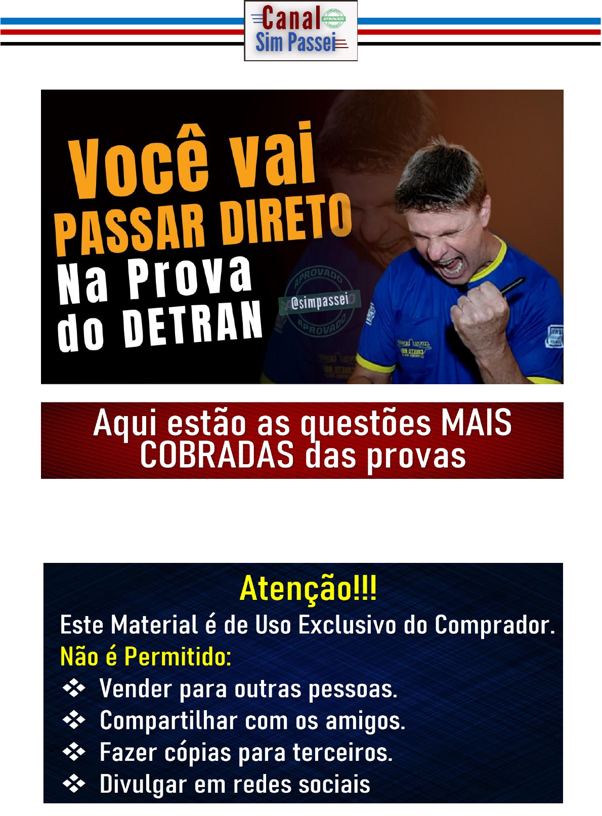 <p>1- Na sinalização horizontal, as inscrições no pavimento se</p><p>subdividem nos seguintes tipos:</p><p>Resposta Certa: Setas direcionais, símbolos e legendas.</p><p>Exemplos para você entender melhor:</p><p>✓ Sinalização horizontal; São “pinturas” feitas na pista de rolamento (na rua).</p><p>✓ Setas direcionais; São setas apontando para esquerda, para direita ou para frente.</p><p>✓ Símbolos; São “figuras” pintadas na via (como estas, por exemplo)</p><p>✓ Legendas; São palavras ou frases escritas na via (como estas, por exemplo)</p><p>2- Quando não há placas regulamentando velocidade máxima, em</p><p>que tipos de vias a velocidade máxima permitida será de 60 km/h?</p><p>Resposta Certa: Nas vias arteriais e nas estradas.</p><p>Memorize também que:</p><p>✓ Nas vias arteriais e nas estradas - A velocidade máxima é de 60km/h</p><p>✓ Nas vias de Trânsito Rápido - A velocidade máxima é de 80km/h</p><p>✓ Nas vias Coletoras - A velocidade máxima é de 40km/h</p><p>✓ Nas vias Locais - A velocidade máxima é de 30km/h</p><p>3- A noite, caso você seja ofuscado(a) pelo farol alto de um veículo</p><p>que venha em sentido contrário ao seu, o que você deve fazer?</p><p>Resposta Certa: Desviar os olhos para uma referência na faixa à direita da</p><p>pista ou piscar os faróis para alertar o outro condutor.</p><p>Explicando melhor: Esta referência à direita da pista,</p><p>é a linha de bordo, ou seja, a linha que separa a pista</p><p>de rolamento (rua) do acostamento, ou que informa</p><p>o fim da pista de rolamento. Linha de bordo é essa.</p><p>4- Como se chamam as principais áreas do pescoço, com as quais</p><p>devemos nos preocupar em caso de acidentes?</p><p>Resposta Certa: Coluna cervical e artéria carótida.</p><p>Dica extra: Lesões na coluna são perigosas porque nela passam nervos que controlam</p><p>movimentos. Romper uma artéria é perigoso, porque ocasiona grande perda de sangue.</p><p>5- O que é Poluição?</p><p>Resposta Certa: É a alteração desfavorável do meio ambiente causada pelos</p><p>subprodutos resultantes da atividade humana.</p><p>6- Que tipos de fraturas existem?</p><p>Resposta Certa: Aberta e fechada.</p><p>Explicando melhor: Fratura fechada é aquela que não expõe o osso fora da pele, e</p><p>fratura aberta ou exposta é aquela que você vê partes do osso fora da pele.</p><p>7- Se no período de 12 meses um condutor comete uma infração de</p><p>natureza leve ou média, ao invés de multa a ele será aplicada:</p><p>Resposta Certa: Advertência por escrito.</p><p>Atenção: Isso somente se aplica, caso não haja outra infração no período de 12 meses.</p><p>OBS: Questão atualizada com as novas regras do CTB de 12/04/2021</p><p>8- A placa de serviço auxiliar ao lado é chamada de:</p><p>Resposta Certa: Serviço mecânico.</p><p>9- Analise a imagem e descreva a atitude do condutor à esquerda.</p><p>Resposta Certa: Ele está fazendo uma ultrapassagem proibida pois a faixa</p><p>pintada na via é continua.</p><p>Explicando melhor: Faixa contínua pintada na via</p><p>à esquerda do condutor significa proibição de mudanças</p><p>de faixa e ultrapassagem. Não importa se ela é branca</p><p>ou amarela. Faixa contínua é isso:</p><p>10- Que tipos de freios existem nos veículos automotores?</p><p>Resposta Certa: Freio mecânico e freio hidráulico.</p><p>Explicando melhor: Freio mecânico é o freio de mão ou freio de estacionamento. Freio</p><p>hidráulico é o freio de pé ou freio de serviço.</p><p>11- São considerados equipamentos obrigatórios nos veículos:</p><p>Resposta Certa: Buzina, faróis, retrovisores, limpadores de para brisas, para</p><p>choques.</p><p>Cuidado: Nas outras opções de resposta podem aparecer equipamentos que não são</p><p>obrigatórios, mas você acha que são porque ouviu dizer. Exemplo: farol de neblina, farol</p><p>de milha, limpador do vidro traseiro. Leia a questão com calma para não marcar errado.</p><p>12- São equipamentos do veículo que prejudicam o meio ambiente</p><p>se não estiverem funcionando corretamente:</p><p>Resposta Certa: Escapamento, sistema de injeção e ar-condicionado.</p><p>Explicando melhor: Escapamento é a descarga dos veículos. Injeção é o componente</p><p>que injeta combustível para ser queimado na câmara de combustão.</p><p>13- Se um veículo com freio a disco na dianteira e tambor na</p><p>traseira estiver com as lonas desreguladas, isso ocasionará:</p><p>Resposta Certa: Maior curso do pedal do freio.</p><p>Explicando melhor: Maior curso de um pedal significa “ter que pisar até o fundo” para o</p><p>freio funcionar. Se isso ocorrer, é porque o freio está com algum problema.</p><p>14- Qual a vantagem do álcool como combustível nos veículos?</p><p>Resposta Certa: Diminuição da emissão de poluentes.</p><p>Explicando melhor: Álcool combustível é produzido à partir da cana de açúcar, do milho</p><p>ou do eucalipto, por isso ao queimar, libera baixa quantidade de poluentes.</p><p>15- Se um pedestre for atropelado e estiver caído com dores nas</p><p>costas, enquanto aguarda o resgate, a pessoa que socorre deverá:</p><p>Resposta Certa: Sinalizar o local do acidente, verificar o estado geral da</p><p>vítima, chamar o resgate e evitar movimentá-la.</p><p>Dica extra: Sinalizar o local do acidente e evitar movimentar uma vítima aparece como</p><p>resposta certa na maioria das perguntas de primeiros socorros. Memorize isso!!!</p><p>16- Qual o melhor procedimento ao se dirigir na chuva?</p><p>Resposta Certa: Deve-se acender o farol baixo, acionar o limpador de para</p><p>brisas e reduzir a velocidade para evitar o efeito da aquaplanagem.</p><p>Dica: Aquaplanagem é a “flutuação” do veículo numa poça de água. Com isso, a pessoa</p><p>poderá perder o controle do veículo e causar acidentes.</p><p>OBS: Questão atualizada com as novas regras do</p><p>CTB de 12/04/2021</p><p>17- A placa ao lado informa i