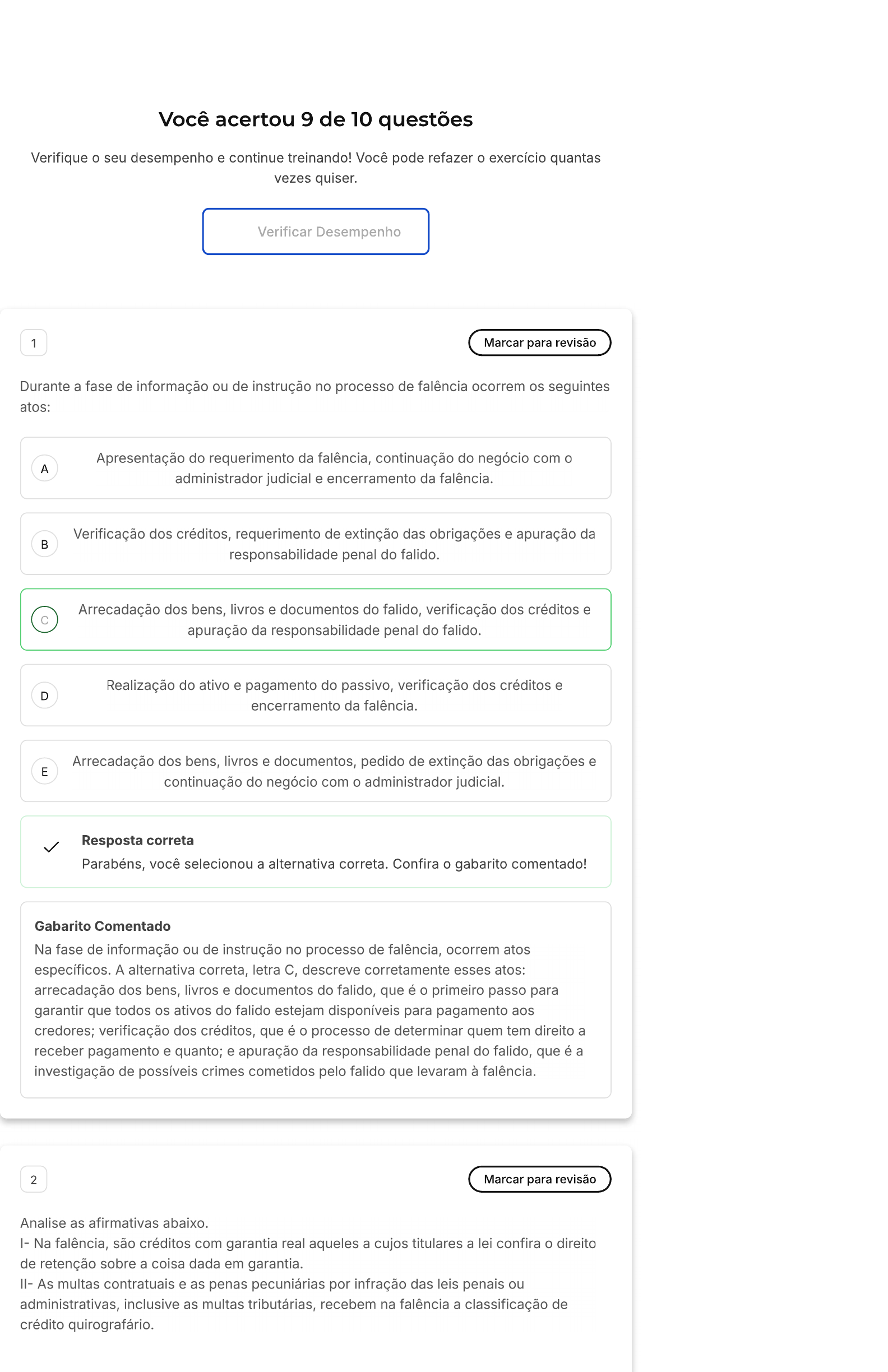 <p>Você acertou 9 de 10 questões Verifique o seu desempenho e continue treinando! Você pode refazer o exercício quantas vezes quiser. Verificar Desempenho 1 Marcar para revisão Durante a fase de informação ou de instrução no processo de falência ocorrem os seguintes atos: Apresentação do requerimento da falência, continuação do negócio com o A administrador judicial e encerramento da falência. Verificação dos créditos, requerimento de extinção das obrigações e apuração da B responsabilidade penal do falido. Arrecadação dos bens, livros e documentos do falido, verificação dos créditos e C apuração da responsabilidade penal do falido. Realização do ativo e pagamento do passivo, verificação dos créditos e D encerramento da falência. Arrecadação dos bens, livros e documentos, pedido de extinção das obrigações e E continuação do negócio com o administrador Resposta correta Parabéns, você selecionou a alternativa correta. Confira o gabarito comentado! Gabarito Comentado Na fase de informação ou de instrução no processo de falência, ocorrem atos específicos. A alternativa correta, letra C, descreve corretamente esses atos: arrecadação dos bens, livros e documentos do falido, que é o primeiro passo para garantir que todos os ativos do falido estejam disponíveis para pagamento aos credores; verificação dos créditos, que é o processo de determinar quem tem direito a receber pagamento e quanto; e apuração da responsabilidade penal do falido, que é a investigação de possíveis crimes cometidos pelo falido que levaram à falência. 2 Marcar para revisão Analise as afirmativas abaixo. Na falência, são créditos com garantia real aqueles a cujos titulares a lei confira o direito de retenção sobre a coisa dada em garantia. II- As multas contratuais e as penas pecuniárias por infração das leis penais ou administrativas, inclusive as multas tributárias, recebem na falência a classificação de crédito quirografário.</p><p>III- Terão a classificação de créditos subordinados na falência os créditos dos sócios e dos administradores sem vínculo empregatício. Está(ão) correta(s) a(s) afirmativa(s): A B III C II D III E Resposta correta Parabéns, você selecionou a alternativa correta. Confira o gabarito comentado! Gabarito Comentado A alternativa correta é a III, que afirma que os créditos dos sócios e dos administradores sem vínculo empregatício são classificados como créditos subordinados na falência. Isso significa que esses créditos têm uma prioridade menor na ordem de pagamento em caso de falência. As outras afirmativas estão incorretas: na afirmativa I, os créditos com garantia real são aqueles que possuem um bem específico como garantia, e não necessariamente conferem ao titular o direito de retenção sobre a coisa dada em garantia. Na afirmativa II, as multas contratuais e as penas pecuniárias por infração das leis penais ou administrativas, inclusive as multas tributárias, não são classificadas como créditos quirografários na falência. 3 Marcar para revisão instituto da falência não se aplica: A empresas públicas e sociedades de economia mista B cooperativas e sociedades empresárias C Às associações e empresários individuais D Às sociedades simples e companhias E entidades de previdência complementar e sociedades por ações Resposta correta Parabéns, você selecionou a alternativa correta. Confira o gabarito comentado! Gabarito Comentado instituto da falência é um mecanismo legal que se aplica a entidades privadas que não conseguem pagar suas dívidas. No entanto, este mecanismo não se aplica a empresas públicas e sociedades de economia mista. Isso ocorre porque essas</p><p>entidades são controladas pelo governo e, portanto, têm regras e regulamentos diferentes para lidar com insolvência e dívidas. Portanto, a alternativa correta é empresas públicas e sociedades de economia 4 Marcar para revisão São legitimados para requerer recuperação judicial por meio de plano especial as seguintes pessoas, EXCETO: A sociedades cooperativas B microempreendedores individuais C empresários de pequeno porte D microempresários E sociedades limitadas enquadradas como microempresa Resposta correta Parabéns, você selecionou a alternativa correta. Confira o gabarito comentado! Gabarito Comentado De acordo com a legislação brasileira, as sociedades cooperativas não estão legitimadas para requerer recuperação judicial por meio de plano especial. As demais opções - microempreendedores individuais, empresários de pequeno porte, microempresários e sociedades limitadas enquadradas como microempresa estão aptas a solicitar esse tipo de recuperação judicial. Portanto, a alternativa correta é a "A", que menciona as sociedades cooperativas. 5 Marcar para revisão Analise as afirmativas abaixo sobre o plano de recuperação judicial: |- plano de recuperação judicial poderá prever prazo de até 5 (cinco) anos para pagamento dos créditos derivados da legislação do trabalho ou decorrentes de acidentes de trabalho vencidos até a data do pedido de recuperação judicial. II- o plano de recuperação deverá conter o laudo econômico-financeiro e de avaliação dos bens e ativos do devedor, subscrito pelo administrador judicial. III- plano de recuperação será apresentado pelo devedor em juízo no prazo improrrogável de 60 (sessenta) dias da publicação da decisão que deferir o processamento da recuperação judicial. É correto o que se afirma na(s) alternativa(s): A B III C</p><p>D le E III Resposta correta Parabéns, você selecionou a alternativa correta. Confira o gabarito comentado! Gabarito Comentado A alternativa correta é a III, que afirma que o plano de recuperação será apresentado pelo devedor em juízo no prazo improrrogável de 60 (sessenta) dias da publicação da decisão que deferir o processamento da recuperação judicial. Isso está de acordo 