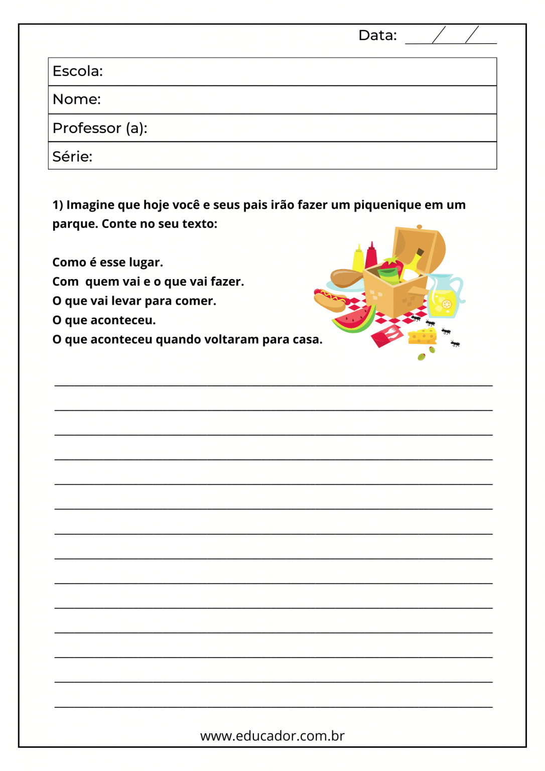 <p>Data: Escola: Nome: Professor (a): Série: 1) Imagine que hoje você e seus pais irão fazer um piquenique em um parque. Conte no seu texto: Como é esse lugar. Com quem vai e o que vai fazer. o que vai levar para comer. o que aconteceu. o que aconteceu quando voltaram para casa. www.educador.com.br</p>