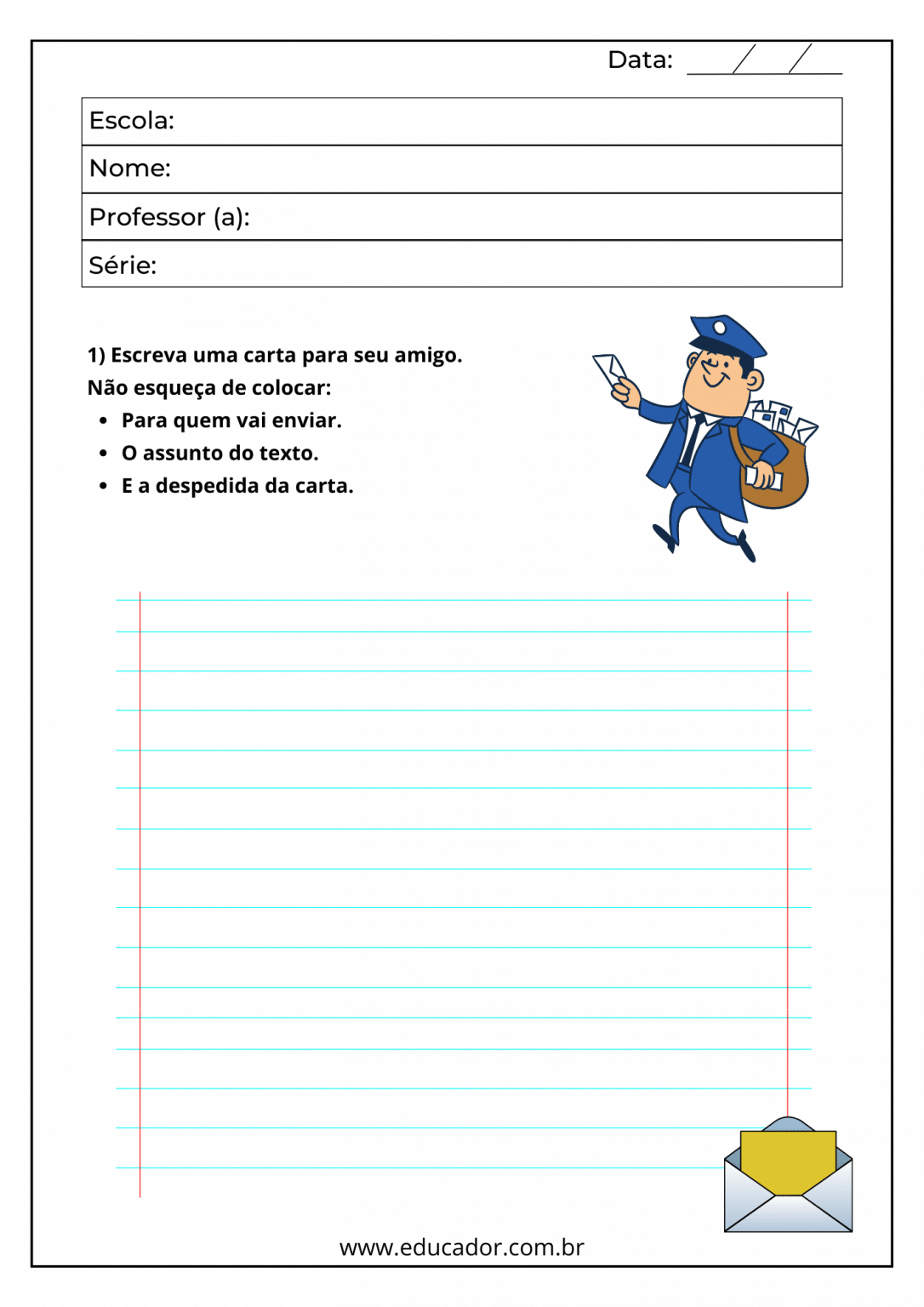 <p>Data: Escola: Nome: Professor (a): Série: 1) Escreva uma carta para seu amigo. Não esqueça de colocar: Para quem vai enviar. o assunto do texto. E a despedida da carta. www.educador.com.br</p>