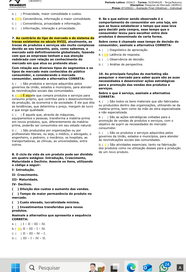 <p>(3635457) Período Letivo: 2024/2 Turma: UNIASSELVI Disciplina: Pesquisa de Mercado (ADM22) Prova: 87105021 Avaliação Final (Objetiva) - Individual A. ) Privacidade, maior comodidade e custos. ( ) Conveniência, informação e maior 9. Se o que estiver sendo observado é o ( ) Conveniência, privacidade e informação. comportamento do consumidor em uma loja, em que se busca estabelecer o tempo que esse leva D. ( ) Informação, interação e para decidir pela compra, esse tempo que o consumidor levou para escolher entre dois 7. Ao contrário do tipo de mercado e do sistema de produtos é denominado de certa forma. trocas existentes no século XVIII, atualmente, as Sobre como é chamado esse tempo de decisão do trocas de produtos e serviços são muito complexas consumidor, assinale a alternativa CORRETA: devido ao seu tamanho, pois, como sabemos, o A. Diagnóstico de apreciação. mercado está definitivamente globalizado, fazendo com que as empresas tenham a sua atenção B. Latência de resposta. redobrada com relação ao conhecimento do Observância de mercado em que atua ou pretende atuar. D. ) Analise de perspectiva. Com relação aos diversos tipos de segmentos e os tipos de mercado mais conhecidos do consumidor, e considerando o mercado 10. As principais funções do marketing são consumidor, assinale a alternativa CORRETA: pesquisar o mercado para saber quais são as suas necessidades e desenvolver ações estratégicas A. ( ) São produtos e serviços adquiridos pelos para a promoção das vendas dos produtos e governos da União, estados e municípios, para atender serviços. às reivindicações sociais das Sobre o que é serviço, assinale a alternativa B. É aquele que compra produtos e serviços para CORRETA: consumo próprio, que contribui para desenvolvimento da produção, da economia e da É ele que dita A. ( São todos os bens materiais que são fabricados as tendências, que determina preço, margem de lucro ou produzidos dentro das organizações, utilizando-se da e que exige qualidade. matéria-prima, bem como da mão de obra especializada e não especializada. ( ) É aquele que, através de máquinas, equipamentos e pessoas, transforma a matéria-prima B. ( São as ações estratégicas voltadas para a em novos produtos, que, diferentemente da matéria- promoção de vendas de produtos e serviços, com o prima, poderão ser consumidos em seu estado natural. objetivo de suprir as necessidades do mercado consumidor. D. ) São produzidos por organizações ou por profissionais liberais, ou seja, médico, advogado, o ( ) São os produtos e serviços adquiridos pelos engenheiro, pedreiro, os hospitais, as governos da estados e municípios, para atender transportadoras, as as universidades, entre às reivindicações sociais das D. ) São atividades tanto na fabricação dos produtos como na utilização desses para a produção de um novo produto. 8. o ciclo de vida de um produto pode ser dividido em quatro estágios: Introdução, Crescimento, Maturidade e Declinio. Associe os itens, utilizando o código a seguir: Introdução. II- III- Maturidade. IV- ( ) Diluição dos custos e aumento das vendas. ( ) Tempo de maior permanência do produto no mercado. ( ) Custo elevado, lucratividade ( ) Investimentos transferidos para novos produtos. Assinale a alternativa que apresenta a sequência CORRETA: ( B. ( C. ) II III IV I. D. ) III IV II. 24 Q Pesquisar A</p>
