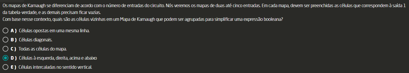 <p>Os mapas de Karnaugh se diferenciam de acordo com número de entradas do circuito. Nós veremos os mapas de duas até cinco entradas. Em cada mapa, devem ser preenchidas as células que correspondem à saída 1 da tabela-verdade, e as demais precisam ficar vazias. Com base nesse contexto, quais são as células vizinhas em um de Karnaugh que podem ser agrupadas para simplificar uma expressão booleana? A ) Células opostas em uma mesma linha. B) Células diagonais. Todas as células do mapa. D ) Células à esquerda, direita, acima e abaixo E) Células intercaladas no sentido vertical.</p>