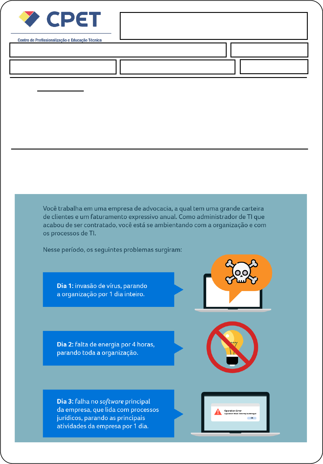 <p>Atividade Prática</p><p>Por mais que uma organização trabalhe arduamente para minimizar o risco, este sempre estará presente.</p><p>Nesse sentido, preparar a empresa para que continue a operar em meio ao desastre é o objetivo de um</p><p>PCN ou plano de contingência.</p><p>Gestão de Projetos e prevenções</p><p>Aluno (a): Fernanda Gabrielly da Silva Magalhães Data: 14 / 04 / 2024.</p><p>Atividade Prática Final</p><p>NOTA:</p><p>INSTRUÇÕES:</p><p>❖ Esta Avaliação contém 1 (uma) questão, totalizando 10 (dez) pontos.</p><p>❖ Você deve preencher dos dados no Cabeçalho para sua identificação</p><p>o Nome / Data de entrega</p><p>❖ As respostas devem ser digitadas abaixo de cada pergunta.</p><p>❖ Ao terminar, grave o arquivo com o nome Avaliação Pesquisa/Prática.</p><p>❖ Envio o arquivo pelo sistema.</p><p>Atividade Prática</p><p>Como administrador de TI, quais saídas você poderia propor visando a garantir que a empresa continue</p><p>a funcionar e a evitar a ocorrência desses desastres?</p><p>RESPOSTA:</p><p>As circunstâncias demonstraram que a equipe de TI não forneceu uma orientação adequada à empresa,</p><p>como administrador, acho que não houve uma análise de riscos prévia. Para evitar a paralização do</p><p>sistema e causar danos à empresa, todos os riscos devem ser listados.</p><p>A equipe de TI deve estar bem harmonizada e concentrada para criar um plano de emergência, pois sua</p><p>performance afetará as demais áreas da empresa. O departamento de TI é O núcleo da empresa, então</p><p>deve ser confiável e bem estruturado. Além disso, é necessária uma boa gestão para direcionar os</p><p>procedimentos a serem usados. Temos muitos benefícios disso, como reduzir os custos com soluções</p><p>tecnológicas, criar um ambiente favorável à inovação, aumentar a foco em segurança e garantir que os</p><p>objetivos organizacionais estejam mais alinhados.</p><p>Em caso de invasão de vírus, é necessário um antivírus. Esse programa deve ser instalado em todos os</p><p>computadores da empresa, exceto aqueles que trabalham na área de TI. O backup, que permite que o</p><p>sistema funcione em outro lugar, é um passo importante. Para casos de falta de energia, é necessário</p><p>instalar um nobreak ou um gerador de energia movido a combustível.</p>