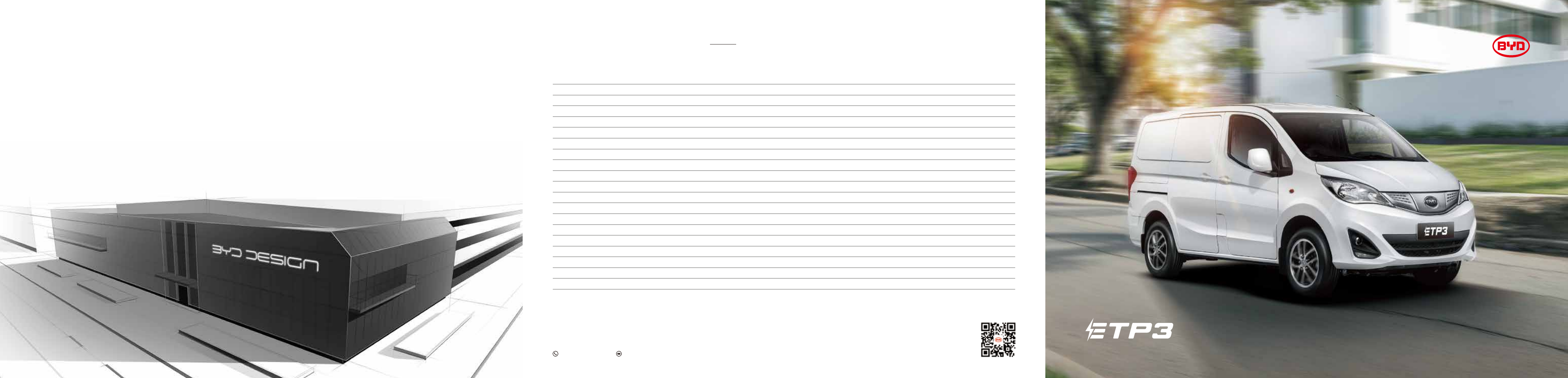 <p>BYD Europe B.V.</p><p>Schiedam, The Netherlands</p><p>+31-10-2070888 sales.europe@byd.com</p><p>www.bydeurope.com</p><p>Pure Electric Panel Van ETP3</p><p>Overall Dimension (L/W/H)</p><p>Kerb Weight</p><p>G.V.W</p><p>Payload</p><p>Wheelbase</p><p>Max. Speed</p><p>Max. Gradeability</p><p>Range* (WLTP)</p><p>Suspension</p><p>Brakes</p><p>Tyres</p><p>Motor Type</p><p>Rated Motor Power</p><p>Max. Motor Power</p><p>Max. Torque</p><p>Battery Type</p><p>Battery Capacity**</p><p>Charging Power</p><p>Charging Time</p><p>mm</p><p>kg</p><p>kg</p><p>kg</p><p>mm</p><p>km/h</p><p>%</p><p>km</p><p>kW</p><p>kW</p><p>N·m</p><p>kWh</p><p>kW</p><p>h</p><p>4,460/1,720/1,875</p><p>1,640</p><p>2,420</p><p>780</p><p>2,725</p><p>100</p><p>20</p><p>275 (City)/233 (Combined)</p><p>McPherson Strut (Front), Leaf Spring (Rear)</p><p>Hydraulic Disc Brakes, ABS, Regenerative Braking</p><p>195/60 R16C</p><p>AC Permanent Magnet Synchronous Motor</p><p>35</p><p>100</p><p>180</p><p>LiFePO4</p><p>44.9</p><p>DC 50/AC 6.6</p><p>DC 0.5/AC 5.5 (SOC 20%-100%)</p><p>Technical Data</p><p>*Actual range will vary depending upon driving/charging habits, speed, conditions, weather, temperature and battery lifecycle etc.</p><p>**The battery capacity is initial capacity. It will decrease with the time and use.</p><p>BYD eTruck. Carrying a better future</p><p>BYD reserves the right to make modifications to vehicle information without prior notice. 0222-BPS-V2</p><p>Technology is central to BYD’s DNA, and the company’s strong R&D ability is vital to its rapid development. Following its “technol-</p><p>ogy-based, innovation oriented” development philosophy, BYD believes that technology has the power to change people’s lives</p><p>and make better the world we live in. BYD has successfully built a world-class platform for technological innovation on which world</p><p>leading, BYD-inspired advanced technologies are continuously proven before introduction across many fields.</p><p>BYD’s dedicated Truck Research Institute is mainly engaged in the R&D and design of the whole vehicle and chassis for pure electric</p><p>trucks and special vehicles designed for use in logistics, construction, sanitation and port operations.</p><p>BYD Design</p><p>BYD Commercial Vehicle</p><p>1. Multifunction Steering Wheel</p><p>2. TFT Dash Board</p><p>3. Push to Start</p><p>4. Radio</p><p>5. EPB (Electric Parking Break)</p><p>6. C-EPS (Electric Power Steering)</p><p>7. Ergonomic Driving Seats</p><p>8. Storages</p><p>5</p><p>4</p><p>3</p><p>8 8</p><p>8</p><p>2</p><p>1</p><p>7 7</p><p>6</p><p>Automatic Headlight</p><p>Light sensor located at the rearview mirror</p><p>will detect the light intensity and automatically</p><p>turn on/off the clearance lamp or the low</p><p>beam light.</p><p>Fast Charging Technology</p><p>It takes only 0.5h</p><p>to charge BYD ETP3 from SOC 20% to100%.</p><p>Aluminium Floor</p><p>Anti-slip and wear-resistant aluminium alloy</p><p>floor with draw buckles to secure the cargo.</p><p>Cargo Space</p><p>Maximum 3.5m³ storage space for your</p><p>logistics needs.</p><p>BYD e-platform</p><p>Through “33111” high integrated system</p><p>design, BYD e-platform is able to reduce the</p><p>weight of the vehicles, manufacture and</p><p>maintenance cost and optimized the layout of</p><p>the parts to increase the reliability, safety and</p><p>energy efficiency.</p><p>With this platform BYD ETP3 is built to passen-</p><p>ger cars’ standard that provides great safety</p><p>and a better driving experience</p><p>Regenerative Braking System</p><p>When under braking or lifting the accelerator (battery power lower than 90%), the kinetic energy is converted into</p><p>electricity to recharge the battery. It can effectively reduce brake pad abrasion, improve driving range and save energy.</p><p>Release accelerator</p><p>Release accelerator Coast downhill Brake</p><p>Regenerative brake</p><p>system controller</p><p>Inverter and</p><p>electric motor</p><p>Charging system</p><p>BatteryWheels</p><p>Battery Thermal Management System (BTMS)</p><p>BTMS is a liquid thermal management system that guarantees the battery</p><p>temperature stays at the optimum operational temperature. This increases</p><p>the safety and reliability of the battery system and enables the vehicle to</p><p>operate in extreme weather conditions.</p><p>BYD Blade Battery</p><p>The BYD latest game changing ultra-safe</p><p>Blade Battery features high starting</p><p>temperature for exothermic reactions,</p><p>slow heat release, low heat generation</p><p>and increased space utilisation of the</p><p>battery pack by over 50% compared to</p><p>conventional lithium iron phosphate</p><p>block batteries.</p>