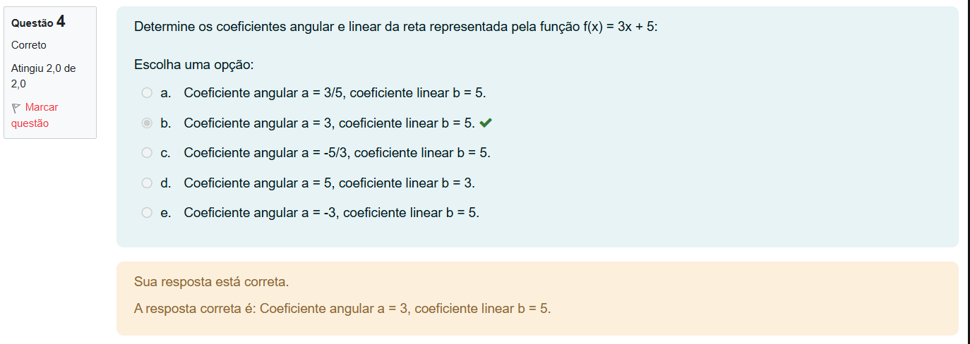 <p>Questão 4 Determine os coeficientes angular e linear da reta representada pela função f(x) = 3x + 5: Correto Atingiu 2,0 de Escolha uma opção: 2,0 a. Coeficiente angular a = 3/5, coeficiente linear b = 5. Marcar questão b. Coeficiente angular a coeficiente linear b = 5. C. Coeficiente angular a = -5/3, coeficiente linear b = 5. d. Coeficiente angular a=5, coeficiente linear b = 3. e. Coeficiente angular a = -3, coeficiente linear b = 5. Sua resposta está correta. A resposta correta é: Coeficiente angular a = 3, coeficiente linear b = 5.</p>