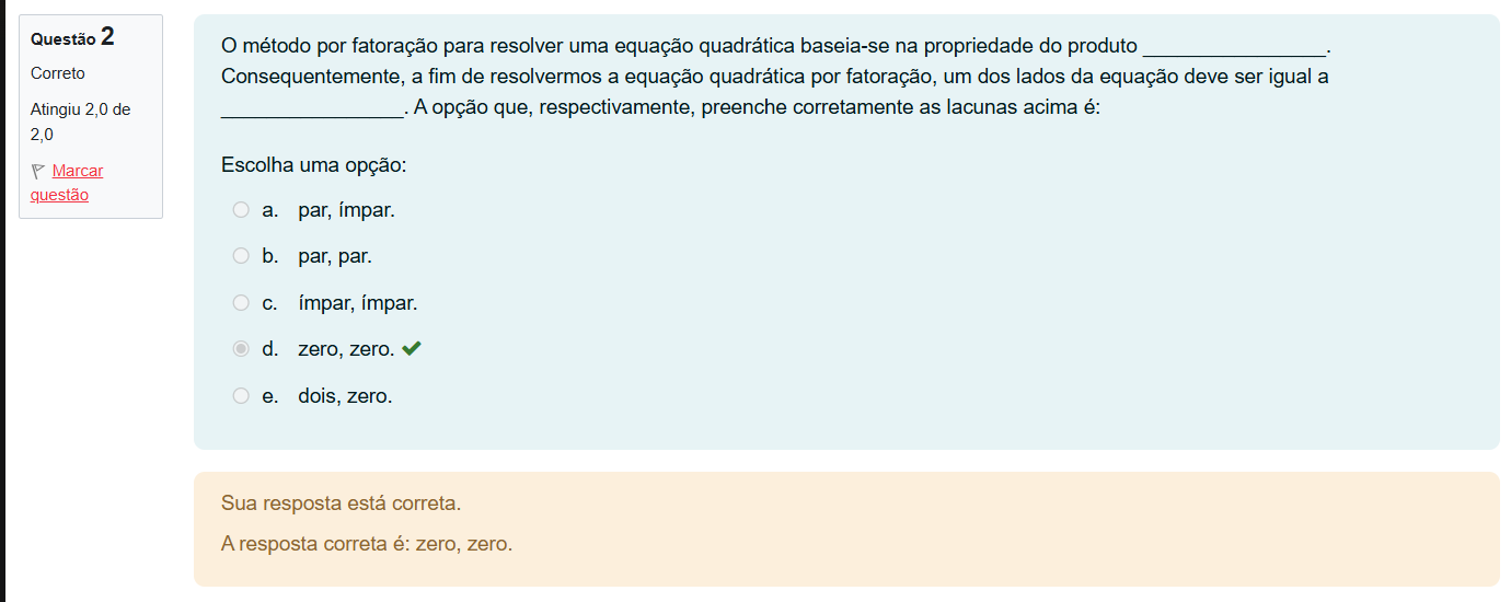 <p>Questão 2 método por fatoração para resolver uma equação quadrática na propriedade do produto Correto Consequentemente, a fim de resolvermos a equação quadrática por fatoração, um dos lados da equação deve ser igual a Atingiu 2,0 de . A opção que, respectivamente, preenche corretamente as lacunas acima é: 2,0 Marcar Escolha uma opção: questão a. par, impar. b. par, par. C. impar, impar. d. zero, zero. e. dois, zero. Sua resposta está correta. A resposta correta é: zero, zero.</p>
