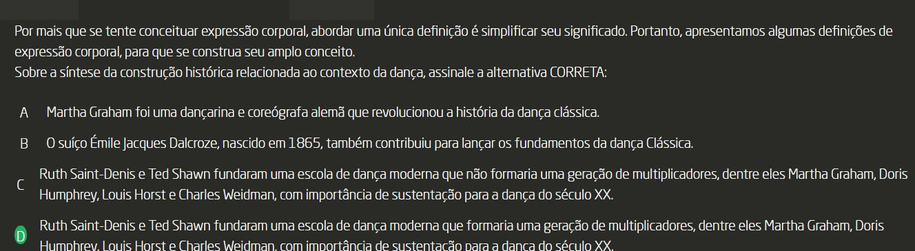 <p>Por mais que se tente conceituar expressão corporal, abordar uma única definição é simplificar seu significado. Portanto, apresentamos algumas definições de expressão corporal, para que se construa seu amplo conceito. Sobre a síntese da construção histórica relacionada ao contexto da dança, assinale a alternativa CORRETA: A Martha Graham foi uma dançarina e que revolucionou a história da dança clássica. B suíço Émile Jacques Dalcroze, nascido em 1865, também contribuiu para lançar os fundamentos da dança Clássica. Ruth Saint-Denis e Ted Shawn fundaram uma escola de dança moderna que não formaria uma geração de multiplicadores, dentre eles Martha Graham, Doris C Humphrey, Louis Horst e Charles Weidman, com importância de sustentação para a dança do século XX. Ruth Saint-Denis e Ted Shawn fundaram uma escola de dança moderna que formaria uma geração de multiplicadores, dentre eles Martha Graham, Doris D Humphrev. Louis Horst e Charles com importância de sustentação para a danca do século XX.</p>
