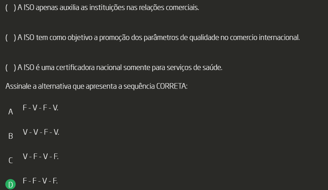 <p>( ) A ISO apenas auxilia as instituições nas relações comerciais. ( ) A ISO tem como objetivo a promoção dos parâmetros de qualidade no comercio internacional. ( ) A ISO é uma certificadora nacional somente para serviços de saúde. Assinale a alternativa que apresenta a CORRETA: A V-F-V-F F-F-V-F D</p>