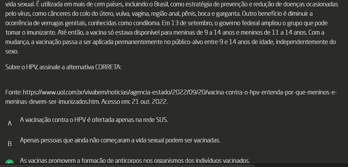 <p>vida sexual. É utilizada em mais de cem países, incluindo Brasil, como estratégia de prevenção e redução de doenças ocasionadas ocorrência de verrugas genitais, conhecidas como condiloma. Em 13 de setembro, governo federal ampliou grupo que pode tomar imunizante. Até então, a vacina só estava disponível para meninas de 9 a 14 anos e meninos de 11 a 14 anos. Com a mudança, a vacinação passa a ser aplicada permanentemente no público-alvo entre 9 e 14 anos de idade, independentemente do sexo. Sobre HPV, assinale a alternativa CORRETA: Fonte: meninas-devem-ser-imunizados.htm. Acesso em: 21 out. 2022. A A vacinação contra HPV é ofertada apenas na rede SUS. Apenas pessoas que ainda não começaram a vida sexual podem ser vacinadas. As vacinas promovem a formação de anticorpos nos organismos dos indivíduos vacinados.</p>
