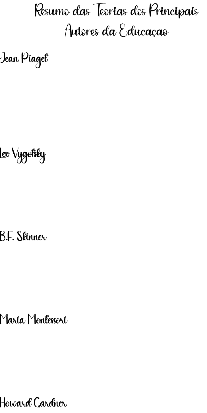 <p>Teoria do Desenvolvimento Cognitivo: Piaget propôs que as crianças passam</p><p>por estágios de desenvolvimento cognitivo (sensorial-motor, pré-operacional,</p><p>operacional concreto e operacional formal). A aprendizagem, segundo ele,</p><p>ocorre à medida que as crianças interagem com o mundo e constroem seu</p><p>conhecimento.</p><p>Teoria Sociocultural: Vygotsky enfatizou o papel da interação social e da cultura</p><p>no desenvolvimento cognitivo. Introduziu o conceito de "zona de</p><p>desenvolvimento proximal", onde a aprendizagem ocorre com o auxílio de um</p><p>adulto ou colega mais experiente.</p><p>Behaviorismo: Skinner acreditava que o comportamento é moldado por reforços</p><p>e punições. A educação, segundo ele, deve se concentrar em comportamentos</p><p>observáveis e usar técnicas de condicionamento para promover a</p><p>aprendizagem.</p><p>Método Montessori: Montessori defendia uma abordagem centrada na criança,</p><p>onde o ambiente deve ser preparado para estimular a autonomia e a exploração.</p><p>A aprendizagem deve ser autodirigida e baseada em materiais concretos que</p><p>incentivem a descoberta.</p><p>Teoria das Inteligências Múltiplas: Gardner propôs que existem diferentes</p><p>tipos de inteligência (como linguística, lógico-matemática, espacial, musical,</p><p>entre outras). A educação deve reconhecer e valorizar essas múltiplas</p><p>inteligências, adaptando o ensino às habilidades individuais dos alunos.</p><p>Pedagogia Crítica: Freire enfatizava a conscientização e o diálogo como</p><p>ferramentas de transformação social. Defendia uma educação libertadora, onde</p><p>o educador e o educando aprendem juntos, questionando e desafiando</p><p>estruturas de opressão.</p><p>Teoria da Aprendizagem por Descoberta: Bruner acreditava que os alunos</p><p>aprendem melhor quando descobrem por si mesmos. Ele propôs uma</p><p>abordagem construtivista, onde o conhecimento é construído ativamente através</p><p>da exploração e da descoberta.</p>