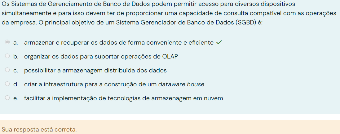 <p>Os Sistemas de Gerenciamento de Banco de Dados podem permitir acesso para diversos dispositivos simultaneamente e para isso devem ter de proporcionar uma capacidade de consulta compatível com as operações da empresa. principal objetivo de um Sistema Gerenciador de Banco de Dados (SGBD) é: a. armazenar e recuperar os dados de forma conveniente e eficiente b. organizar os dados para suportar operações de OLAP C. possibilitar a armazenagem distribuída dos dados d. criar a infraestrutura para a construção de um dataware house e. facilitar a implementação de tecnologias de armazenagem em nuvem Sua resposta está correta.</p>