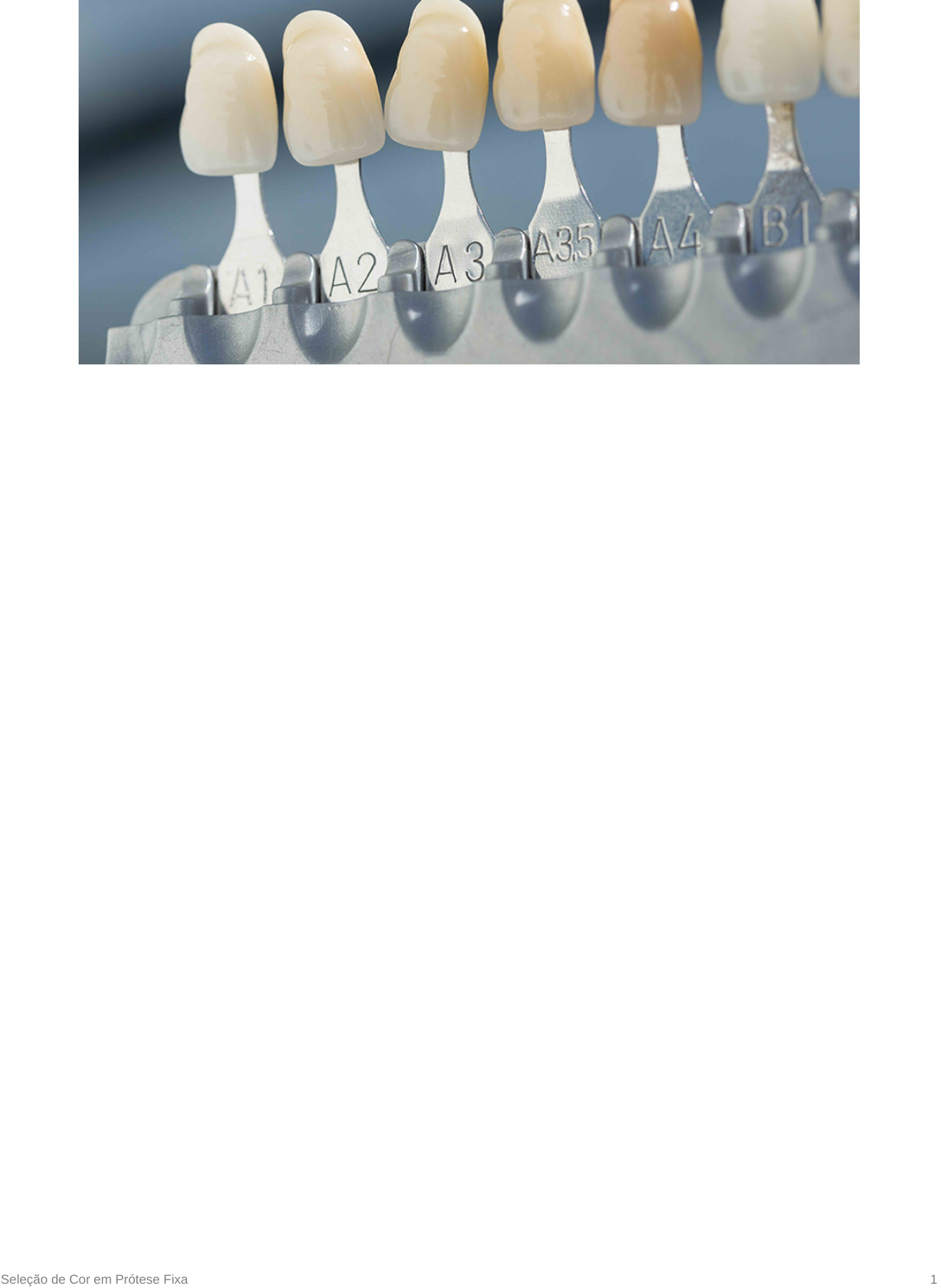 <p>Seleção de Cor em Prótese Fixa 1</p><p>Seleção de Cor em Prótese Fixa</p><p>Diferente a depender do que está sendo selecionado, se é prótese total, prótese fixa</p><p>dentística. Os princípios são os mesmos, mas a técnica se difere.</p><p>Dimensão da cor</p><p>→ Matiz</p><p>→ Croma ou Saturação</p><p>→ Valor ou Luminosidade</p><p>Seleção de Cor em Prótese Fixa 2</p><p>Matiz</p><p>A sensação pela qual percebemos os comprimentos de onda da luz refletida dos</p><p>objetos.</p><p>→ Nome da cor (azul, verde, amarelo, vermelho) todos os nomes das cores é o</p><p>matiz</p><p>A escala vital clássica:</p><p>Marrom: A</p><p>Amarelo: B</p><p>Cinza: C</p><p>Vermelho: D</p><p>A2 e A1 tem o mesmo matiz (mais voltada para o marrom)</p><p>Croma ou Saturação</p><p>A intensidade da cor (matiz), a quantidade de pigmentos que um matiz tem. Varia do</p><p>matiz (maior saturação) ao cinza (menor saturação).</p><p>Seleção de Cor em Prótese Fixa 3</p><p>Matiz A- marrom</p><p>→ Menor saturação A1</p><p>→ Maior saturação A4</p><p>(A1; A2; A3; A3,5; A4)</p><p>Valor ou luminosidade</p><p>Dispersão do branco ao preto - Cores claras/escuras</p><p>Menor valor: escuro (preto/acinzentado)</p><p>Maior valor: claro (próximas ao branco)</p><p>Escala clássica não tem indicação de valor, não é que não existe a diferença de</p><p>valor, só não existe uma indicação como o A indica o matiz e o número indica o</p><p>croma. Quando remove todo matiz e croma é possível perceber nuances da</p><p>diferença de valor entre as cores.</p><p>Quanto maior o croma ⬆, menor o valor ⬇</p><p>Removendo toda a matiz e o croma (saturação), consegue-se observar o valor</p><p>Maior brilho (valor) A1</p><p>Menor brilho (valor) A4</p><p>O amarelo (matiz) será mais caramelo com o croma maior</p><p>O croma baixo dificulta observar o matiz e o croma alto é possível observar o</p><p>matiz</p><p>Influências na seleção de cor</p><p>O ambiente deve ser construído de cores neutras e sem filtro (gelo, bege, cinza,</p><p>azul, verde claro)</p><p>Recobrir a roupa do paciente com pano de campo de cor neutra</p><p>Remoção de excessos de maquiagem, principalmente batom</p><p>Discromatopsia (daltonismo) - presente em 8-9% dos homens e 0,5-0,9% das</p><p>mulheres</p><p>Seleção de Cor em Prótese Fixa 4</p><p>Mulheres x Homens: possuem células diferentes e as mulheres percebem mais a</p><p>variação dos tons e contraste, já os homens em ambiente de penumbra de baixa</p><p>luminosidade consegue perceber melhor as cores.</p><p>Nível de observação - paciente sentado de preferência ou na mesma linha de</p><p>observação (não muito inclinado, isso causa refração)</p><p>→ Distância da observação - Não colar a cara no paciente nem olhar a 5 metros de</p><p>distância (mais ou menos 50cm)</p><p>→ Velocidade da observação (5s no máximo)</p><p>Se não decidir em 5s descansar a visão em fundo azul claro</p><p>Dente de referência, deve ter cuidado com o dente escolhido, aspectos a se</p><p>considerar:</p><p>Presença de restaurações (se o dente ta com o valor baixo, ou alguma alteração</p><p>na restauração)</p><p>Tratamento endodôntico (não é porque tem tratamento endodôntico que tem</p><p>alteração de cor, mas deve-se ter mais atenção)</p><p>Mineralização (naturalmente o canino é mais amarelado, dente decíduo é mais</p><p>leitoso)</p><p>Quantidade de remanescente (problema gastrointestinal, tem uma exposição</p><p>maior de dentina, tudo a vai depender do seu remanescente)</p><p>Fonte de luz</p><p>Luz natural antes das 10h → maior influência do azul</p><p>Luz natural depois das 15h → maior influência do vermelho</p><p>Fatores temporais não controlados (Névoa, neblina, fumaça, tempo nublado)</p><p>Realizar diversas tomadas de cores ao longo do tratamento em horários</p><p>diferentes, já vai observando a cor do dente da paciente, e anotando.</p><p>Aproveitar o máximo de luz natural durante o dia</p><p>Não utilizar o refletor odontológico de luz halógena e incandescente, sempre</p><p>desliga o refletor</p><p>Seleção de Cor em Prótese Fixa 5</p><p>Luz artificial - qual a temperatura ideal? Deve-se priorizar a temperatura “luz do</p><p>dia” 5000-6000k (branco neutro)</p><p>Auxilio de câmara fotográfica (profissional, se possível), ajusta o flash</p><p>Quantidade de iluminação (projeto arquitetônico), sempre o do necessário para</p><p>o convívio social</p><p>Escalas de cor</p><p>Escala de resina para resina</p><p>Escala de cerâmica para cerâmica - Cada fabricante de cerâmica tem sua</p><p>escada própria</p><p>Idealmente a tomada de cor deveria ser realizada com a escala de cor do próprio</p><p>fabricante do sistema cerâmico a ser utilizado.</p><p>Escala Vitapan Classical</p><p>A, B, C e D → Matiz</p><p>Numeração → Croma</p><p>Não tem indicação de valor</p><p>Mas o fabricando informa que se quiser organizar por valor a sequência é:</p><p>B1;A1.B2;D2;A2;C1;C2;D3;A3;B3,5;B4;C3;A4;C4</p><p>Marrom: A1;A2;A3;A3,5;A4</p><p>Amarelo: B1,B2,B3,B4</p><p>Cinza: C1,C2,C3,C4</p><p>Vermelho: D2,D3,D4</p><p>⬆ Maior valor ⬇Menor valor</p><p>Seleção de Cor em Prótese Fixa 6</p><p>Como selecionar:</p><p>Não utilizar a escala inteira</p><p>Selecione o matiz, isolando um croma intermediário (A3;B3;C3;D3)</p><p>Identificar o croma mais próximo e após passar para o matiz (se é mais</p><p>saturado ou menos saturado)</p><p>Decidir primeiro o matiz, depois o croma</p><p>Observações:</p><p>Na dúvida entre o matiz A e B, o A é o mais comum</p><p>Na dúvida entre o croma, selecione o menor croma (A1 ou A2, sempre o A1,</p><p>pois no laboratório é mais fácil escurecer do que clarear)</p><p>Se houver dúvidas, ponderar o desejo do paciente (mostrar ao paciente, divide a</p><p>responsabilidade)</p><p>Fotografias do dente e escala de cor são excelentes auxiliares (por conta de</p><p>diferenças de monitor, sempre fotograf