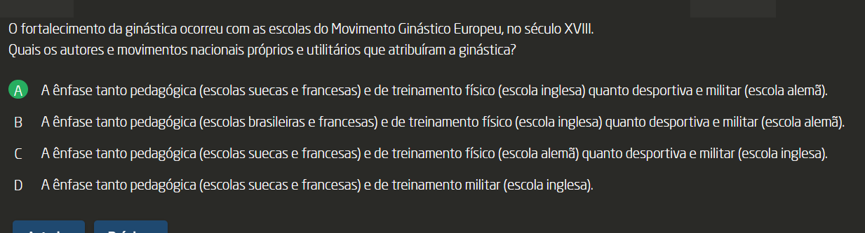 <p>fortalecimento da ginástica ocorreu com as escolas do Movimento Ginástico Europeu, no século XVIII. Quais os autores e movimentos nacionais próprios e utilitários que atribuíram a ginástica? A A ênfase tanto pedagógica (escolas suecas e francesas) e de treinamento físico (escola inglesa) quanto desportiva e militar (escola B A ênfase tanto pedagógica (escolas brasileiras e francesas) e de treinamento físico (escola inglesa) quanto desportiva e militar (escola C A ênfase tanto pedagógica (escolas suecas e francesas) e de treinamento físico (escola quanto desportiva e militar (escola inglesa). D A ênfase tanto pedagógica (escolas suecas e francesas) e de treinamento militar (escola inglesa).</p>