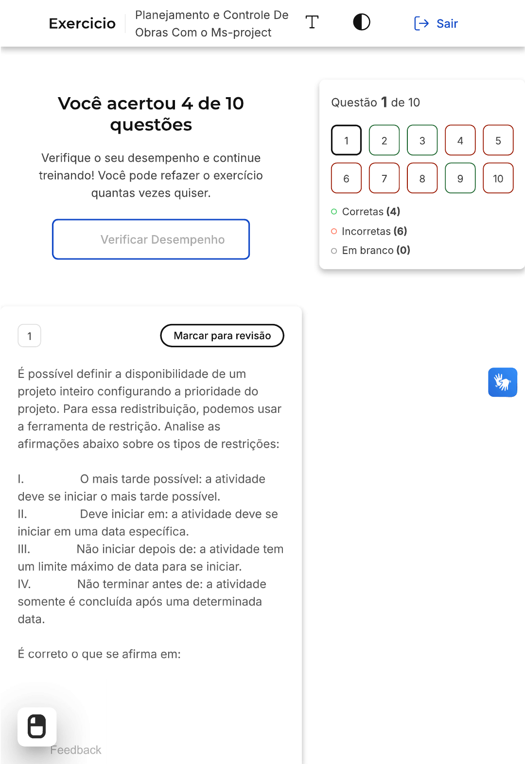 <p>Planejamento e Controle De Exercicio T Sair Obras Com o Ms-project Você acertou 4 de 10 Questão 1 de 10 questões 1 2 3 4 5 Verifique o seu desempenho e continue treinando! Você pode refazer o exercício 6 7 8 9 10 quantas vezes quiser. Corretas (4) Incorretas (6) Verificar Desempenho Em branco (0) 1 Marcar para revisão É possível definir a disponibilidade de um projeto inteiro configurando a prioridade do projeto. Para essa redistribuição, podemos usar a ferramenta de restrição. Analise as afirmações abaixo sobre os tipos de restrições: I. O mais tarde possível: a atividade deve se iniciar o mais tarde possível. II. Deve iniciar em: a atividade deve se iniciar em uma data específica. III. Não iniciar depois de: a atividade tem um limite máximo de data para se iniciar. IV. Não terminar antes de: a atividade somente é concluída após uma determinada data. É correto o que se afirma em: Feedback</p><p>A I, II, III e IV B Apenas I, e IV. C Apenas e III. D Apenas e IV. E Apenas III e IV. Resposta correta Parabéns, você selecionou a alternativa correta. Confira o gabarito comentado! Gabarito Comentado I. Correto. Essa restrição permite que a atividade comece o mais tarde possível, considerando as dependências e recursos disponíveis. II. Correto. Essa restrição define uma data específica para o início da atividade. III. Correto. Essa restrição define uma data limite para o início da atividade. A atividade não pode começar depois dessa data. IV. Correto. Essa restrição define uma data mínima para a conclusão da atividade. A atividade não pode ser concluída antes dessa data. Marcar para revisão</p><p>O atributo "Tipo de Tarefa" define o tipo de duração das tarefas no MS Project. Assinale a alternativa abaixo que contém apenas tipos de tarefas. Custo Fixo, Duração Fixa e Trabalho A Fixo. Custo Fixo, Trabalho Fixo e Unidades B Fixas. Custo Fixo, Duração Fixa e Unidades C Fixas. Duração Fixa, Trabalho Fixo e D Unidades Fixas. Custo Fixo, Duração Fixa, Trabalho E Fixo e Unidades Fixas. Resposta correta Parabéns, você selecionou a alternativa correta. Confira o gabarito comentado! Gabarito Comentado Os tipos de tarefas relacionados à duração são: duração fixa, trabalho fixo e unidades fixas. custo não é um tipo de tarefa e sim um atributo de um recurso. Marcar para revisão e</p><p>Para fazer um controle de maneira mais precisa, o MS Project tem três tipos de controle de agendamento de tarefas: Duração Fixa: Quando você alterar a unidade ou quantidade de trabalho da tarefa, a duração será mantida; Trabalho Fixo: Quando você alterar a unidade ou a duração da tarefa, a quantidade de trabalho será mantida; Unidades Fixas: Quando você altera a quantidade de trabalho ou duração da tarefa, a unidade será mantida. termo se refere: A à quantidade de trabalho. B aos recursos. C à duração da tarefa. D à atividade. E à verba. Resposta correta Parabéns, você selecionou a alternativa correta. Confira o gabarito comentado! Gabarito Comentado No contexto do MS Project, "unidades" geralmente se refere à alocação de e rsos para uma tarefa, ou seja, quantos rsos (pessoas, equipamentos, etc.)</p><p>estão alocados para executar uma determinada tarefa. 4 Marcar para revisão Para inserir recursos no MS Project, o método mais rápido é o modo 'Planilha de Recursos'. Para criar recursos na planilha você deve inserir uma série de informações necessárias sobre eles. Assinale a alternativa que contenha apenas essas informações. Unidades Máximas, Unidade do A Material e Unidades Fixas. Trabalho Fixo, Taxa Padrão e Custo B por Uso. Unidade do Material, Taxa de Hora C Extra e Calendário Base. D Duração Fixa, Grupo e Código. Trabalho Fixo, Duração Fixa e E Unidades Fixas. X Resposta incorreta Opa! A alternativa correta é a letra C. Confira o gabarito comentado! Gabarito Comentado e ades Fixas, Trabalho Fixo e Duração são tipos de tarefas relacionados à</p><p>duração. 5 Marcar para revisão gerenciamento de projetos desempenha um papel crucial na execução eficaz de iniciativas temporárias. Para garantir o sucesso de um projeto, é fundamental compreender os conceitos e processos envolvidos nessa disciplina. Nesse contexto, as seguintes afirmações são apresentadas para avaliar o conhecimento sobre tópicos relacionados ao gerenciamento de projetos. I. Um projeto é um esforço temporário empreendido para criar algo único e exclusivo. II. A declaração do escopo e a documentação dos requisitos são entradas do processo de criação da estrutura analítica do projeto, que inclui a subdivisão de entregas do projeto em componentes menores. III. processo de desenvolvimento do plano de gerenciamento de um projeto compreende a coleta de requisitos, a elaboração do termo de abertura do projeto, o registro das partes interessadas, além do fornecimento da declaração do escopo do projeto. É correto o que se afirma em: A Apenas e II. B I, e III. Apenas I.</p><p>D Apenas II. E Apenas III. X Resposta incorreta Opa! A alternativa correta é a letra A. Confira o gabarito comentado! Gabarito Comentado I. Correto. Essa é uma definição geralmente aceita de um projeto. Projetos são esforços temporários para alcançar um objetivo específico, e eles são únicos porque geralmente não são repetitivos. II. Correto. A estrutura analítica do projeto (EAP ou WBS, Work Breakdown Structure) envolve a subdivisão do escopo do projeto em componentes menores, e a declaração do escopo e a documentação dos requisitos são importantes entradas para esse processo. III. Incorreto. processo de desenvolvimento do plano de gerenciamento do projeto não inclui a coleta de requisitos, elaboração do termo de abertura do projeto e registro das partes interessadas. Essas atividades estão mais relacionadas ao início do projeto. O desenvolvimento do plano de gerenciamento do projeto envolve a definição de como o projeto se