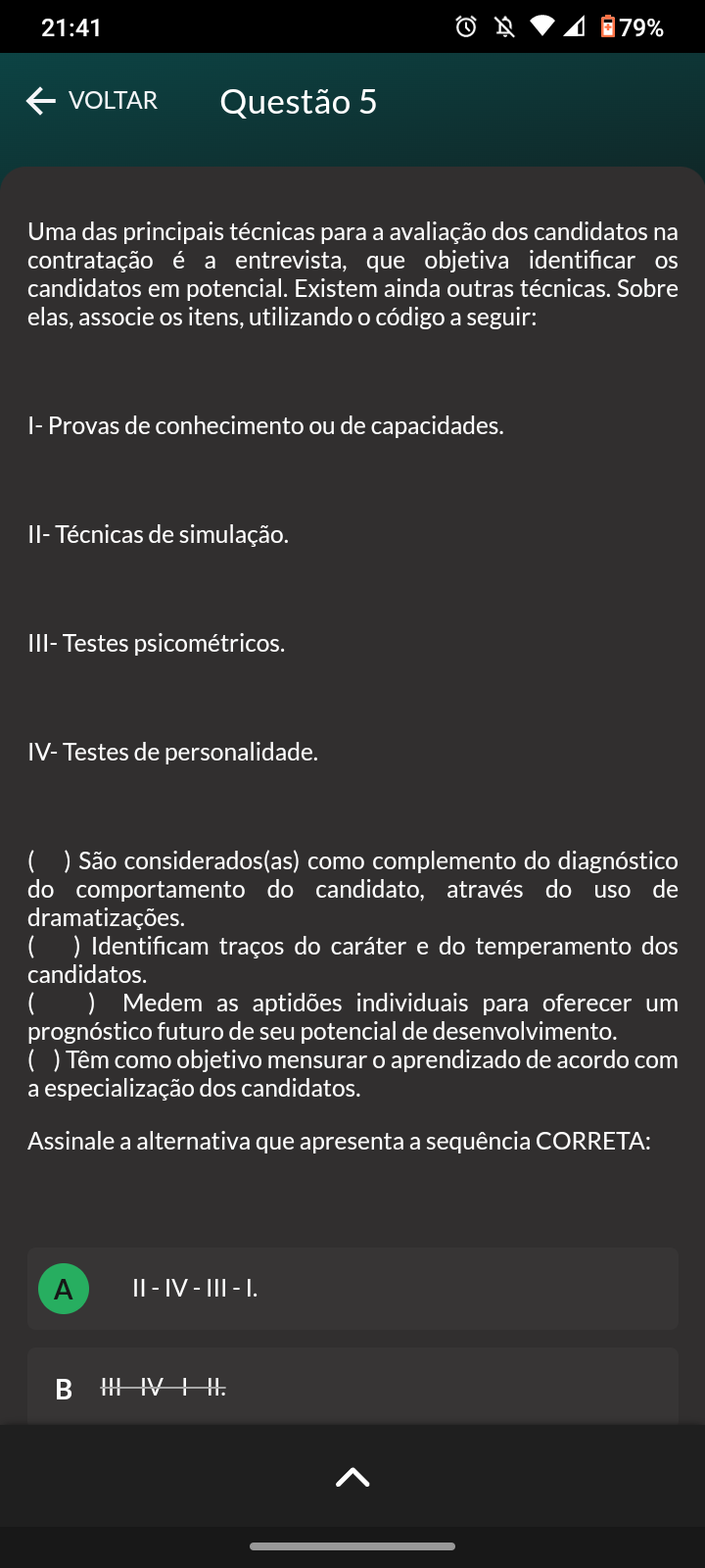 <p>21:41 79% VOLTAR Questão 5 Uma das principais técnicas para a avaliação dos candidatos na contratação é a entrevista, que objetiva identificar os candidatos em potencial. Existem ainda outras técnicas. Sobre elas, associe os itens, utilizando código a seguir: I- Provas de conhecimento ou de capacidades. II- Técnicas de simulação. III- Testes psicométricos. IV- Testes de personalidade. ( ) São considerados(as) como complemento do diagnóstico do comportamento do candidato, através do uso de dramatizações. ( ) Identificam traços do caráter e do temperamento dos candidatos. ( ) Medem as aptidões individuais para oferecer um prognóstico futuro de seu potencial de desenvolvimento. ( ) Têm como objetivo mensurar aprendizado de acordo com a especialização dos candidatos. Assinale a alternativa que apresenta a sequência CORRETA: A B III IV I</p>