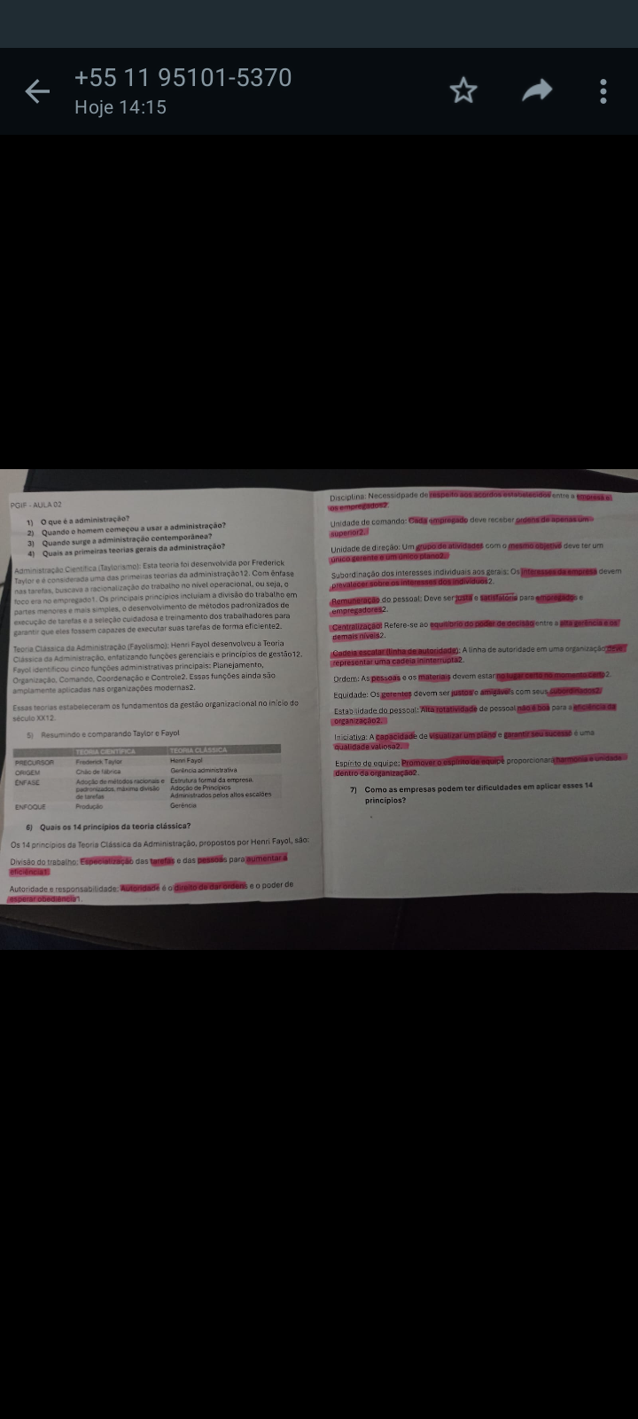 <p>+55 95101-5370 Hoje 14:15 PGIF 02 Disciplina Necessidpade de entre a 1) que administração? 2) Quando homem começou a administração? Unidade de Cada impregado deve receber 3) Quando surge a administração superior2. 4) Quais as primeiras teorias gerais da administração? Unidade de direção: Um com deve um Administração Cientifica (Taylorismo) Esta teoria desenvolvida por Frederick Taylor considerada uma das primeiras teorias da administração12 Com entase Subardinação dos interesses individuais aos Os devem nas buscava racionalização do trabalho no seja, foco era no Os principais principios incluiam divisão Remuneração do Deve para partes menores e mais desenvolvimento de métodos padronizados de execução de taretas seleção cuidadosa F treinamento dos trabalhadores para garantir eles capazes de executar suas tarefas de forma eficiente2 Refere-se a Teoria Classica da Administração Henri Fayol a da enfatizando funções gerenciais e de gestão12 A linha de autoridade em uma funções administrativas principais: Coordenação e Controle2 Essas funções ainda são e os devem estar amplamente aplicadas nas organizações modernas2 devem ser com seus Essas teorias estabeleceram fundamentos da gestão organizacional no do século XX12 Alta rotatividade de pessoal para 5 Resumindo comparando Taylor Fayol Iniciativa A de e uma TEORIA TEORIA CLASSICA PRECURSOR Frederick Taylor de equipe: Promover proporcionar ORIGEM ENFASE Estrutura formal da padronizados máxima divisio de Principios de Administrados 7) Como as empresas podem ter dificuldades em aplicar esses 14 ENFOQUE Gerência principios? Quais 14 principios da teoria clássica? Os 14 principios Teoria da propostos por Henri Fayol, são: Divisão do trabalho Especialização das das pessoas Autoridade Autoridade 6 e poder de</p>