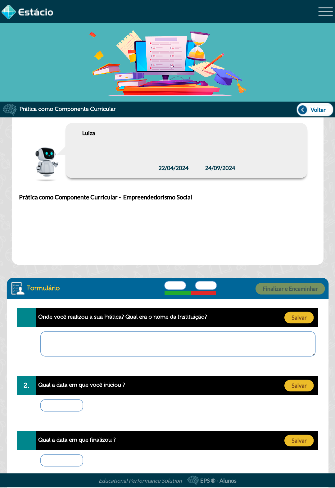 <p>Prática como Componente Curricular</p><p>Prática como Componente Curricular - Empreendedorismo Social</p><p>Seja bem-vindo(a) à atividade de prática! Aqui você fará o registro de suas práticas como componente curricular</p><p>(PCC).</p><p>Esse formulário servirá para que você relate as atividades práticas e vivenciais realizadas, com a �nalidade de</p><p>articulação entre teoria e prática.</p><p>Agora vamos entender como foi essa experiência. Vamos lá?</p><p>Tutorial:https://sway.of�ce.com/3tklPayyY7TJA6oe?ref=Link</p><p>Formulário 18 de 35</p><p>1. Onde você realizou a sua Prática? Qual era o nome da Instituição? Salvar</p><p>U.E.I. Pequenos Ananis</p><p>2. Qual a data em que você iniciou ? Salvar</p><p>02/04/2023</p><p>3. Qual a data em que finalizou ? Salvar</p><p>10/03/2024</p><p>Finalizar e Encaminhar</p><p>Olá Luiza,</p><p>Seja bem vindo! Aqui você fará o registro de suas Práticas como Componente Curricular. Você</p><p>escolheu um local e realizou a sua vivência, na qual mediou teoria e prática.</p><p>O prazo para este relatório é do dia 22/04/2024 ao dia 24/09/2024.</p><p>Voltar</p><p>Educational Performance Solution EPS ® - Alunos</p><p>https://aulapos.estacio.br/alunos/inicio.asp</p><p>https://aulapos.estacio.br/alunos/inicio.asp</p><p>https://sway.office.com/3tklPayyY7TJA6oe?ref=Link</p><p>javascript:alert('EPS - Educational Performance Solution\n\nM%C3%B3dulo do Aluno\n\nAxiom Consultoria em Tecnologia da Informa%C3%A7%C3%A3o Ltda.\n\nVers%C3%A3o 24.9.8')</p><p>javascript:alert('EPS - Educational Performance Solution\n\nM%C3%B3dulo do Aluno\n\nAxiom Consultoria em Tecnologia da Informa%C3%A7%C3%A3o Ltda.\n\nVers%C3%A3o 24.9.8')</p><p>javascript:alert('EPS - Educational Performance Solution\n\nM%C3%B3dulo do Aluno\n\nAxiom Consultoria em Tecnologia da Informa%C3%A7%C3%A3o Ltda.\n\nVers%C3%A3o 24.9.8')</p><p>javascript:alert('EPS - Educational Performance Solution\n\nM%C3%B3dulo do Aluno\n\nAxiom Consultoria em Tecnologia da Informa%C3%A7%C3%A3o Ltda.\n\nVers%C3%A3o 24.9.8')</p><p>javascript:alert('EPS - Educational Performance Solution\n\nM%C3%B3dulo do Aluno\n\nAxiom Consultoria em Tecnologia da Informa%C3%A7%C3%A3o Ltda.\n\nVers%C3%A3o 24.9.8')</p><p>javascript:alert('EPS - Educational Performance Solution\n\nM%C3%B3dulo do Aluno\n\nAxiom Consultoria em Tecnologia da Informa%C3%A7%C3%A3o Ltda.\n\nVers%C3%A3o 24.9.8')</p><p>javascript:alert('EPS - Educational Performance Solution\n\nM%C3%B3dulo do Aluno\n\nAxiom Consultoria em Tecnologia da Informa%C3%A7%C3%A3o Ltda.\n\nVers%C3%A3o 24.9.8')</p><p>javascript:alert('EPS - Educational Performance Solution\n\nM%C3%B3dulo do Aluno\n\nAxiom Consultoria em Tecnologia da Informa%C3%A7%C3%A3o Ltda.\n\nVers%C3%A3o 24.9.8')</p><p>javascript:alert('EPS - Educational Performance Solution\n\nM%C3%B3dulo do Aluno\n\nAxiom Consultoria em Tecnologia da Informa%C3%A7%C3%A3o Ltda.\n\nVers%C3%A3o 24.9.8')</p><p>javascript:alert('EPS - Educational Performance Solution\n\nM%C3%B3dulo do Aluno\n\nAxiom Consultoria em Tecnologia da Informa%C3%A7%C3%A3o Ltda.\n\nVers%C3%A3o 24.9.8')</p><p>javascript:alert('EPS - Educational Performance Solution\n\nM%C3%B3dulo do Aluno\n\nAxiom Consultoria em Tecnologia da Informa%C3%A7%C3%A3o Ltda.\n\nVers%C3%A3o 24.9.8')</p><p>javascript:alert('EPS - Educational Performance Solution\n\nM%C3%B3dulo do Aluno\n\nAxiom Consultoria em Tecnologia da Informa%C3%A7%C3%A3o Ltda.\n\nVers%C3%A3o 24.9.8')</p><p>javascript:alert('EPS - Educational Performance Solution\n\nM%C3%B3dulo do Aluno\n\nAxiom Consultoria em Tecnologia da Informa%C3%A7%C3%A3o Ltda.\n\nVers%C3%A3o 24.9.8')</p><p>javascript:alert('EPS - Educational Performance Solution\n\nM%C3%B3dulo do Aluno\n\nAxiom Consultoria em Tecnologia da Informa%C3%A7%C3%A3o Ltda.\n\nVers%C3%A3o 24.9.8')</p><p>javascript:alert('EPS - Educational Performance Solution\n\nM%C3%B3dulo do Aluno\n\nAxiom Consultoria em Tecnologia da Informa%C3%A7%C3%A3o Ltda.\n\nVers%C3%A3o 24.9.8')</p><p>javascript:alert('EPS - Educational Performance Solution\n\nM%C3%B3dulo do Aluno\n\nAxiom Consultoria em Tecnologia da Informa%C3%A7%C3%A3o Ltda.\n\nVers%C3%A3o 24.9.8')</p><p>javascript:alert('EPS - Educational Performance Solution\n\nM%C3%B3dulo do Aluno\n\nAxiom Consultoria em Tecnologia da Informa%C3%A7%C3%A3o Ltda.\n\nVers%C3%A3o 24.9.8')</p><p>javascript:alert('EPS - Educational Performance Solution\n\nM%C3%B3dulo do Aluno\n\nAxiom Consultoria em Tecnologia da Informa%C3%A7%C3%A3o Ltda.\n\nVers%C3%A3o 24.9.8')</p><p>javascript:alert('EPS - Educational Performance Solution\n\nM%C3%B3dulo do Aluno\n\nAxiom Consultoria em Tecnologia da Informa%C3%A7%C3%A3o Ltda.\n\nVers%C3%A3o 24.9.8')</p><p>javascript:alert('EPS - Educational Performance Solution\n\nM%C3%B3dulo do Aluno\n\nAxiom Consultoria em Tecnologia da Informa%C3%A7%C3%A3o Ltda.\n\nVers%C3%A3o 24.9.8')</p><p>javascript:alert('EPS - Educational Performance Solution\n\nM%C3%B3dulo do Aluno\n\nAxiom Consultoria em Tecnologia da Informa%C3%A7%C3%A3o Ltda.\n\nVers%C3%A3o 24.9.8')</p><p>javascript:alert('EPS - Educational Performance Solution\n\nM%C3%B3dulo do Aluno\n\nAxiom Consultoria em Tecnologia da Informa%C3%A7%C3%A3o Ltda.\n\nVers%C3%A3o 24.9.8')</p><p>javascript:alert('EPS - Educational Performance Solution\n\nM%C3%B3dulo do Aluno\n\nAxiom Consultoria em Tecnologia da Informa%C3%A7%C3%A3o Ltda.\n\nVers%C3%A3o 24.9.8')</p><p>javascript:alert('EPS - Educational Performance Solution\n\nM%C3%B3dulo do Aluno\n\nAxiom Consultoria em Tecnologia da Informa%C3%A7%C3%A3o Ltda.\n\nVers%C3%A3o 24.9.8')</p><p>javascript:alert('EPS - Educational Performance Solution\n\nM%C3%B3dulo do Aluno\n\nAxiom Consultoria em Tecnologia da Informa%C3%A7%C3%A3o Ltda.\n\nVers%C3%A3o 24.9.8')</p><p>javascript:alert('EPS - Educational Performance Solution\n\nM%C3%B3dulo do Aluno\n\nAxiom Consultoria em Tecnologia da Informa%C3%A7%C3%A3o Ltda.\n\nVers%C3%A3o 24.9.8')</p><p>javascript:alert('EPS - Educational Performance Solution\n\nM%C3