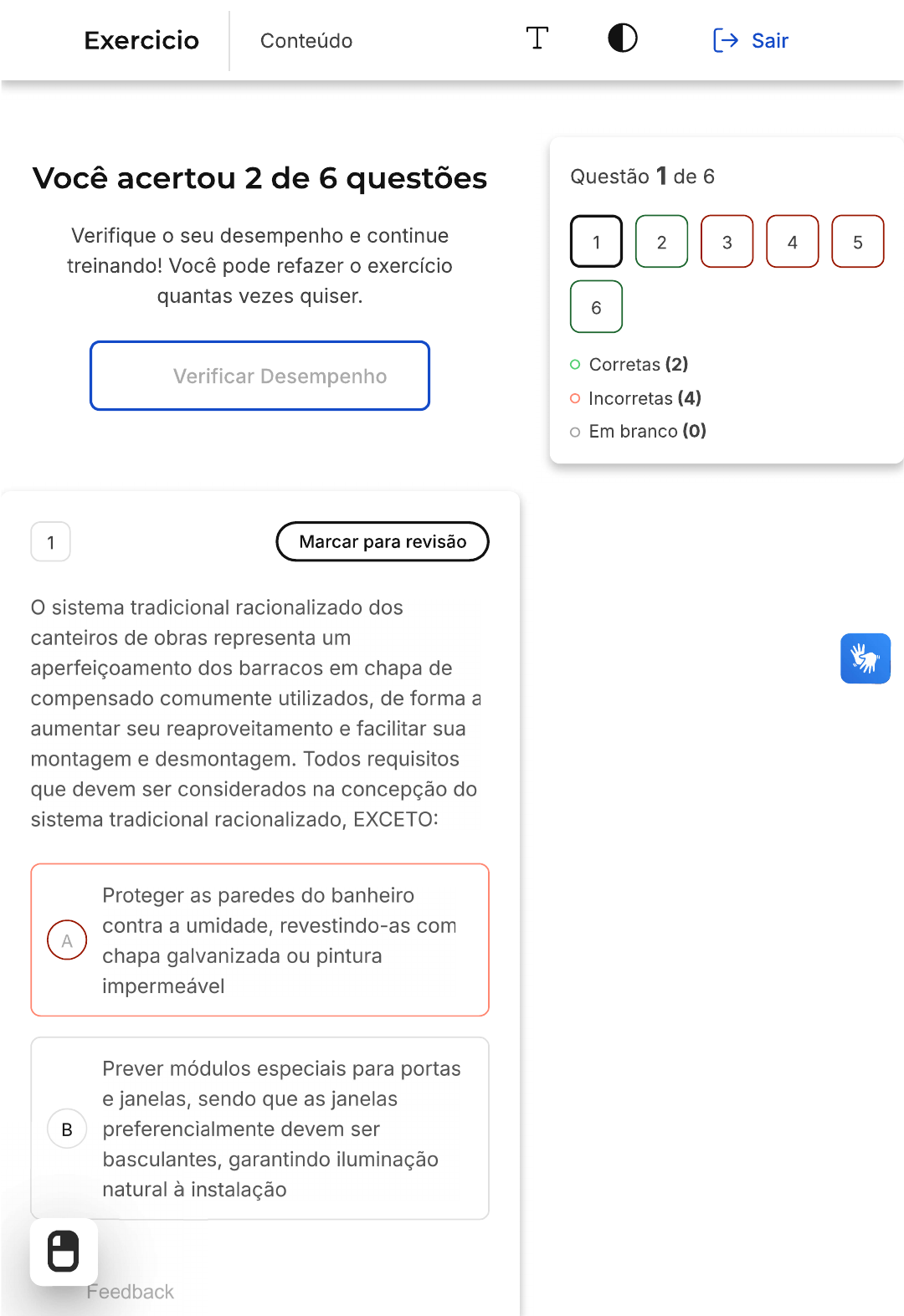 <p>Exercicio Conteúdo T Sair Você acertou 2 de 6 questões Questão 1 de 6 Verifique o seu desempenho e continue 1 2 3 4 5 treinando! Você pode refazer o exercício quantas vezes quiser. 6 Corretas (2) Verificar Desempenho Incorretas (4) Em branco (0) 1 Marcar para revisão O sistema tradicional racionalizado dos canteiros de obras representa um aperfeiçoamento dos barracos em chapa de compensado comumente utilizados, de forma a aumentar seu reaproveitamento e facilitar sua montagem e desmontagem. Todos requisitos que devem ser considerados na concepção do sistema tradicional racionalizado, EXCETO: Proteger as paredes do banheiro contra a umidade, revestindo-as com A chapa galvanizada ou pintura impermeável Prever módulos especiais para portas e janelas, sendo que as janelas B preferencialmente devem ser basculantes, garantindo iluminação natural à instalação Feedback</p><p>Prever a cobertura dos barracos C preferencialmente com telhas de fibrocimento Pintar as duas faces paredes dos D módulos Selar os topos das chapas de E compensado, contribuindo para o aumento da durabilidade da madeira X Resposta incorreta Opa! A alternativa correta é a letra C. Confira o gabarito comentado! Gabarito Comentado A boa prática recomenda fazer a cobertura dos barracos com telhas de zinco, que são mais resistentes ao impacto de materiais se comparadas às telhas de fibrocimento. Além de usar telhas de zinco, pode ser necessária a colocação de uma proteção adicional sobre os barracos, como, por exemplo, uma tela suspensa de arame de pequena abertura. 2 Marcar para revisão tipo, as características e a localização de instalações provisórias de esgoto sanitário em canteiros de obras de construções civis são de fundamental importância para as condições de e salubridade da obra. Nesse contexto,</p><p>quando o logradouro não possuir coletor público de esgotos, o construtor só poderá iniciar a obra após a A instalação do coletor público de esgotos. poderá dispor o esgoto sanitário sobre B a superfície do terreno, em área limítrofe do canteiro de obras. poderá dispor os esgotos em valas escavadas dentro do canteiro de C obras, desde que tais áreas não estejam sob a projeção da área a ser construída. deverá instalar fossa séptica e D sumidouro de acordo com prescrições estabelecidas em normas pertinentes. armazenará o esgoto em tanques de E concreto para posterior tratamento no próprio canteiro de obras. Resposta correta Parabéns, você selecionou a alternativa correta. Confira o gabarito comentado! Gabarito Comentado As instalações provisórias de esgoto sanitário em canteiros de obras de construções civis são de fundamental para as condições de higiene e ridade da obra, por isso, se o não possuir coletor público de</p><p>esgotos, o construtor deverá instalar fossa séptica e sumidouro de acordo com prescrições estabelecidas em normas pertinentes. 3 Marcar para revisão Existem diversas possibilidades para a escolha da tipologia das instalações provisórias dos canteiros. Todas são características do sistema racionalizado em chapas de compensado, EXCETO: São construídos com chapa de A compensado comumente utilizados É aperfeiçoamento dos barracos em B chapa de compensado comum São construídos com chapa de C compensado resinado de espessura maior ou igual a 14 mm As chapas estão ligadas entre si por D dobradiças para facilitar a montagem e desmontagem Podem ser construídos com chapas E metálicas galvanizadas com algum tipo de isolamento térmico às paredes. e</p><p>X Resposta incorreta Opa! A alternativa correta é a letra A. Confira o gabarito comentado! Gabarito Comentado sistema tradicional racionalizado representa um aperfeiçoamento dos barracos em chapa de compensado comumente utilizados, de forma a aumentar seu reaproveitamento e facilitar sua montagem e desmontagem. sistema racionalizado constitui-se de módulos de chapa de compensado resinado, com espessura mínima de 14mm, ligados entre si por qualquer dispositivo que facilite a montagem e a desmontagem, como parafusos, dobradiças ou encaixe. 4 Marcar para revisão Os canteiros de obras devem dispor obrigatoriamente de: A instalações sanitárias. B área de lazer. C ambulatório.</p><p>D alojamento. E lavanderia. X Resposta incorreta Opa! A alternativa correta é a letra A. Confira o gabarito comentado! Gabarito Comentado De acordo com a NR 18: 18.4.1 Os canteiros de obras devem dispor de: a) instalações sanitárias; b) vestiário; c) alojamento; d) local de refeições; e) cozinha, quando houver preparo de refeições; f) lavanderia; g) área de lazer; h) ambulatório, quando se tratar de frentes de trabalho com 50 ou mais trabalhadores. 18.4.1.1 cumprimento do disposto nas alíneas "c", "f" e "g" é obrigatório nos casos onde houver trabalhadores alojados. A alternativa A é a correta, pois de acordo com a NR 18, os canteiros de obras devem dispor obrigatoriamente de instalações sanitárias. Marcar para revisão</p><p>Existem muitos programas que podem ser implantados para garantir a organização dos canteiros de obras, por meio de treinamento, colocação de metas, avaliação de desempenho, a fim de conscientizar e estimular os trabalhadores para manter a obra limpa e organizada. Esses programas têm como base os princípios dos programas 5S, que visam criar nas organizações um ambiente propício a implantação de programas de qualidade, através do desenvolvimento de cinco práticas ou sensos nos indivíduos: descarte (seiri), ordem (seiton), limpeza (seiso), asseio (seiketsu) e disciplina (shitsuke). A prática que visa, tornar mais agradável o ambiente de trabalho, melhorar a imagem da empresa perante clientes e empregados e facilitar a manutenção dos equipamentos e ferramentas é denominada: A Descarte B Organização C Limpeza D Asseio E Disciplina X Resposta incorreta Opa! A alternativa correta é a letra C. Confira o gabarito comentado! ar
