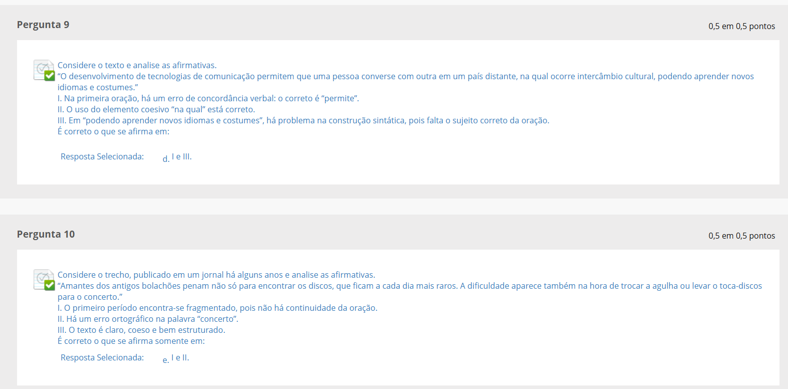 <p>Pergunta 9 0,5 em 0,5 pontos Considere texto e analise as afirmativas. "O desenvolvimento de tecnologias de comunicação permitem que uma pessoa converse com outra em um país distante, na qual ocorre intercâmbio cultural podendo novos idiomas e costumes." I. Na primeira oração, há um erro de concordância verbal: correto é "permite". II. o uso do elemento coesivo "na qual" está correto. III. Em "podendo aprender novos idiomas e costumes", há problema na construção sintática, pois falta sujeito correto da oração. É correto que se afirma em: Resposta Selecionada: d. e III. Pergunta 10 0,5 em 0,5 pontos Considere trecho, publicado em um jornal há alguns anos e analise as afirmativas. "Amantes dos antigos bolachões penam não só para encontrar os discos, que ficam a cada dia mais raros. A dificuldade aparece também na hora de trocar a agulha ou levar toca-discos para concerto." I. primeiro período encontra-se fragmentado, pois não há continuidade da oração. II. Há um erro ortográfico na palavra "concerto". III. o texto é claro, coeso e bem estruturado. É correto que se afirma somente em: Resposta Selecionada: e. e II.</p>