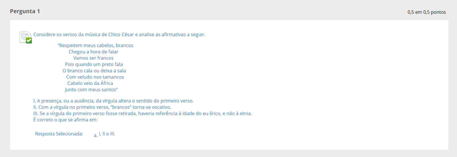 <p>Pergunta 1 0,5 em 0,5 pontos Considere os versos da música de Chico César e analise as afirmativas a seguir "Respeitem meus cabelos, brancos Chegou a hora de falar Vamos ser francos Pois quando um preto fala o branco cala ou deixa a sala Com veludo nos tamancos Cabelo veio da África Junto com meus santos" I. A presença, ou a ausência, da vírgula altera o sentido do primeiro verso. II. Com a vírgula no primeiro verso, "brancos" torna-se vocativo. III. Se a vírgula do primeiro verso fosse retirada, haveria referência à idade do eu-lírico, e não à etnia. É correto que se afirma em: Resposta Selecionada: a. I, II e III.</p>