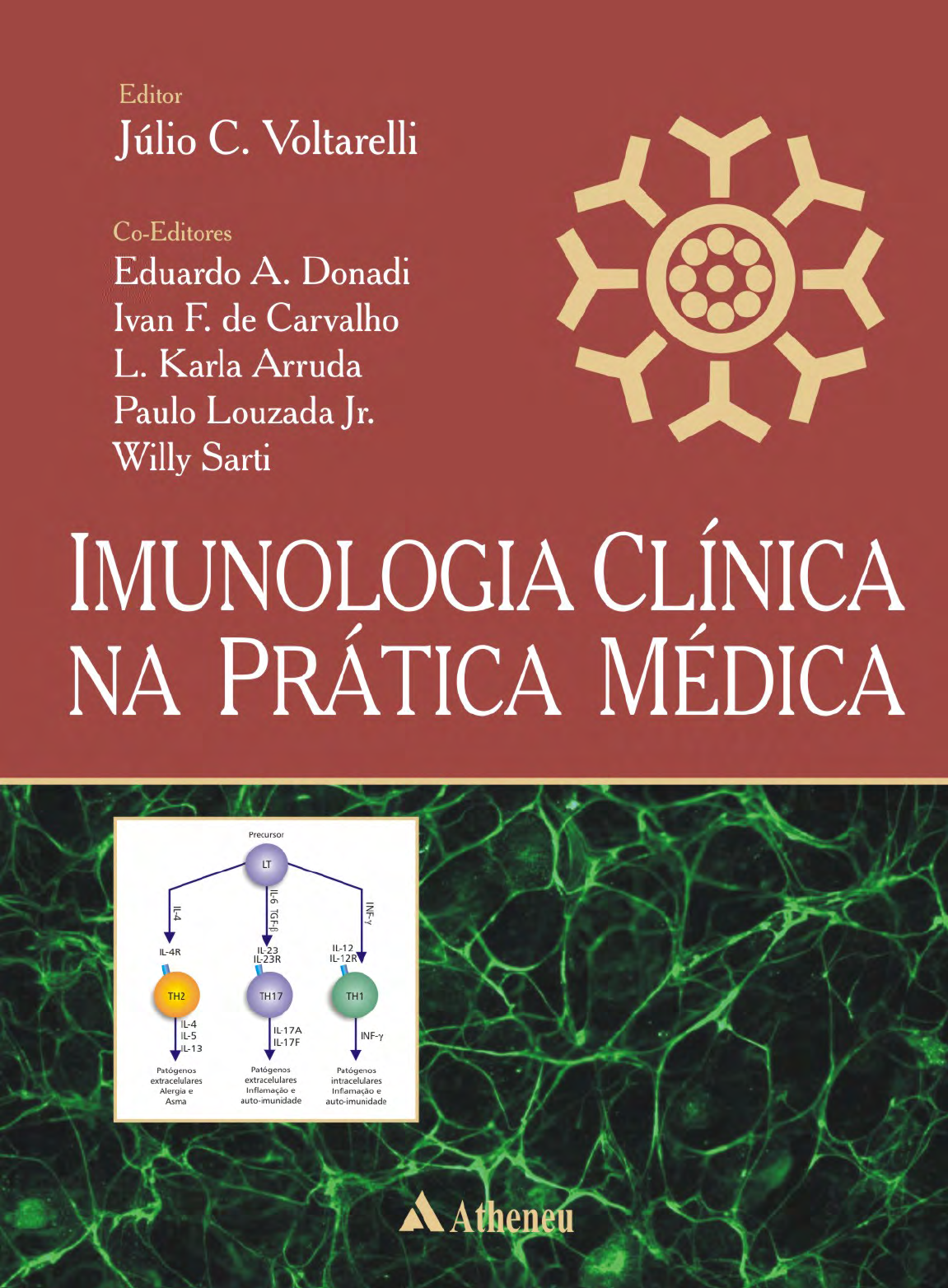 <p>Imunologia Clínica</p><p>na Prática Médica</p><p>EDITOR*</p><p>JÚLIO C. VOLTARELLI</p><p>CO-EDITORES*</p><p>EDUARDO A. DONADI</p><p>IVAN F. DE CARVALHO</p><p>L. KARLA ARRUDA</p><p>PAULO LOUZADA JR.</p><p>WILLY SARTI</p><p>*Divisão de Imunologia Clínica, Departamento</p><p>de Clínica Médica, Faculdade de Medicina</p><p>de Ribeirão Preto da Universidade de São Paulo</p><p>São Paulo • Rio de Janeiro • Ribeirão Preto • Belo Horizonte</p><p>Voltarelli00.indd 3Voltarelli00.indd 3 2/10/2008 06:08:382/10/2008 06:08:38</p><p>VOLTARELLI, J. C.; DONADI, E. A.; CARVALHO, I. F.; ARRUDA, L. K.; LOUZADA JR., P.; SARTI, W.</p><p>Imunologia Clínica na Prática Médica</p><p>©Direitos reservados à EDITORA ATHENEU — São Paulo, Rio de Janeiro, Ribeirão Preto, Belo Horizonte, 2009.</p><p>EDITORA ATHENEU São Paulo — Rua Jesuíno Pascoal, 30</p><p>Tels.: (11) 6858-8750</p><p>Fax: (11) 6858-8766</p><p>E-mail: atheneu@atheneu.com.br</p><p>Rio de Janeiro — Rua Bambina, 74</p><p>Tel.: (21) 3094-1295</p><p>Fax: (21) 3094-1284</p><p>E-mail: atheneu@atheneu.com.br</p><p>Ribeirão Preto — Rua Barão do Amazonas, 1.435</p><p>Tel.: (16) 3233-5400</p><p>Fax: (16) 3233-5402</p><p>E-mail: editoratheneu@netsite.com.br</p><p>Belo Horizonte — Rua Domingos Vieira, 319 — Conj. 1.104</p><p>PRODUÇÃO EDITORIAL: Fernando Palermo</p><p>Imunologia clínica na prática médica/editor: Júlio C. Voltarelli.</p><p>— São Paulo : Editora Atheneu, 2009.</p><p>Vários colaboradores.</p><p>Vários co-editores.</p><p>Bibliografi a.</p><p>ISBN 978-85-7379-920-0</p><p>1. Imunologia 2. Imunologia clínica 3. Prática médica I.</p><p>Voltarelli, Júlio C.</p><p>08-09693 CDD-616.079</p><p>Dados Internacionais de Catalogação na Publicação (CIP)</p><p>(Câmara Brasileira do Livro, SP, Brasil)</p><p>Índices para catálogo sistemático:</p><p>1. Imunologia clínica: Medicina 616.079</p><p>Voltarelli00.indd 4Voltarelli00.indd 4 2/10/2008 06:08:382/10/2008 06:08:38</p><p>Colaboradores</p><p>ALBERTO J. DUARTE</p><p>Departamento de Dermatologia, Faculdade de Medicina da Universidade de São Paulo</p><p>(FMUSP), São Paulo-SP</p><p>ALBERTO JULIUS ALVES WAINSTEIN</p><p>Instituto Alfa, Hospital das Clínicas da Universidade Federal de Minas Gerais</p><p>ALEXANDRE DE ALMEIDA</p><p>Departamento de Dermatologia, Faculdade de Medicina da Universidade de São Paulo</p><p>(FMUSP), São Paulo-SP</p><p>AMILTON ANTUNES BARREIRA</p><p>Divisão de Doenças Neuromusculares e Neuroimunologia, Departamento de Neurologia,</p><p>Psiquiatria e Psicologia Médica, Faculdade de Medicina de Ribeirão Preto da Universidade</p><p>de São Paulo.</p><p>ANNA CARLA GOLDBERG</p><p>Instituto de Química da Universidade de São Paulo</p><p>ANA LÍGIA BENDER</p><p>Departamento de Análises Clínicas e Toxicológicas (Disciplinas de Imunologia Clínica e</p><p>Parasitologia Clínica) da Pontifícia Universidade Católica do Rio Grande do Sul (PUC-RS)</p><p>ANA L.C. MARTINELLI</p><p>Divisão de Gastroenterologia, Departamento de Clínica Médica, Faculdade de Medicina de</p><p>Ribeirão Preto da Universidade de São Paulo</p><p>ANA MARIA F. ROSELINO</p><p>Divisão de Dermatologia, Departamento de Clínica Médica, Faculdade de Medicina de Ribeirão Preto</p><p>da Universidade de São Paulo</p><p>ANA PAULA FÁVARO TROMBONE</p><p>Programa de Pós-Doutorado, Departamento de Bioquímica e Imunologia, Faculdade de</p><p>Medicina de Ribeirão Preto da Universidade de São Paulo</p><p>Voltarelli00.indd 5Voltarelli00.indd 5 2/10/2008 06:08:392/10/2008 06:08:39</p><p>ANDERSON OMAR MOURÃO CINTRA DAMIÃO</p><p>Grupo de Intestino e Laboratório de Investigação Médica em Gastroenterologia (LIM-07) do</p><p>Hospital das Clínicas da Faculdade de Medicina da Universidade de São Paulo (FMUSP-SP)</p><p>ANDREA B. V. LOMONTE</p><p>Serviço de Reumatologia do Hospital Heliópolis, São Paulo-SP</p><p>ANDRÉ ZONETTI DE ARRUDA LEITE</p><p>Grupo de Intestino e Laboratório de Investigação Médica em Gastroenterologia (LIM-07) do</p><p>Hospital das Clínicas da Faculdade de Medicina da Universidade de São Paulo (FMUSP-SP)</p><p>ANETE SEVCIOVIC GRUMACH</p><p>Departamento de Dermatologia, Faculdade de Medicina da Universidade de São Paulo,</p><p>São Paulo-SP</p><p>ANGELINA M. B. BILATE</p><p>Instituto do Coração (INCOR), Faculdade de Medicina da Universidade de São Paulo</p><p>(FMUSP-SP)</p><p>AYTAN MIRANDA SIPAHI</p><p>Grupo de Intestino e Laboratório de Investigação Médica em Gastroenterologia (LIM-07) do</p><p>Hospital das Clínicas da Faculdade de Medicina da Universidade de São Paulo (FMUSP-SP)</p><p>CARLOS ALBERTO VON MÜHLEN</p><p>Disciplina de Reumatologia da Faculdade de Medicina da Pontifícia Universidade Católica</p><p>do Rio Grande do Sul e Metanalysis, Centro de Diagnósticos Médicos, Porto Alegre (RS)</p><p>CARLOS RIBEIRO MONTEIRO</p><p>Divisão de Radiologia e Diagnóstico por Imagem, Hospital das Clínicas da Faculdade de</p><p>Medicina de Ribeirão Preto da Universidade de São Paulo</p><p>CAROLINA SALLORENZO</p><p>Disciplina de Endocrinologia, Departamento de Medicina, Escola Paulista de Medicina,</p><p>Universidade Federal de São Paulo</p><p>CLAUDIA SAAD MAGALHÃES</p><p>Departamento de Pediatria – Faculdade de Medicina de Botucatu – Universidade Estadual</p><p>Paulista (UNESP)</p><p>CELSO H. F. PICADO</p><p>Departamento de Biomecânica, Medicina e Reabilitação do Aparelho Locomotor, Faculdade</p><p>de Medicina de Ribeirão Preto da Universidade de São Paulo</p><p>CRISTIANO A F ZERBINI</p><p>Serviço de Reumatologia do Hospital Heliópolis, São Paulo-SP</p><p>Voltarelli00.indd 6Voltarelli00.indd 6 2/10/2008 06:08:392/10/2008 06:08:39</p><p>DANIELA APARECIDA DE MORAES</p><p>Divisão de Imunologia Clínica, Faculdade de Medicina de Ribeirão Preto da Universidade</p><p>de São Paulo</p><p>DANNIELLE F. GODOI</p><p>Disciplina Saúde do Adulto I - Departamento de Clínica Médica - Centro de Ciências da</p><p>Saúde, Univ