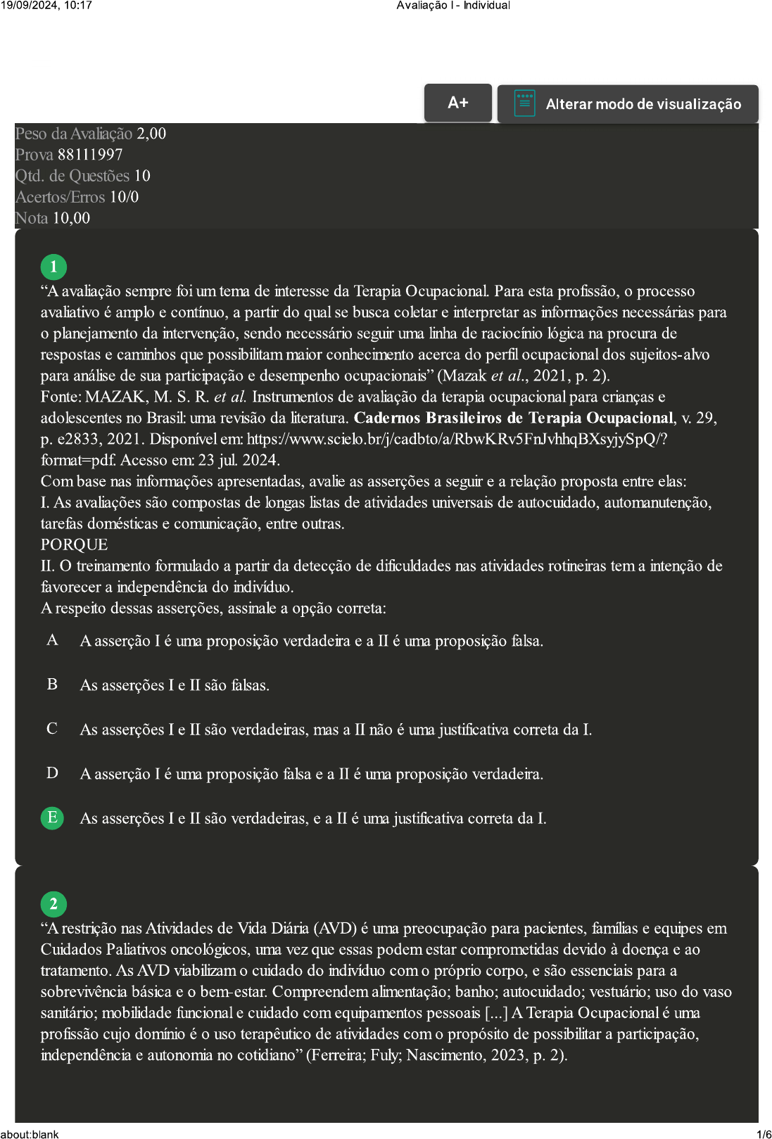 <p>19/09/2024, 10:17 Avaliação Individual A+ Alterar modo de visualização Peso da Avaliação 2,00 Prova 88111997 Qtd. de Questões 10 Acertos/Erros 10/0 Nota 10,00 1 "A avaliação sempre foi um tema de interesse da Terapia Ocupacional. Para esta profissão, processo avaliativo é amplo e contínuo, a partir do qual se busca coletar e interpretar as informações necessárias para planejamento da intervenção, sendo necessário seguir uma linha de raciocínio lógica na procura de respostas e caminhos que possibilitam maior conhecimento acerca do perfil ocupacional dos sujeitos-alvo para análise de sua participação e desempenho ocupacionais" (Mazak et al., 2021, p. 2). Fonte: MAZAK, M. S. R. et al. Instrumentos de avaliação da terapia ocupacional para crianças e adolescentes no Brasil: uma revisão da literatura. Cadernos Brasileiros de Terapia Ocupacional, V. 29, p. e2833, 2021. Disponível em: Acesso em: 23 jul. 2024. Com base nas informações apresentadas, avalie as asserções a seguir e a relação proposta entre elas: I. As avaliações são compostas de longas listas de atividades universais de autocuidado, automanutenção, tarefas domésticas e comunicação, entre PORQUE II. O treinamento formulado a partir da detecção de dificuldades nas atividades rotineiras tem a intenção de favorecer a independência do indivíduo. A respeito dessas asserções, assinale a opção correta: A A asserção I é uma proposição verdadeira e a II é uma proposição falsa. B As asserções I e II são falsas. C As asserções I e II são verdadeiras, mas a II não é uma justificativa correta da I. D A asserção I é uma proposição falsa e a II é uma proposição verdadeira. E As asserções I e II são verdadeiras, e a II é uma justificativa correta da I. 2 "A restrição nas Atividades de Vida Diária (AVD) é uma preocupação para pacientes, famílias e equipes em Cuidados Paliativos oncológicos, uma vez que essas podem estar comprometidas devido à doença e ao tratamento. As AVD viabilizam cuidado do indivíduo com próprio corpo, e são essenciais para a sobrevivência básica e bem-estar. Compreendem alimentação; banho; autocuidado; vestuário; uso do vaso sanitário; mobilidade funcional e cuidado com equipamentos pessoais [...] A Terapia Ocupacional é uma profissão cujo domínio é uso terapêutico de atividades com propósito de possibilitar a participação, independência e autonomia no cotidiano" (Ferreira; Fuly; Nascimento, 2023, p. 2). about:blank 1/6</p><p>19/09/2024, 10:17 Avaliação - Individual Fonte: FERREIRA, A. P. C.: FULY, P. dos S. C.; NASCIMENTO, J. S. Intervenções terapêuticas ocupacionais para as Atividades de Vida Diária em Cuidados Paliativos oncológicos: revisão integrativa. Research, Society and Development, V. 12, n. 1, p. e12212139497-e12212139497, 2023. Disponível em: 23 jul. 2024. De acordo com texto e nos critérios importantes ao adaptar uma atividade para atender às necessidades específicas do paciente/cliente, assinale a alternativa correta: A Dificuldade, desconsideração do significado da atividade, foco na execução do movimento. B Simplicidade, preservação do valor da atividade, foco no movimento. C Rigidez, minimização do valor da atividade, foco exclusivo no cliente. D Complexidade, exclusão do valor da atividade, foco no movimento. Adequação às necessidades, simplicidade, preservação do valor da foco na atividade em si, E não apenas no movimento. 3 "A Terapia Ocupacional possibilita ao indivíduo ressignificar seu viver através de um vasto leque de atividades utilizadas como recurso terapêutico. [...] A atividade traduz essencialmente a natureza humana, uma vez que homem mantém-se sempre em atividade, sendo capaz de agir sobre mundo, construindo e transformando sua realidade. Desse modo, a Terapia Ocupacional tem como objeto de estudo homem em atividade, considera a atividade humana como objeto parte do processo terapêutico, e os seus princípios teóricos buscam seu significado" (Lima; Lima Filho; Falcão, 2014, p. 24). Fonte: LIMA, T. L. B. LIMAFILHO, I. de A.; I. V. Possibilidades da narrativa como recurso terapêutico Revista Ocupación Humana, [s. V. 14, n. 2, p. 23-26, 2014. Disponível em: Acesso em: 22 jul. 2024. Com base no texto e nas aplicações dos recursos terapêuticos em terapia ocupacional, assinale a alternativa correta: O uso da expressão terapêutica pelos terapeutas ocupacionais abrange exclusivamente intervenções de A reabilitação fisica. B A escuta ativa, brincar ou construir algo são recursos terapêuticos. C O recurso terapêutico utiliza exclusivamente dispositivos tecnológicos para a intervenção. O recurso terapêutico tem como base a aplicação de medicamentos específicos para melhorar D desempenho ocupacional. E O recurso de expressão terapêutica é limitado a atividades específicas de diversão e lazer. 4 Considere caso hipotético a seguir: Paciente masculino de 45 anos, que recentemente sofreu um acidente de carro, está se recuperando de uma fratura no braço direito e de uma lesão no ombro esquerdo. O médico recomendou terapia ocupacional (TO) para ajudar na recuperação da funcionalidade e na retomada das atividades diárias. Durante a primeira avaliação com terapeuta ocupacional, foram identificadas suas limitações e capacidades para elaborar um plano de intervenção que promova a recuperação about:blank 2/6</p><p>19/09/2024, 10:17 Avaliação Individual Com base nas informações apresentadas, avalie as asserções a seguir e a relação proposta entre elas: I. Na fase de avaliação, os terapeutas ocupacionais coletam informações completas sobre diferentes domínios, incluindo ocupações, fatores dos clientes e contexto/ambiente. PORQUE II. A avaliação fornece uma compreensão abrangente das necessidades e capacidades do paciente. A respeito dessas asserções, assinale a opção correta: A As asserções I e II são B A asserç