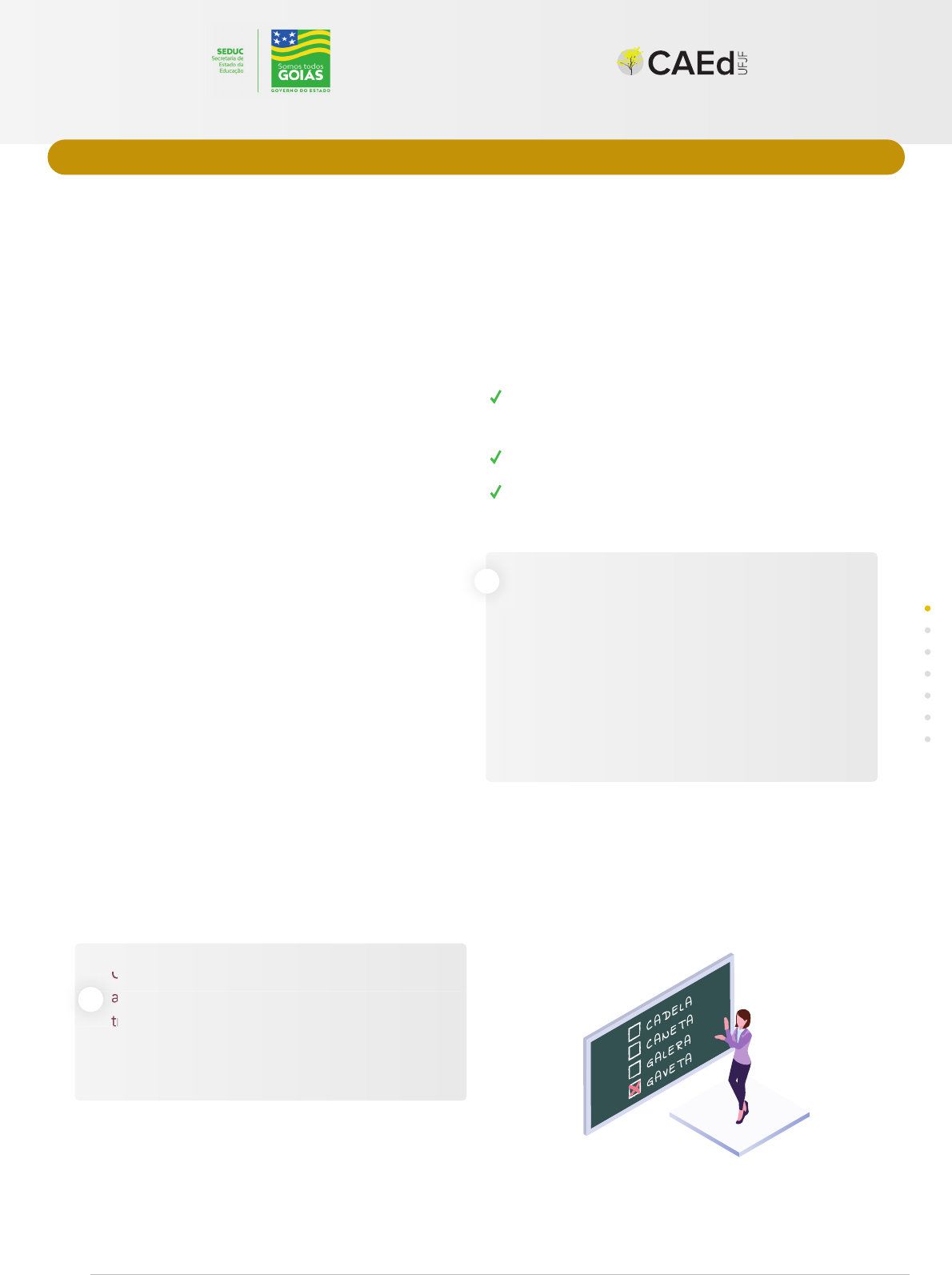 <p>AVALIAÇÃO DIAGNÓSTICA DE GOIÁS - 2º E 3º ANO EF</p><p>FOLHA DE ORIENTAÇÕES PARA A APLICAÇÃO</p><p>Atenção Professor Aplicador, ao receber os instrumentos</p><p>de aplicação lembre-se de:</p><p>1. Conferir se os Cadernos de Teste recebidos</p><p>correspondem à etapa da turma avaliada.</p><p>2. Verificar se o quantitativo de Cadernos de Teste</p><p>recebidos são suficientes para atender os alunos</p><p>presentes para a avaliação na sua turma.</p><p>3. Informar aos estudantes que:</p><p>P eles devem desligar os celulares e outros</p><p>aparelhos eletrônicos e mantê-los desligados até</p><p>o fi nal da aplicação;</p><p>P eles devem deixar sobre a carteira apenas lápis e</p><p>borracha;</p><p>P eles não poderão ausentar-se defi nitivamente da</p><p>sala de aula durante a aplicação (exceto em casos</p><p>extremos);</p><p>P nenhuma pergunta sobre o conteúdo do teste</p><p>poderá ser respondida por você;</p><p>P a atividade terá a duração de até 2 horas, mas</p><p>eles não precisam se preocupar com o tempo,</p><p>pois vocês passarão cada questão juntos;</p><p>P durante a distribuição dos testes, eles devem</p><p>aguardar para que todos iniciem a aplicação</p><p>juntos.</p><p>Os estudantes do 2º e 3º ano do EF deverão marcar</p><p>as respostas SOMENTE no Caderno de Teste. A</p><p>transcrição das respostas do Caderno de Teste</p><p>para o Cartão de Respostas será realizada pelo</p><p>Professor Aplicador.</p><p>4. Distribuir os Cadernos de Teste para os estudantes.</p><p>5. Orientar os estudantes a:</p><p>□ escrever o nome completo e a data de nascimento</p><p>deles na capa do Caderno de Teste;</p><p>□ marcar as respostas somente no Caderno de Teste;</p><p>□ selecionar apenas uma alternativa para cada questão,</p><p>pois há apenas uma resposta correta;</p><p>Os estudantes deverão utilizar lápis e borracha</p><p>para realizar o teste e devem ser orientados que</p><p>apenas uma alternativa terá validade para fins de</p><p>correção. Portanto, caso precisem apagar alguma</p><p>marcação que não seja a definitiva, isso deverá</p><p>ser feito com cuidado, para não causar rasuras ou</p><p>dúvidas no momento de realizar o lançamento das</p><p>respostas do caderno para a plataforma.</p><p>6. Solicitar que os estudantes abram o Caderno de Teste</p><p>na página onde está a questão exemplo.</p><p>7. Escrever no quadro o modelo correto de marcação no</p><p>Caderno de Teste, ou seja, o “X” deve ficar dentro da</p><p>quadrícula, como no exemplo a seguir.</p><p>8. Aplicar a questão exemplo e solicitar aos estudantes</p><p>que marquem um “X” na resposta escolhida.</p><p>Os estudantes do 2º e 3º ano do EF deverão marcar</p><p>as respostas SOMENTE no Caderno de Teste. Aas respostas SOMENTE no Caderno de Teste. A</p><p>transcrição das respostas do Caderno de Teste</p><p>1FOLHA DE ORIENTAÇÕES</p><p>9. Certificar-se de que todos entenderam como</p><p>marcar o “X” na resposta escolhida, circulando entre</p><p>as carteiras.</p><p>10. Aplicar a questão exemplo novamente para os</p><p>estudantes que errarem o modo de marcar.</p><p>11. Iniciar a aplicação do teste. Somente a partir desse</p><p>momento o tempo de duração da aplicação deve</p><p>ser considerado.</p><p>12. Registrar na Ata de Sala o horário de início da aplicação.</p><p>13. Conduzir a aplicação do teste, tendo como guia as</p><p>orientações do Caderno do Aplicador.</p><p>No Caderno do Aplicador, haverá um símbolo de um</p><p>megafone. Toda a vez que ele aparecer, você deverá ler,</p><p>em voz alta, a frase que o segue para os estudantes.</p><p>Veja um exemplo:</p><p>EXEMPLO</p><p>Vamos fazer juntos um exemplo de uma atividade.</p><p>Aplicador, ler SOMENTE a(s) informação(ões) que apresenta(m) o desenho de um megafone .</p><p>Não dizer o nome</p><p>CADELA</p><p>Não deve ser lido.</p><p>CANETA</p><p>GALERA</p><p>GAVETA</p><p>14. Ler cada questão e aguardar um tempo até que todos</p><p>os estudantes respondam. Terminado esse tempo,</p><p>avisar aos estudantes que vocês passarão para a</p><p>próxima questão. Repetir a leitura das informações</p><p>de cada questão, no máximo, uma vez. Seguir esse</p><p>procedimento durante toda a aplicação do teste.</p><p>Após a aplicação de cada questão do teste, antes de</p><p>iniciar a próxima, circular pela sala para verificar se os</p><p>estudantes estão efetuando as marcações conforme as</p><p>orientações dadas.</p><p>No verso da capa do Caderno do Aplicador,</p><p>você encontrará as orientações para conduzir a</p><p>aplicação dos itens.</p><p>15. Registrar o horário de término da aplicação na Ata</p><p>de Sala.</p><p>16. Recolher todos os Cartões de Respostas e os Cadernos</p><p>de Teste.</p><p>APÓS A APLICAÇÃO DO TESTE</p><p>1. Informar todos os dados solicitados na Ata de Sala.</p><p>2. Transcrever as respostas assinaladas pelo estudante</p><p>no Caderno de Teste para o respectivo Cartão de</p><p>Respostas, utilizando caneta esferográfica de tinta</p><p>azul ou preta.</p><p>Se o estudante:</p><p>□ deixar uma questão sem resposta, deixe a respectiva</p><p>questão sem marcação no Cartão de Respostas;</p><p>□ marcar mais de uma resposta, transcreva todas as</p><p>respostas marcadas.</p><p>3. Após a transcrição, acessar a plataforma, seguindo</p><p>as orientações contidas no tutorial, para realizar o</p><p>lançamento das respostas dos estudantes.</p><p>4. Devolver todos os materiais ao Diretor Escolar.</p><p>Agradecemos a sua participação!</p><p>FOLHA DE ORIENTAÇÕES 2</p>