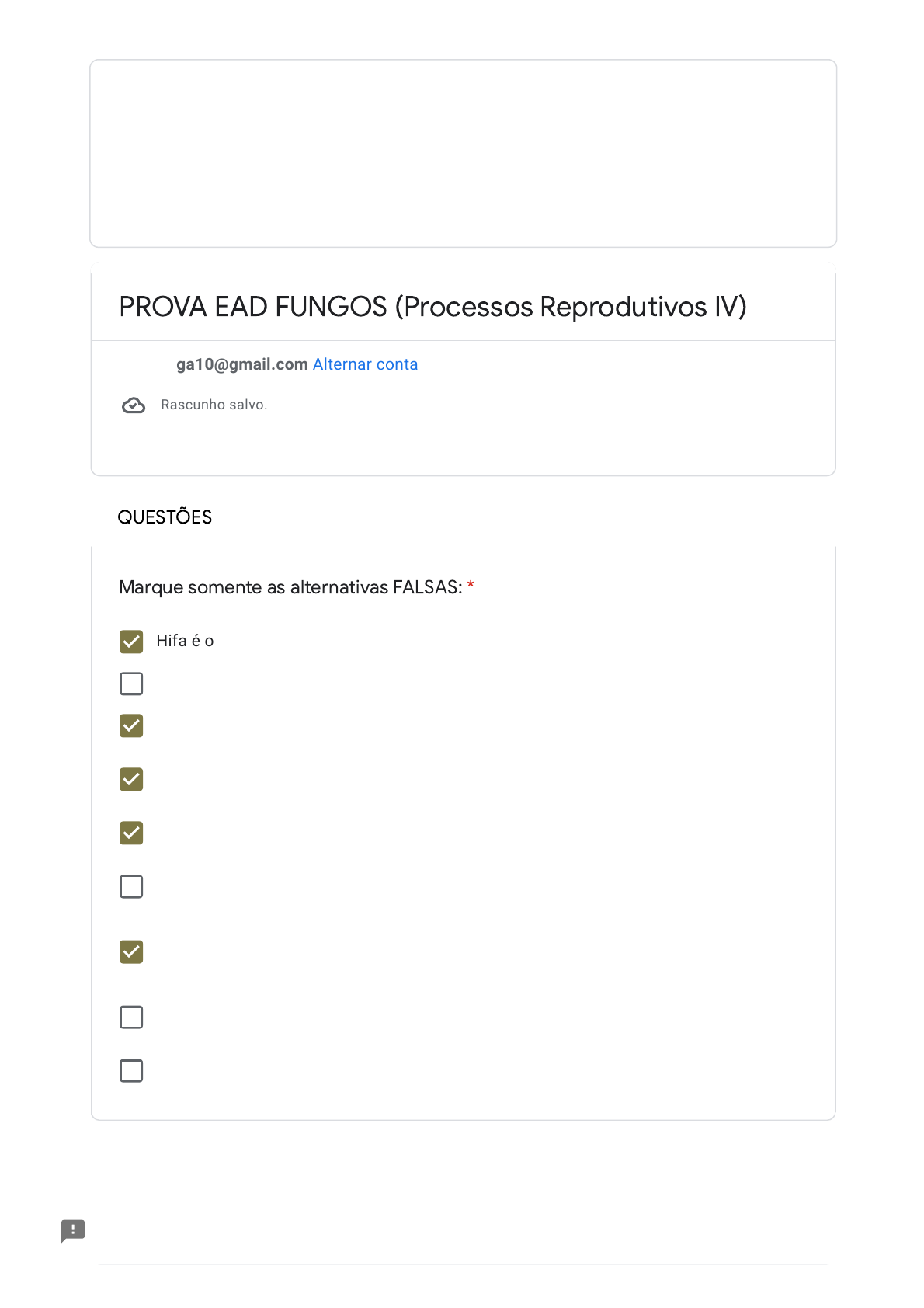 <p>25/06/2022 11:38 PROVA EAD FUNGOS (Processos Reprodutivos IV)</p><p>https://docs.google.com/forms/d/e/1FAIpQLSdWETHHt-aasvgoFhL7pzjJk_DtH4yWl1YeG3ukts2pp1_j7Q/formResponse 1/6</p><p>QUESTÕES</p><p>Hifa é o nome dado ao conjunto de células fúngicas</p><p>Fungos nutrem-se por absorção, digerindo os nutrientes no meio extracelular</p><p>Os fungos obtém nutrientes da natureza atuando somente como decompositores</p><p>Semelhantemente às bactérias, os fungos possuem parede celular constituída de</p><p>peptidoglicano</p><p>Os fungos possuem na sua membrana um lipídio chamado de colesterol.</p><p>A reprodução assexuada é modo mais rápido e mais comum de reprodução dos</p><p>fungos.</p><p>Os fungos que realizam apenas reprodução assexuada não possuem a capacidade de</p><p>se variar geneticamente</p><p>Chytridiomycota, Zygomycota, Ascomycota e Basidiomycota são filos que</p><p>apresentam ciclos de reprodução sexuado.</p><p>Micélio é o grupamento de hifas, que pode ser visualizado macroscopicamente.</p><p>PROVA EAD FUNGOS (Processos Reprodutivos IV)</p><p>re.biologa10@gmail.com Alternar conta</p><p>Rascunho salvo.</p><p>*Obrigatório</p><p>Marque somente as alternativas FALSAS: *</p><p>https://accounts.google.com/AccountChooser?continue=https://docs.google.com/forms/d/e/1FAIpQLSdWETHHt-aasvgoFhL7pzjJk_DtH4yWl1YeG3ukts2pp1_j7Q/formResponse&service=wise</p><p>25/06/2022 11:38 PROVA EAD FUNGOS (Processos Reprodutivos IV)</p><p>https://docs.google.com/forms/d/e/1FAIpQLSdWETHHt-aasvgoFhL7pzjJk_DtH4yWl1YeG3ukts2pp1_j7Q/formResponse 2/6</p><p>Celulose e amido</p><p>Quitina e ergosterol</p><p>Amido e quitina</p><p>Celulose e ergosterol</p><p>Amido e ergosterol</p><p>Polímeros da célula fúngica comumente utilizados como alvos antifúngicos: *</p><p>25/06/2022 11:38 PROVA EAD FUNGOS (Processos Reprodutivos IV)</p><p>https://docs.google.com/forms/d/e/1FAIpQLSdWETHHt-aasvgoFhL7pzjJk_DtH4yWl1YeG3ukts2pp1_j7Q/formResponse 3/6</p><p>Correlacione as características com os respectivos Filos: *</p><p>Chytridiomycota Zygomycota Ascomycota Basidiomycota Deuteromycota</p><p>São</p><p>representados</p><p>pelos</p><p>cogumelos</p><p>Fungos que</p><p>não</p><p>manifestam</p><p>fase sexuada</p><p>Peritécio é um</p><p>tipo de</p><p>ascósporo</p><p>Alguns são</p><p>comestíveis</p><p>Se</p><p>reproduzem</p><p>por conídios</p><p>Possuem</p><p>esporângios</p><p>Tem esporos</p><p>flagelados</p><p>É o maior</p><p>grupo do</p><p>Reino Fungi</p><p>Maioria dos</p><p>indivíduos</p><p>vivem em</p><p>ambiente</p><p>aquático</p><p>Possuem a</p><p>maioria das</p><p>espécies</p><p>patogênicas</p><p>São</p><p>representados</p><p>pelos</p><p>cogumelos</p><p>Fungos que</p><p>não</p><p>manifestam</p><p>fase sexuada</p><p>Peritécio é um</p><p>tipo de</p><p>ascósporo</p><p>Alguns são</p><p>comestíveis</p><p>Se</p><p>reproduzem</p><p>por conídios</p><p>Possuem</p><p>esporângios</p><p>Tem esporos</p><p>flagelados</p><p>É o maior</p><p>grupo do</p><p>Reino Fungi</p><p>Maioria dos</p><p>indivíduos</p><p>vivem em</p><p>ambiente</p><p>aquático</p><p>Possuem a</p><p>maioria das</p><p>espécies</p><p>patogênicas</p><p>25/06/2022 11:38 PROVA EAD FUNGOS (Processos Reprodutivos IV)</p><p>https://docs.google.com/forms/d/e/1FAIpQLSdWETHHt-aasvgoFhL7pzjJk_DtH4yWl1YeG3ukts2pp1_j7Q/formResponse 4/6</p><p>Colesterol</p><p>Estradiol</p><p>Ribitol</p><p>Manitol</p><p>Ergosterol</p><p>São autotróficos e realizam fotossíntese</p><p>Realizam decomposição de matéria orgânica</p><p>São capazes de realizar fermentação</p><p>Suas células não possuem cloroplastos</p><p>Produzem antibióticos</p><p>Quitina</p><p>Peptidoglicano</p><p>Amido</p><p>Celulose</p><p>Lignina</p><p>Na membrana celular fúngica é encontrado um lipídeo chamado de: *</p><p>Assinale a opção que NÃO apresenta uma característica dos indivíduos</p><p>pertencentes ao Reino Fungi:</p><p>*</p><p>A parede celular fúngica é constituída de: *</p><p>25/06/2022 11:38 PROVA EAD FUNGOS (Processos Reprodutivos IV)</p><p>https://docs.google.com/forms/d/e/1FAIpQLSdWETHHt-aasvgoFhL7pzjJk_DtH4yWl1YeG3ukts2pp1_j7Q/formResponse 5/6</p><p>I e II</p><p>I e III</p><p>I, II e III</p><p>I, II e IV</p><p>III e IV</p><p>Transcrição</p><p>Fissão binária</p><p>Brotamento</p><p>Plasmogamia</p><p>Heterocariose</p><p>Página 2 de 2</p><p>Nunca envie senhas pelo Formulários Google.</p><p>Este formulário foi criado em Universidade Estadual de Santa Cruz. Denunciar abuso</p><p>Os fungos são seres vivos diversificados quanto à sua organização e relação</p><p>com outros seres. A respeito deles, são feitas as seguintes afirmações: I) A</p><p>maioria prioriza a reprodução sexuada. II) Suas hifas são constituídas</p><p>exclusivamente por celulose. III) Na relação com outros seres vivos nunca</p><p>exercem o papel de produtor. IV) Numa cadeia alimentar, eles podem ocupar os</p><p>níveis de produtor, consumidor e decompositor. DAS</p><p>AFIRMAÇÕES CITADAS, ESTÃO ERRADAS:</p><p>*</p><p>Fenômeno que promove variabilidade genética em fungos do grupo</p><p>Deuteromycota:</p><p>*</p><p>Voltar Enviar Limpar formulário</p><p>Formulários</p><p>https://docs.google.com/forms/u/0/d/e/1FAIpQLSdWETHHt-aasvgoFhL7pzjJk_DtH4yWl1YeG3ukts2pp1_j7Q/reportabuse?source=https://docs.google.com/forms/d/e/1FAIpQLSdWETHHt-aasvgoFhL7pzjJk_DtH4yWl1YeG3ukts2pp1_j7Q/viewform</p><p>https://www.google.com/forms/about/?utm_source=product&utm_medium=forms_logo&utm_campaign=forms</p><p>25/06/2022 11:38 PROVA EAD FUNGOS (Processos Reprodutivos IV)</p><p>https://docs.google.com/forms/d/e/1FAIpQLSdWETHHt-aasvgoFhL7pzjJk_DtH4yWl1YeG3ukts2pp1_j7Q/formResponse 6/6</p>