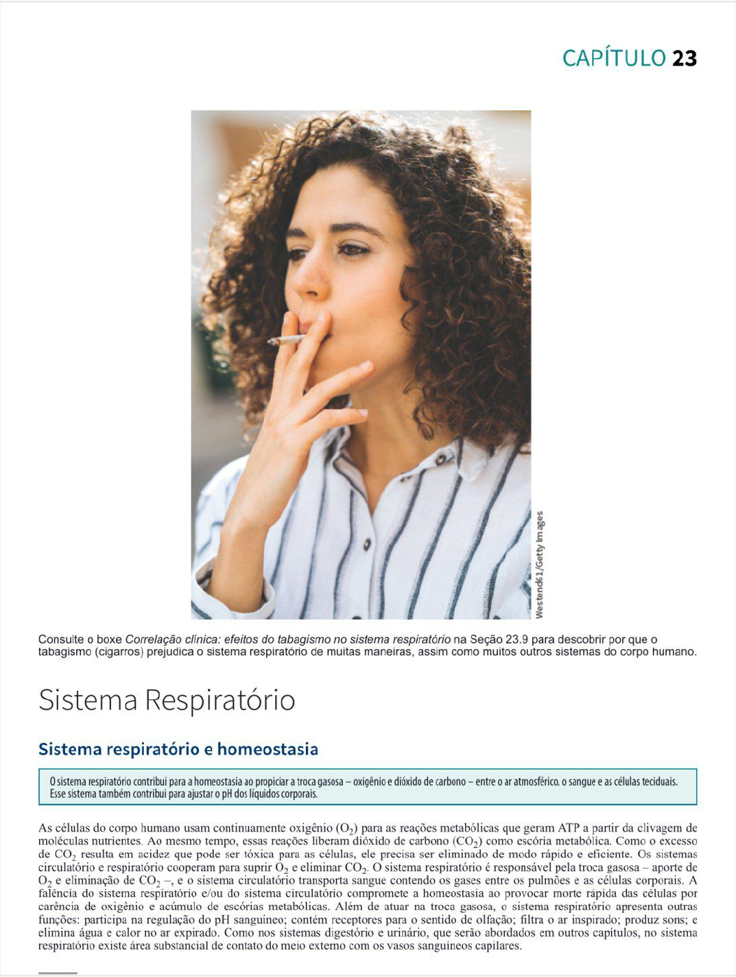<p>CAPÍTULO 23</p><p>Consulte o boxe Correlação clínica: efeitos do tabagismo no sistema respiratório na Seção 23.9 para descobrir por que o</p><p>tabagismo (cigarros) prejudica o sistema respiratório de muitas maneiras, assim como muitos outros sistemas do corpo humano.</p><p>Sistema Respiratório</p><p>Sistema respiratório e homeostasia</p><p>O sistema respiratório contribui para a homeostasia ao propiciar a troca gasosa - oxigênio e dióxido de carbono - entre o ar atmosférico, o sangue e as células teciduais.</p><p>Esse sistema também contribui para ajustar o pH dos líquidos corporais.</p><p>As células do corpo humano usam continuamente oxigênio (02) para as reações metabólicas que geram ATP a partir da cl ivagem de</p><p>moléculas nutrientes. Ao mesmo tempo, essas reações liberam dióxido de carbono (C02) como escória metabólica. Como o excesso</p><p>de C02 resulta em acidez que pode ser tóxica para as células, ele precisa ser eliminado de modo rápido e eficiente. Os sistemas</p><p>circulatório e respiratório cooperam para suprir 0 2 e eliminar C02. O sistema respiratório é responsável pela troca gasosa - aporte de</p><p>0 2 e eliminação de C02 - , e o sistema circulatório transporta sangue contendo os gases entre os pulmões e as células corporais. A</p><p>falência do sistema respiratório e/ou do sistema circulatório compromete a homeostasia ao provocar morte rápida das células por</p><p>carência de oxigênio e acúmulo de escórias metabólicas. Além de atuar na troca gasosa, o sistema respiratório apresenta outras</p><p>funções: participa na regulação do pH sanguíneo; contém receptores para o sentido de olfação; filtra o ar inspirado; produz sons; e</p><p>elimina água e calor no ar expirado. Como nos sistemas digestório e urinário, que serão abordados em outros capítulos, no sistema</p><p>respiratório existe área substancial de contato do meio externo com os vasos sanguíneos capilares.</p><p>~ Visão geral do sistema respiratório</p><p>OBJETIVOS</p><p>Discutir as etapas da respiração</p><p>Definir o sistema respiratório</p><p>Explicar como os órgãos do sistema respiratório são classificados do ponto de vista estrutural e funcional.</p><p>As etapas envolvidas na respiração</p><p>O processo de fornecimento de oxigênio (02) e retirada de dióxido de carbono (C02) do corpo é conhecido como respiração e</p><p>apresenta três etapas básicas (Figura 23.1):</p><p>O A ventilação pulmonar consiste em inspiração (inalação, influxo de ar) e expiração (expiração de ar, efluxo de ar); envolve a</p><p>troca de ar entre a atmosfera e os alvéolos pulmonares. A inspiração possibilita o aporte de 0 2 para os pulmões, ao passo que a</p><p>expiração possibilita a eliminação de C0 2 dos pulmões.</p><p>O A respiração externa (pulmonar) é a troca gasosa entre os alvéolos pulmonares e o sangue nos capilares pulmonares através da</p><p>membrana respiratória. Nesse processo, o sangue capilar pulmonar obtém 0 2 e perde C02.</p><p>C, A respiração interna (tecidua[) é a troca gasosa entre o sangue nos capilares sistêmicos e as células teciduais. Nessa etapa, o</p><p>sangue perde 0 2 e capta C02. No interior das células, as reações metaból icas que consomem 0 2 e produzem C02 durante a</p><p>produção de ATP são denominadas respiração celular (discutida no Capítulo 25).</p><p>Componentes do sistema respiratório</p><p>O sistema respiratório é formado por: nariz, faringe, laringe, traqueia, brõnquios e pulmões (Figura 23.2). As partes do sistema</p><p>respiratório podem ser classificadas de acordo com a estrutura ou a função. Do ponto de vista estrutural, o sistema respiratório</p><p>consiste em: ( !) parte superior, que inclui nariz, cavidade nasal, faringe e estruturas associadas; e (2) parte inferior, que inclui</p><p>laringe, traqueia, brônquios e pulmões. Do ponto de vista funcional, o sistema respiratório também tem duas partes: ( I) a zona de</p><p>condução (ou zona de transporte), constituida por vários tubos e cavidades interconectados, intrapulmonares e extrapulmonares, que</p><p>incluem nariz, cavidade nasal, fa ringe, laringe, traqueia, brônquios, bronquíolos e bronquíolos terminais. A função dessas estruturas é</p><p>filtrar, aquecer e umidificar o ar, além de o conduzir para os pulmões; e (2) a zona respiratória, formada por tubos e tecidos</p><p>intrapulmonares onde ocorre a troca gasosa. Essas estruturas incluem os bronquíolos respiratórios, duetos alveolares, sacos alveolares</p><p>e alvéolos pulmonares, que são os principais locais de troca gasosa entre o ar e o sangue.</p><p>■â@ij;t-fj■ As três etapas básicas envolvidas na respiração.</p><p>Durante a respiração, o corpo recebe oxigênio e</p><p>elimina C02•</p><p>C02 expirado O Ventilação ) r ;n,p;rado pulmona,</p><p>Alvéolos pulmonares \</p><p>C02 O</p><p>• , 2</p><p>, '</p><p>,' ' ,' , @ Respiração externa</p><p>, \ (pulmonar)</p><p>rr- C::::..:0~2~11mp011 aCllriUeasa."....:0::2L _._::</p><p>Circulação pulmonar</p><p>Circulação sistêmica</p><p>~ :-~n:--c. :a?ffifflffl~ crro~2--:.</p><p>Transporte</p><p>de02e</p><p>C02 pelo</p><p>sangue</p><p>\ ,'E) Respiração interna</p><p>'. : (tecidual)</p><p>1 ' 1 1</p><p>1 \</p><p>Molécula 'f '</p><p>nutriente+ 02 ~ C02 + HzO + ATP</p><p>Respiração celular</p><p>Células dos tecidos sistêmicos</p><p>? Quais são as diferenças entre a respiração externa e a respiração interna?</p><p>O ramo da medicina que trata do diagnóstico e do tratamento das doenças das orelhas, do nariz e da faringe/laringe é denominado</p><p>otorrinolaringologia (ORL).</p><p>Teste rápido</p><p>1. Quais são as três etapas básicas envolvidas na respiração?</p><p>2. Quais são os componentes do sistema respiratório?</p><p>3. Por que a parte respiratória é importante?</p><p>H@iht-fffj t:::struturas do sistema respiratório.</p><p>A parte superior 