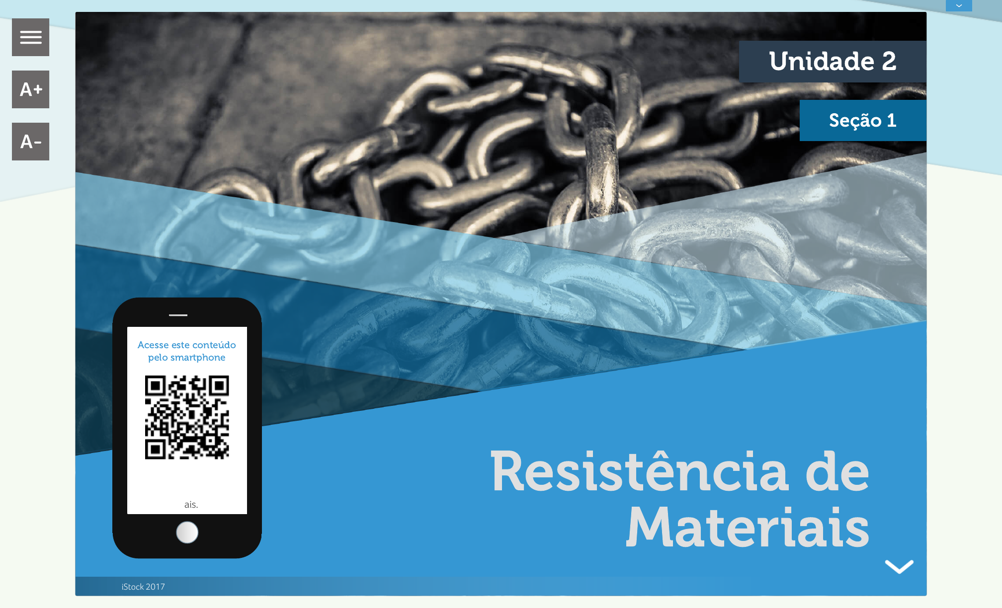 <p>Unidade 2</p><p>Seção 1</p><p>iStock 2017</p><p>Resistência de</p><p>Materiais</p><p>1. Acesse a loja de</p><p>aplicativos do seu</p><p>smartphone e baixe</p><p>um leitor de QR CODE.</p><p>2. Abra o leitor e</p><p>fotografe o código.</p><p>3. Você será</p><p>direcionado a este</p><p>conteúdo.</p><p>Bons estudos!</p><p>Acesse este conteúdo</p><p>pelo smartphone</p><p>O que é isso?</p><p>Clique no código e saiba</p><p>mais.</p><p>1</p><p>Webaula 1</p><p>Tensões de ruptura, coeficientes de</p><p>segurança e tensões admissíveis</p><p>Tensões últimas</p><p>A tensão última ( ), como o nome já diz, é a tensão obtida a partir da força última ( ) que</p><p>um material pode ter. Essa força é relativa à máxima tensão que atua em uma peça antes de</p><p>ela se romper e pode se expressar pela equação seguinte:</p><p>iStock 20172</p><p>As tensões últimas e forças últimas também</p><p>são apresentadas na literatura como tensões</p><p>de ruptura ( ) e forças de ruptura ( ou</p><p>). Para conhecer essas forças e tensões</p><p>para cada material, normalmente temos de</p><p>obtê-las por meio de ensaios em laboratórios</p><p>ou em campo, ensaios esses que têm como</p><p>objetivo simular as condições de carregamento</p><p>de utilização até a ruptura do material.</p><p>A importância dessa informação para os</p><p>projetistas é conseguir analisar o</p><p>comportamento das peças estruturais</p><p>até a ruptura e propor soluções que</p><p>terão tensões em utilização (ou tensões</p><p>atuantes) menores que as de ruptura.</p><p>3</p><p>Tensões admissíveis</p><p>As tensões utilizadas para o dimensionamento dos elementos estruturais são as tensões</p><p>admissíveis ( ). Ou seja, são, por questão de segurança, admissíveis por não exporem as</p><p>peças estruturais às condições de ruptura. Dessa forma, essas tensões têm um valor menor</p><p>que o da tensão de ruptura do material.</p><p>iStock 20174</p><p>De maneira análoga às tensões últimas, a tensão admissível é expressa pela equação seguinte,</p><p>em que é o carregamento admissível aplicado a uma área A.</p><p>5</p><p>Dimensionamento de uma barra</p><p>Fonte: Hibbeler (2010, p. 33).</p><p>Para o cálculo da área necessária da barra,</p><p>precisamos definir o carregamento que atenda</p><p>à necessidade do projeto. Com isso,</p><p>conhecendo a tensão admissível do material</p><p>utilizado, obtemos a área conforme a equação:</p><p>6</p><p>Outra situação em que um elemento estrutural</p><p>está submetido à tensão normal ocorre para</p><p>forças de compressão aplicadas em uma base.</p><p>Dimensionamento de uma chapa de uma base</p><p>Fonte: Hibbeler (2010, p. 34).</p><p>7</p><p>Conhecendo o esforço atuante V e a tensão</p><p>admissível do parafuso ao cisalhamento,</p><p>definimos sua área necessária, mostrada na</p><p>figura pela equação:</p><p>Dimensionamento de um parafuso</p><p>Fonte: Hibbeler (2010, p. 34).</p><p>8</p><p>A imagem seguinte mostra o diagrama de corpo livre do comprimento ( l ) da barra que fica</p><p>dentro do concreto (comprimento da ancoragem). Como há uma carga P de tração na barra, o</p><p>que mantém a peça engastada no concreto é a tensão de cisalhamento.</p><p>Dimensionamento de comprimento de ancoragem</p><p>Fonte: Hibbeler (2010, p. 34).</p><p>9</p><p>Android:</p><p>https://goo.gl/yAL2Mv</p><p>iPhone e iPad - IOS:</p><p>https://goo.gl/OFWqcq</p><p>Aqui você tem na palma da sua mão a biblioteca digital para</p><p>sua formação profissional.</p><p>Estude no celular, tablet ou PC em qualquer hora e lugar</p><p>sem pagar mais nada por isso.</p><p>Mais de 475 livros com interatividade, vídeos, animações e</p><p>jogos para você.</p><p>Você já conhece o Saber?</p><p>0:00</p><p>10</p><p>https://play.google.com/store/apps/details?id=br.com.kroton.saber</p><p>https://goo.gl/yAL2Mv</p><p>https://itunes.apple.com/br/app/saber/id1030414048?mt=8</p><p>https://itunes.apple.com/br/app/saber/id1030414048?mt=8</p><p>Bons estudos!</p><p>11</p>