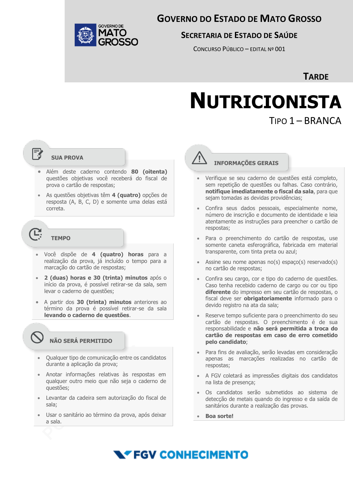<p>pcimarkpci MDAwMDowMDAwOjAwMDA6MDAwMDowMDAwOmZmZmY6YWE0ZjpiYjhh:V2VkLCAxOCBTZXAgMjAyNCAxOToyMTowOSAtMDMwMA==</p><p>www.pciconcursos.com.br</p><p>GOVERNO DO ESTADO DE MATO GROSSO</p><p>SECRETARIA DE ESTADO DE SAÚDE</p><p>CONCURSO PÚBLICO – EDITAL Nº 001</p><p>TARDE</p><p>NUTRICIONISTA</p><p>TIPO 1 – BRANCA</p><p> Além deste caderno contendo 80 (oitenta)</p><p>questões objetivas você receberá do fiscal de</p><p>prova o cartão de respostas;</p><p> As questões objetivas têm 4 (quatro) opções de</p><p>resposta (A, B, C, D) e somente uma delas está</p><p>correta.</p><p></p><p> Verifique se seu caderno de questões está completo,</p><p>sem repetição de questões ou falhas. Caso contrário,</p><p>notifique imediatamente o fiscal da sala, para que</p><p>sejam tomadas as devidas providências;</p><p> Confira seus dados pessoais, especialmente nome,</p><p>número de inscrição e documento de identidade e leia</p><p>atentamente as instruções para preencher o cartão de</p><p>respostas;</p><p> Para o preenchimento do cartão de respostas, use</p><p>somente caneta esferográfica, fabricada em material</p><p>transparente, com tinta preta ou azul;</p><p> Assine seu nome apenas no(s) espaço(s) reservado(s)</p><p>no cartão de respostas;</p><p> Confira seu cargo, cor e tipo do caderno de questões.</p><p>Caso tenha recebido caderno de cargo ou cor ou tipo</p><p>diferente do impresso em seu cartão de respostas, o</p><p>fiscal deve ser obrigatoriamente informado para o</p><p>devido registro na ata da sala;</p><p> Reserve tempo suficiente para o preenchimento do seu</p><p>cartão de respostas. O preenchimento é de sua</p><p>responsabilidade e não será permitida a troca do</p><p>cartão de respostas em caso de erro cometido</p><p>pelo candidato;</p><p> Para fins de avaliação, serão levadas em consideração</p><p>apenas as marcações realizadas no cartão de</p><p>respostas;</p><p> A FGV coletará as impressões digitais dos candidatos</p><p>na lista de presença;</p><p> Os candidatos serão submetidos ao sistema de</p><p>detecção de metais quando do ingresso e da saída de</p><p>sanitários durante a realização das provas.</p><p> Boa sorte!</p><p> Você dispõe de 4 (quatro) horas para a</p><p>realização da prova, já incluído o tempo para a</p><p>marcação do cartão de respostas;</p><p> 2 (duas) horas e 30 (trinta) minutos após o</p><p>início da prova, é possível retirar-se da sala, sem</p><p>levar o caderno de questões;</p><p> A partir dos 30 (trinta) minutos anteriores ao</p><p>término da prova é possível retirar-se da sala</p><p>levando o caderno de questões.</p><p> Qualquer tipo de comunicação entre os candidatos</p><p>durante a aplicação da prova;</p><p> Anotar informações relativas às respostas em</p><p>qualquer outro meio que não seja o caderno de</p><p>questões;</p><p> Levantar da cadeira sem autorização do fiscal de</p><p>sala;</p><p> Usar o sanitário ao término da prova, após deixar</p><p>a sala.</p><p>SUA PROVA</p><p>TEMPO</p><p>NÃO SERÁ PERMITIDO</p><p>INFORMAÇÕES GERAIS</p><p>pcimarkpci MDAwMDowMDAwOjAwMDA6MDAwMDowMDAwOmZmZmY6YWE0ZjpiYjhh:V2VkLCAxOCBTZXAgMjAyNCAxOToyMTowOSAtMDMwMA==</p><p>www.pciconcursos.com.br</p><p>pcimarkpci MDAwMDowMDAwOjAwMDA6MDAwMDowMDAwOmZmZmY6YWE0ZjpiYjhh:V2VkLCAxOCBTZXAgMjAyNCAxOToyMTowOSAtMDMwMA==</p><p>www.pciconcursos.com.br</p><p>SECRETARIA DE ESTADO DE SAÚDE DO MATO GROSSO FGV CONHECIMENTO</p><p>CNS325 - NUTRICIONISTA – TARDE TIPO BRANCA – PÁGINA 3</p><p>CONHECIMENTOS GERAIS</p><p>Língua Portuguesa</p><p>1</p><p>Leia o texto a seguir.</p><p>Os homens não estão cientes do calor que emana de seu coração,</p><p>embora ele dê vida e movimento a todas as outras partes do seu</p><p>corpo. [...] O mesmo se dá com a vaidade: ela é tão natural para o</p><p>homem que ele não a percebe. E, embora seja isso que dê, por</p><p>assim dizer, vida e movimento à maioria dos seus pensamentos e</p><p>desígnios, isso ocorre de um modo que é imperceptível para o</p><p>sujeito. [...] Os homens não percebem que é a vaidade que dá</p><p>ímpeto à maioria de suas ações.</p><p>A respeito do significado ou da estruturação desse fragmento,</p><p>assinale a afirmativa inadequada.</p><p>(A) O comentário inicial sobre o calor do coração serve de ponto</p><p>de comparação para o papel da vaidade.</p><p>(B) A semelhança entre o calor do coração e a vaidade é que</p><p>ambos são imperceptíveis para os homens.</p><p>(C) Ao indicar a vaidade como fonte da maioria das ações</p><p>humanas, o autor do texto as desvaloriza.</p><p>(D) O homem deve tornar a vaidade uma força consciente para o</p><p>seu progresso.</p><p>2</p><p>Leia o texto a seguir.</p><p>Em seu coração, os homens desejam ser estimados, mas eles</p><p>cuidadosamente ocultam esse desejo porque querem se passar por</p><p>virtuosos e porque o desejo de receber da virtude qualquer</p><p>vantagem além dela mesma não seria ser virtuoso, mas amar a</p><p>estima e o elogio – ou seja, ser vaidoso. Os homens são muito</p><p>vaidosos, mas não há nada que eles mais detestem do que serem</p><p>considerados vaidosos.</p><p>Assinale a afirmativa adequada ao seu significado ou à sua</p><p>estruturação.</p><p>(A) A discussão no texto opõe a essência (os homens serem</p><p>vaidosos) à aparência (quererem passar por virtuosos).</p><p>(B) A vaidade humana só não é vista como um defeito porque os</p><p>homens fazem questão de ocultá-la.</p><p>(C) Os homens têm o desejo de serem estimados, ou seja,</p><p>pretendem alcançar a estima e o elogio, sem serem motivados</p><p>pela vaidade.</p><p>(D) O fato de serem considerados vaidosos faz com que a imagem</p><p>pública dos homens cresça ao olhar dos outros.</p><p>3</p><p>Assinale a opção que apresenta a frase em que os dois termos</p><p>sublinhados não são antônimos.</p><p>(A) Juízes implacáveis são todos aqueles que antes foram réus.</p><p>(B) O homem não teria alcan