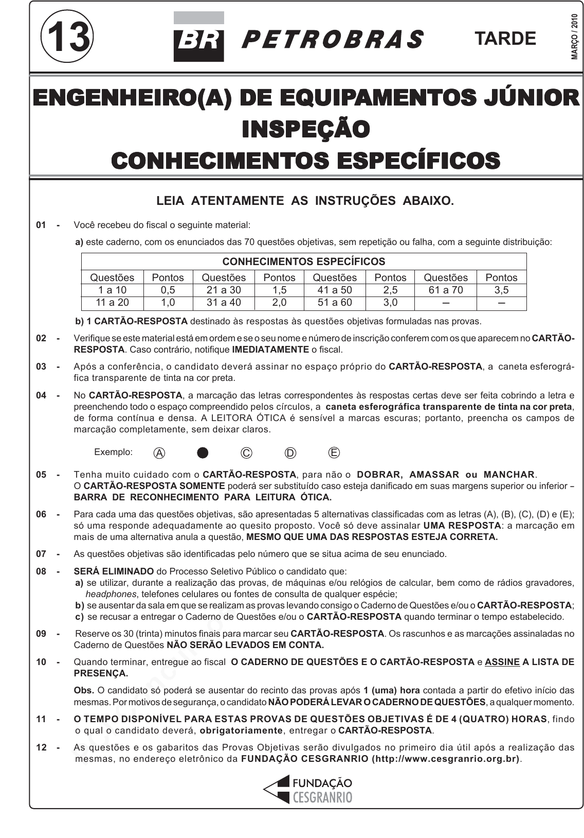 <p>pcimarkpci MjgwNDowMTRkOjc0ODE6NTUzMDowY2I1OjFiMDQ6ODVlNzo0ZWM2:U2F0LCAxMCBGZWIgMjAyNCAxNjo1MDoxNSAtMDMwMA==</p><p>www.pciconcursos.com.br</p><p>ENGENHEIRENGENHEIRENGENHEIRENGENHEIRENGENHEIROOOOO(A)(A)(A)(A)(A) DE EQ DE EQ DE EQ DE EQ DE EQUIPUIPUIPUIPUIPAMENTAMENTAMENTAMENTAMENTOS JÚNIOROS JÚNIOROS JÚNIOROS JÚNIOROS JÚNIOR</p><p>INSPEÇÃOINSPEÇÃOINSPEÇÃOINSPEÇÃOINSPEÇÃO</p><p>CONHECIMENTCONHECIMENTCONHECIMENTCONHECIMENTCONHECIMENTOS ESPECÍFICOSOS ESPECÍFICOSOS ESPECÍFICOSOS ESPECÍFICOSOS ESPECÍFICOS</p><p>MA</p><p>RÇ</p><p>O</p><p>/ 2</p><p>01</p><p>0</p><p>TARDE13</p><p>LEIA ATENTAMENTE AS INSTRUÇÕES ABAIXO.</p><p>01 - Você recebeu do fiscal o seguinte material:</p><p>a) este caderno, com os enunciados das 70 questões objetivas, sem repetição ou falha, com a seguinte distribuição:</p><p>b) 1 CARTÃO-RESPOSTA destinado às respostas às questões objetivas formuladas nas provas.</p><p>02 - Verifique se este material está em ordem e se o seu nome e número de inscrição conferem com os que aparecem no CARTÃO-</p><p>RESPOSTA. Caso contrário, notifique IMEDIATAMENTE o fiscal.</p><p>03 - Após a conferência, o candidato deverá assinar no espaço próprio do CARTÃO-RESPOSTA, a caneta esferográ-</p><p>fica transparente de tinta na cor preta.</p><p>04 - No CARTÃO-RESPOSTA, a marcação das letras correspondentes às respostas certas deve ser feita cobrindo a letra e</p><p>preenchendo todo o espaço compreendido pelos círculos, a caneta esferográfica transparente de tinta na cor preta,</p><p>de forma contínua e densa. A LEITORA ÓTICA é sensível a marcas escuras; portanto, preencha os campos de</p><p>marcação completamente, sem deixar claros.</p><p>Exemplo: A C D E</p><p>05 - Tenha muito cuidado com o CARTÃO-RESPOSTA, para não o DOBRAR, AMASSAR ou MANCHAR.</p><p>O CARTÃO-RESPOSTA SOMENTE poderá ser substituído caso esteja danificado em suas margens superior ou inferior -</p><p>BARRA DE RECONHECIMENTO PARA LEITURA ÓTICA.</p><p>06 - Para cada uma das questões objetivas, são apresentadas 5 alternativas classificadas com as letras (A), (B), (C), (D) e (E);</p><p>só uma responde adequadamente ao quesito proposto. Você só deve assinalar UMA RESPOSTA: a marcação em</p><p>mais de uma alternativa anula a questão, MESMO QUE UMA DAS RESPOSTAS ESTEJA CORRETA.</p><p>07 - As questões objetivas são identificadas pelo número que se situa acima de seu enunciado.</p><p>08 - SERÁ ELIMINADO do Processo Seletivo Público o candidato que:</p><p>a) se utilizar, durante a realização das provas, de máquinas e/ou relógios de calcular, bem como de rádios gravadores,</p><p>headphones, telefones celulares ou fontes de consulta de qualquer espécie;</p><p>b) se ausentar da sala em que se realizam as provas levando consigo o Caderno de Questões e/ou o CARTÃO-RESPOSTA;</p><p>c) se recusar a entregar o Caderno de Questões e/ou o CARTÃO-RESPOSTA quando terminar o tempo estabelecido.</p><p>09 - Reserve os 30 (trinta) minutos finais para marcar seu CARTÃO-RESPOSTA. Os rascunhos e as marcações assinaladas no</p><p>Caderno de Questões NÃO SERÃO LEVADOS EM CONTA.</p><p>10 - Quando terminar, entregue ao fiscal O CADERNO DE QUESTÕES E O CARTÃO-RESPOSTA e ASSINE A LISTA DE</p><p>PRESENÇA.</p><p>Obs. O candidato só poderá se ausentar do recinto das provas após 1 (uma) hora contada a partir do efetivo início das</p><p>mesmas. Por motivos de segurança, o candidato NÃO PODERÁ LEVAR O CADERNO DE QUESTÕES, a qualquer momento.</p><p>11 - O TEMPO DISPONÍVEL PARA ESTAS PROVAS DE QUESTÕES OBJETIVAS É DE 4 (QUATRO) HORAS, findo</p><p>o qual o candidato deverá, obrigatoriamente, entregar o CARTÃO-RESPOSTA.</p><p>12 - As questões e os gabaritos das Provas Objetivas serão divulgados no primeiro dia útil após a realização das</p><p>mesmas, no endereço eletrônico da FUNDAÇÃO CESGRANRIO (http://www.cesgranrio.org.br).</p><p>CONHECIMENTOS ESPECÍFICOS</p><p>Questões</p><p>1 a 10</p><p>11 a 20</p><p>Pontos</p><p>0,5</p><p>1,0</p><p>Questões</p><p>21 a 30</p><p>31 a 40</p><p>Pontos</p><p>1,5</p><p>2,0</p><p>Questões</p><p>41 a 50</p><p>51 a 60</p><p>Pontos</p><p>2,5</p><p>3,0</p><p>Questões</p><p>61 a 70</p><p>-</p><p>Pontos</p><p>3,5</p><p>-</p><p>pcimarkpci MjgwNDowMTRkOjc0ODE6NTUzMDowY2I1OjFiMDQ6ODVlNzo0ZWM2:U2F0LCAxMCBGZWIgMjAyNCAxNjo1MDoxNSAtMDMwMA==</p><p>www.pciconcursos.com.br</p><p>ENGENHEIRO(A) DE EQUIPAMENTOS JÚNIOR</p><p>INSPEÇÃO</p><p>2</p><p>CONHECIMENTOS ESPECÍFICOS</p><p>1</p><p>A inspeção da parede interna de tubos de pequeno diâme-</p><p>tro e das partes internas de uma peça, quando realizada</p><p>pelo ensaio visual, utiliza o tuboscópio como instrumento</p><p>ótico auxiliar. Esse instrumento</p><p>(A) possui um volante, cujo objetivo é amplificar a imagem</p><p>virtual gerada pela lente ocular.</p><p>(B) possui cabeças de diversos formatos e ângulos de</p><p>incidência, possibilitando inspeções em vários ângulos.</p><p>(C) opera no âmbito da manutenção preditiva, permitindo</p><p>a obtenção contínua de dados para uma análise de</p><p>tendências da evolução do estado de uma peça.</p><p>(D) opera simultaneamente com o ensaio de ultrassom,</p><p>de modo a melhor caracterizar eventuais trincas na</p><p>superfície interna de uma peça.</p><p>(E) realiza inspeção e limpeza de superfícies internas com a</p><p>retirada de impurezas que se fixam nessas superfícies.</p><p>2</p><p>O ensaio não destrutivo por líquidos penetrantes é carac-</p><p>terizado como um dos principais métodos de teste para</p><p>a detecção de descontinuidades abertas nas superfícies</p><p>de diversos materiais. Todavia, algumas características o</p><p>impedem de ser utilizado. Dentre estas, destaca-se a</p><p>(A) dificuldade de aplicação em peças de grandes dimen-</p><p>sões.</p><p>(B) dificuldade de utilização nas aplicações de campo.</p><p>(C) não adequação para superfícies muito rugosas.</p><p>(D) não adequa
