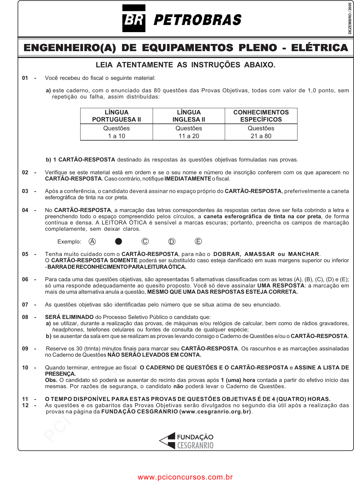<p>pcimarkpci MjgwNDowMTRkOjc0ODE6NTUzMDowY2I1OjFiMDQ6ODVlNzo0ZWM2:U2F0LCAxMCBGZWIgMjAyNCAxNjo0MzoyNiAtMDMwMA==</p><p>www.pciconcursos.com.br</p><p>LÍNGUA</p><p>PORTUGUESA II</p><p>LÍNGUA</p><p>INGLESA II</p><p>CONHECIMENTOS</p><p>ESPECÍFICOS</p><p>Questões</p><p>1 a 10</p><p>Questões</p><p>11 a 20</p><p>Questões</p><p>21 a 80</p><p>ENGENHEIRENGENHEIRENGENHEIRENGENHEIRENGENHEIRO(A) DE EQO(A) DE EQO(A) DE EQO(A) DE EQO(A) DE EQUIPUIPUIPUIPUIPAMENTAMENTAMENTAMENTAMENTOS PLENO - ELÉTRICAOS PLENO - ELÉTRICAOS PLENO - ELÉTRICAOS PLENO - ELÉTRICAOS PLENO - ELÉTRICA</p><p>D</p><p>E</p><p>Z</p><p>E</p><p>M</p><p>B</p><p>R</p><p>O</p><p>/</p><p>20</p><p>05</p><p>LEIA ATENTAMENTE AS INSTRUÇÕES ABAIXO.</p><p>01 - Você recebeu do fiscal o seguinte material:</p><p>a) este caderno, com o enunciado das 80 questões das Provas Objetivas, todas com valor de 1,0 ponto, sem</p><p>repetição ou falha, assim distribuídas:</p><p>b) 1 CARTÃO-RESPOSTA destinado às respostas às questões objetivas formuladas nas provas.</p><p>02 - Verifique se este material está em ordem e se o seu nome e número de inscrição conferem com os que aparecem no</p><p>CARTÃO-RESPOSTA. Caso contrário, notifique IMEDIATAMENTE o fiscal.</p><p>03 - Após a conferência, o candidato deverá assinar no espaço próprio do CARTÃO-RESPOSTA, preferivelmente a caneta</p><p>esferográfica de tinta na cor preta.</p><p>04 - No CARTÃO-RESPOSTA, a marcação das letras correspondentes às respostas certas deve ser feita cobrindo a letra e</p><p>preenchendo todo o espaço compreendido pelos círculos, a caneta esferográfica de tinta na cor preta, de forma</p><p>contínua e densa. A LEITORA ÓTICA é sensível a marcas escuras; portanto, preencha os campos de marcação</p><p>completamente, sem deixar claros.</p><p>Exemplo:</p><p>05 - Tenha muito cuidado com o CARTÃO-RESPOSTA, para não o DOBRAR, AMASSAR ou MANCHAR.</p><p>O CARTÃO-RESPOSTA SOMENTE poderá ser substituído caso esteja danificado em suas margens superior ou inferior</p><p>-BARRA DE RECONHECIMENTO PARA LEITURA ÓTICA.</p><p>06 - Para cada uma das questões objetivas, são apresentadas 5 alternativas classificadas com as letras (A), (B), (C), (D) e (E);</p><p>só uma responde adequadamente ao quesito proposto. Você só deve assinalar UMA RESPOSTA: a marcação em</p><p>mais de uma alternativa anula a questão, MESMO QUE UMA DAS RESPOSTAS ESTEJA CORRETA.</p><p>07 - As questões objetivas são identificadas pelo número que se situa acima de seu enunciado.</p><p>08 - SERÁ ELIMINADO do Processo Seletivo Público o candidato que:</p><p>a) se utilizar, durante a realização das provas, de máquinas e/ou relógios de calcular, bem como de rádios gravadores,</p><p>headphones, telefones celulares ou fontes de consulta de qualquer espécie;</p><p>b) se ausentar da sala em que se realizam as provas levando consigo o Caderno de Questões e/ou o CARTÃO-RESPOSTA.</p><p>09 - Reserve os 30 (trinta) minutos finais para marcar seu CARTÃO-RESPOSTA. Os rascunhos e as marcações assinaladas</p><p>no Caderno de Questões NÃO SERÃO LEVADOS EM CONTA.</p><p>10 - Quando terminar, entregue ao fiscal O CADERNO DE QUESTÕES E O CARTÃO-RESPOSTA e ASSINE A LISTA DE</p><p>PRESENÇA.</p><p>Obs. O candidato só poderá se ausentar do recinto das provas após 1 (uma) hora contada a partir do efetivo início das</p><p>mesmas. Por razões de segurança, o candidato não poderá levar o Caderno de Questões.</p><p>11 - O TEMPO DISPONÍVEL PARA ESTAS PROVAS DE QUESTÕES OBJETIVAS É DE 4 (QUATRO) HORAS.</p><p>12 - As questões e os gabaritos das Provas Objetivas serão divulgados no segundo dia útil após a realização das</p><p>provas na página da FUNDAÇÃO CESGRANRIO (www.cesgranrio.org.br).</p><p>A C D E</p><p>www.pciconcursos.com.br</p><p>pcimarkpci MjgwNDowMTRkOjc0ODE6NTUzMDowY2I1OjFiMDQ6ODVlNzo0ZWM2:U2F0LCAxMCBGZWIgMjAyNCAxNjo0MzoyNiAtMDMwMA==</p><p>www.pciconcursos.com.br</p><p>2</p><p>ENGENHEIRO(A) DE EQUIPAMENTOS PLENO - ELÉTRICA</p><p>www.pciconcursos.com.br</p><p>pcimarkpci MjgwNDowMTRkOjc0ODE6NTUzMDowY2I1OjFiMDQ6ODVlNzo0ZWM2:U2F0LCAxMCBGZWIgMjAyNCAxNjo0MzoyNiAtMDMwMA==</p><p>www.pciconcursos.com.br</p><p>ENGENHEIRO(A) DE EQUIPAMENTOS PLENO - ELÉTRICA</p><p>3</p><p>LÍNGUA PORTUGUESA II</p><p>Miopia coletiva</p><p>Qual é a relação entre contrair um empréstimo e o dilema</p><p>de devorar uma sobremesa calórica? O que têm em</p><p>comum as atividades do Banco Central e a decisão de</p><p>consumir drogas? O economista Eduardo Giannetti da</p><p>Fonseca enxerga em todos esses dilemas a lógica dos</p><p>juros. Segundo ele, ao comer a sobremesa, desfruta-se</p><p>o momento e pagam-se os juros depois, na forma de exer-</p><p>cícios físicos. Para desfrutar alguns momentos de prazer</p><p>extático, o drogado muitas vezes sacrifica seu patrimônio</p><p>cerebral futuro. Torna-se agiota de si mesmo. Professor</p><p>do Ibmec São Paulo, Giannetti acaba de lançar O Valor</p><p>do Amanhã, uma das mais valiosas e legíveis obras já</p><p>escritas sobre um assunto tão complexo e aparentemente</p><p>árido como os juros. Sua tese central, exposta na entre-</p><p>vista que se segue, é a de que o mecanismo dos juros</p><p>encontra similar na vida cotidiana das pessoas, na crença</p><p>religiosa e até no metabolismo humano. A mesma lógica</p><p>define o comportamento dos indivíduos e das socieda-</p><p>des. As que atribuem valor exagerado ao presente sujei-</p><p>tam-se a juros elevados. As que se preocupam demais</p><p>com o futuro deixam passar boas oportunidades de</p><p>investir e desfrutar o presente. Integrante do primeiro</p><p>grupo de países, o Brasil padeceria do que Giannetti</p><p>apelidou de miopia temporal – uma anomalia, alimentada</p><p>pela impaciência, que leva o país a subestimar os desa-</p><p>fios ambientais e sociais e a tentar resolver tudo a carim-</p><p>badas e canetadas.</p><p>Veja – Como o senhor concluiu que o pagamento de</p><p>juros 