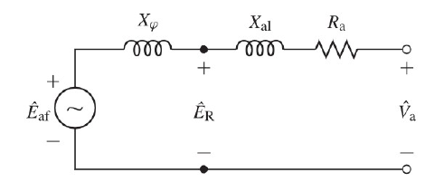 <p>RESUMO</p><p>INTRODUÇÃO</p><p>Para compreender melhor a operação do gerador síncrono sob fator de potência indutivo nulo, visando obter uma aproximação da reatância de dispersão e da reatância de Potier, além de compreender a suas relações, serão discutidos os conceitos fundamentais que devem ser previamente definidos, incluindo a fundamentação teórica e os equacionamentos. Isso fornecerá o conhecimento necessário para entender o objetivo principal da prática.</p><p>Inicialmente, é importante lembrar que os geradores síncronos geralmente operam em condições de saturação. Para determinar a reatância síncrona levando em conta os efeitos reais da saturação, considerando a dispersão existente no núcleo da máquina, é necessário ter um conhecimento prévio da reatância de dispersão da máquina.</p><p>O circuito equivalente monofásico de um gerador síncrono considerando as componentes de entreferro e de dispersão para a reatância síncrona, está mostrado na figura 1.</p><p>Figura 1 – Circuito equivalente</p><p>Fonte: Umans, Stephen D. Máquinas elétricas de Fitzgerald e Kingsley, 7th Edition</p><p>Onde é a reatância de dispersão e é a reatância correspondente a componente fundamental espacial do fluxo de entreferro, é a resistência de armadura. A tensão eficaz á a tensão interna gerada pelo fluxo resultante de entreferro. Assim a reatância síncrona pode ser expressa por:</p><p>Após a revisão do circuito equivalente e das justificativas para a determinação da reatância de dispersão, vamos agora aprofundar os detalhes teóricos sobre como obtê-la.</p><p>O foco agora é a análise da saturação em plena carga, sob fator de potência indutivo nulo, para determinar as reatâncias de dispersão e compreender o conceito de reatância de Potier e sua relação com a reatância de dispersão.</p><p>Em plena carga e com fator de potência zero, o gerador opera com uma carga puramente indutiva, mantendo uma corrente constante, com o gerador operando em velocidade síncrona. Nessas condições, é possível traçar várias curvas de saturação, cada uma correspondente a diferentes correntes de carga. Essas curvas derivam da curva característica a vazio, sendo possível obter a curva sob fator de potência nulo através de deslocamentos adequados da curva a vazio.</p><p>Para traçar a curva sob fator de potência nulo, é crucial conhecer as curvas a vazio e de curto-circuito, além de identificar pontos de operação importantes. A Figura 2 ilustra as curvas a vazio (E0), de curto-circuito (Icc) e a de operação sob fator de potência nulo (ΩV).</p><p>Figura 2 – A curva ΩV e a construção do triângulo de Potier correspondente.</p><p>Fonte: (Jordão) Jordão, Rubens G. Máquinas Síncronas, 2ª edição. LTC, 2013. VitalBook file.</p><p>Antes de aprofundarmos a compreensão sobre como obter a curva (ΩV) para a determinação da reatância de dispersão e entender oque se trata a reatância de Potier, é importante destacar alguns pontos.</p><p>Como discutido anteriormente, é possível obter a curva sob fator de potência nulo a partir de um deslocamento da curva a vazio. Esse comportamento pode ser demonstrado pela análise das propriedades do triângulo PQR, inserido entre as curvas e conhecido como triângulo de Potier. Assim, independentemente das situações dos pontos P e R sobre as respectivas curvas o triangulo PQR é contantes.</p><p>O ponto R da curva ΩV representa uma condição de operação com fator de potência indutivo nulo, conforme ilustrado no diagrama da Figura 3. Nessa condição, a reação da armadura é fortemente desmagnetizante, permitindo a aproximação (2), onde F é a força magnetizante resultante, Ff a força que produz fluxo, e Fa a força de reação do induzido. Além disso, os fasores V, E e Ef permanecem quase em fase, o que justifica a aproximação (3), sendo Xl a reatância de dispersão por fase da armadura (Jordão, 2013).</p><p>Figura 3 – Diagrama de gerador síncrono alimentando carga indutiva de fator de potência nulo.</p><p>Fonte: (Jordão) Jordão, Rubens G. Máquinas Síncronas, 2ª edição. LTC, 2013. VitalBook file.</p><p>Antes de avançarmos, é importante entender como determinar a curva ΩV, que pode ser obtida de maneira simples experimentalmente, conhecendo apenas dois pontos principais, sendo o ponto R e o ponto Ω. O ponto R é obtido quando, sob operação com carga indutiva, a tensão nominal da máquina é obtida para uma dada corrente de excitação. Já o ponto Ω é determinado a partir da característica de curto-circuito. O processo para traçar a curva ΩV é o seguinte:</p><p>1. Determinar o ponto Ω a partir da curva de curto-circuito, entrando com o valor de corrente nominal (I) na curva de curto-circuito, determinando a respectiva corrente de excitação para tal ponto.</p><p>2. A partir do ponto R, traçar uma reta horizontal e marcar o ponto S, de modo que RS = ΩO.</p><p>3. Traçar uma reta paralela ao trecho linear da curva Oe0, partindo de S, até encontrar o ponto P na curva Oe0.</p><p>4. Traçar uma perpendicular de P até a linha SR, obtendo o ponto Q e formando o triângulo de Potier.</p><p>Para completar a curva ΩV, basta deslocar o triângulo de Potier ao longo da curva Oe0, mantendo o vértice P sobre a curva, enquanto o ponto R descreve a trajetória da curva ΩV, os detalhes descritos acima podem ser observados na figura 2.</p><p>Voltando às características de operação com fator de potência indutivo nulo, podemos entender de forma resumida o triângulo de Potier. Que o seu cateto QR representa a força magnetomotriz de reação da armadura (Fa), gerada pela corrente correspondente à curva ΩV. Já o cateto PQ corresponde à queda de tensão sobre a reatância de dispersão (Xl) para a corrente nominal de operação (I).</p><p>É importante destacar que as proporções do triângulo de Potier mostrando na figura 2 permanecem constantes,
