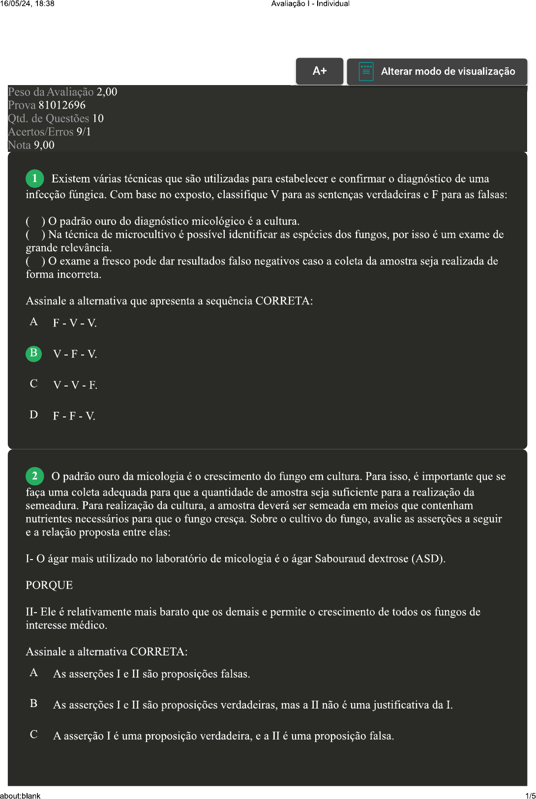 <p>16/05/24, 18:38 Avaliação Individual A+ Alterar modo de visualização Peso da Avaliação 2,00 Prova 81012696 Qtd. de Questões 10 Acertos/Erros 9/1 Nota 9,00 1 Existem várias técnicas que são utilizadas para estabelecer e confirmar diagnóstico de uma infecção fúngica. Com base no exposto, classifique V para as sentenças verdadeiras e F para as falsas: ( ) O padrão ouro do diagnóstico micológico é a cultura. ( ) Na técnica de microcultivo é possível identificar as espécies dos fungos, por isso é um exame de grande relevância. ( ) O exame a fresco pode dar resultados falso negativos caso a coleta da amostra seja realizada de forma incorreta. Assinale a alternativa que apresenta a sequência CORRETA: A B V-F-V C D 2 O padrão ouro da micologia é crescimento do fungo em cultura. Para isso, é importante que se faça uma coleta adequada para que a quantidade de amostra seja suficiente para a realização da semeadura. Para realização da cultura, a amostra deverá ser semeada em meios que contenham nutrientes necessários para que fungo cresça. Sobre cultivo do fungo, avalie as asserções a seguir e a relação proposta entre elas: I- O ágar mais utilizado no laboratório de micologia é ágar Sabouraud dextrose (ASD). PORQUE Ele é relativamente mais barato que os demais e permite crescimento de todos os fungos de interesse médico. Assinale a alternativa CORRETA: A As asserções I e II são proposições falsas. B As asserções I e II são proposições verdadeiras, mas a II não é uma justificativa da I. C A asserção I é uma proposição verdadeira, e a II é uma proposição falsa. about:blank 1/5</p><p>18:38 Avaliação Individual D As asserções I e II são proposições verdadeiras, e a II é uma justificativa da I. 3 As orientações em relação ao processamento das amostras, conforme a ANVISA, variam de acordo com tipo de amostras. Com base na coleta de amostras, avalie as asserções a seguir e a relação proposta entre elas: Em casos de lesões cutâneas é importante que seja realizada assepsia com álcool 70%. PORQUE Podem ocorrer contaminação das amostras com bactérias presentes na microbiota. Assinale a alternativa CORRETA: A As asserções I e II são proposições falsas. B As asserções I e II são proposições verdadeiras, mas a II não é uma justificativa da C A asserção I é uma proposição verdadeira, e a II é uma proposição falsa. D As asserções I e II são proposições verdadeiras, e a II é uma justificativa da I. 4 Os fungos são classificados de acordo com as características celulares em unicelulares ou pluricelulares. Os fungos unicelulares apresentam célula única e se multiplicam por brotamento. Com base num exemplo de unicelular, assinale a alternativa CORRETA: A Bolores. B Leveduras. C Micorrizas. D Cogumelos. 5 A virulência e a patogenicidade de fungos são influenciadas por proteínas que auxiliam na interação com hospedeiro, além disso, esses fatores têm a função de dificultar trabalho do sistema imunológico que permite que fungo consiga se instalar e causar a doença no indivíduo. Com base nos fatores de virulência, classifique V para as sentenças verdadeiras e F para as falsas: ) Os fungos produtores de melanina apresentam uma coloração marrom nas suas estruturas, e isto é considerado um fator de virulência deste grupo. ( ) A cápsula auxilia fungo na sua aderência ao tecido que ele infecta, armazena água e nutrientes, além de fornecer proteção ao fungo. ( ) A cápsula também é considerada um fator de virulência dos fungos, no entanto, diagnóstico se torna dificultoso devido a esta estrutura. Assinale a alternativa que apresenta a sequência CORRETA: about:blank 2/5</p><p>16/05/24, 18:38 Avaliação Individual A F V V. B C D 6 No microcultivo, avalia-se a capacidade de produção de hifas/pseudohifas. Através dessa técnica é possível observar estruturas que podem identificar fungo em nível de Com base nessas estruturas, analise as sentenças a seguir: I- Hifas vegetativas. Hifas aéreas. Estruturas de reprodução. ( ) Promovem a esporulação das estruturas fúngicas. ( ) Responsáveis pela variabilidade genética e/ou produção. ) São estruturas aderidas ao meio de cultura em uma placa, apresentam a função de nutrição do fungo. Assinale a alternativa que apresenta a sequência CORRETA: A II I III. B II - I III. II - III - I. D I - II - III. 7 Os fungos, em sua minoria, podem causar doenças denominadas micoses. O que determina se um fungo causará dano a um hospedeiro é grau de patogenicidade. Com base no exposto, avalie as asserções a seguir e a relação proposta entre elas: I- O grau de patogenicidadede um fungo se dará pela presença de um conjunto desses elementos que são capazes de invadir os tecidos e estimular diferentes respostas no hospedeiro. PORQUE II Quanto mais fatores de patogenicidade um fungo apresentar, mais facilmente ele irá se instalar e causar doença. Assinale a alternativa CORRETA: A A asserção I é uma proposição falsa, e a II é uma proposição verdadeira. B As asserções I e II são proposições falsas. C As asserções I e II são proposições verdadeiras, mas a II não é uma justificativa da I. about:blank 3/5</p><p>18:38 Avaliação I Individual D As asserções I e II são proposições verdadeiras, e a II é uma justificativa da I. 8 Os fungos são microrganismos classificados como unicelulares que são representados pelas leveduras e pluricelulares representados pelos bolores, estes apresentam uma célula. Com base nessa célula, assinale a alternativa CORRETA: A B Plasmática. C Procarionte. D Eucarionte. Revisar Conteúdo do Livro 9 A macroscopia da colônia nos permite realizar a primeira diferenciação entre os fungos filamentosos e fungos leveduriforme, devido à característica de colônias. Com base nessa identificação, analise as sentenças a I- Através da macroscopia é possível identificar do fungo. Alg