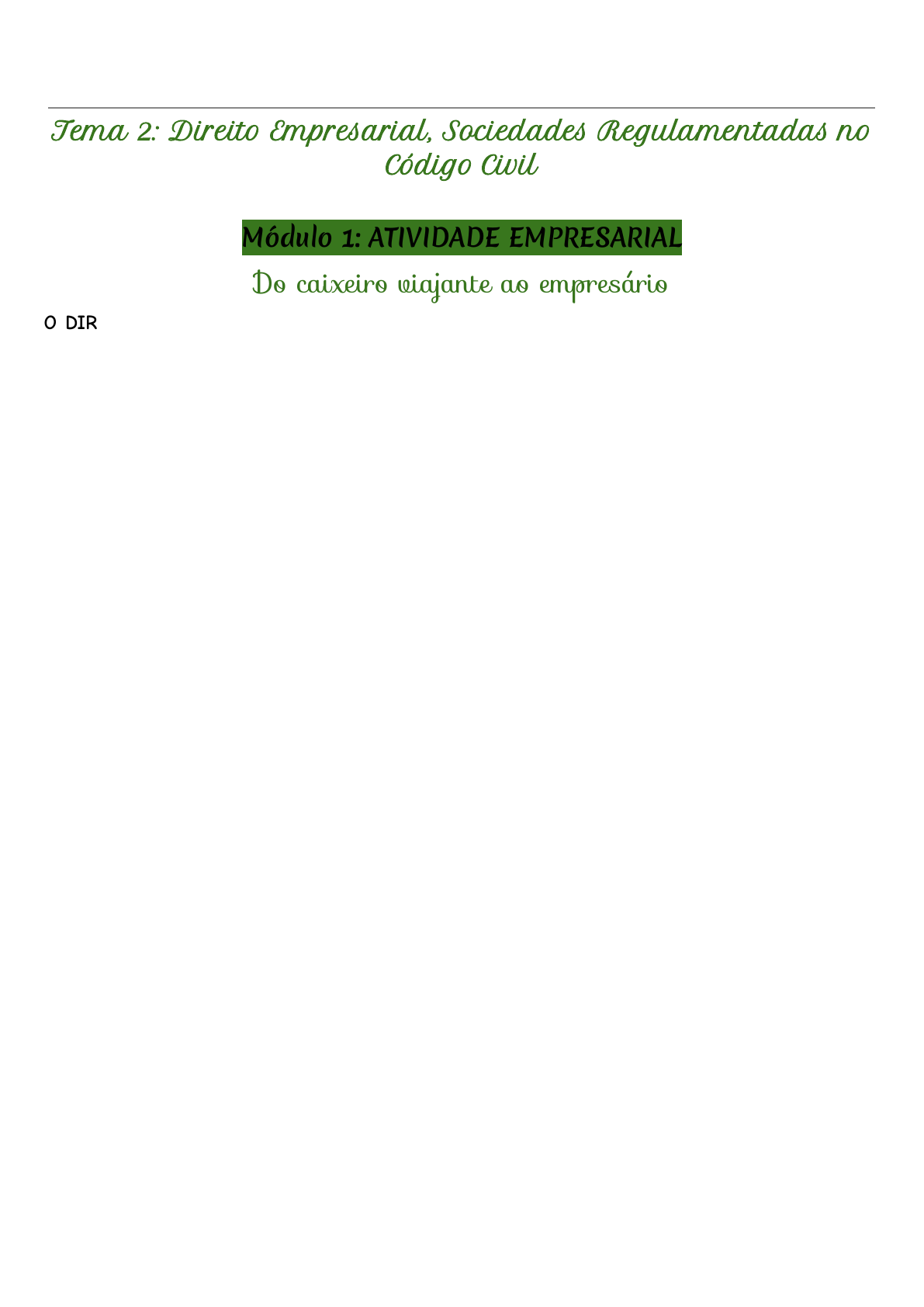 <p>Direito Empresarial e do Consumid�</p><p>Tema 2: Direito Empresarial, S�ciedades Regulamentadas no</p><p>Código Civil</p><p>Módulo 1: ATIVIDADE EMPRESARIAL</p><p>Do caixeiro viajante ao empresário</p><p>O DIREITO é um conjunto de normas destinadas a regular a atuação dos indivíduos em sociedade</p><p>e estipula as regras de como as atividades produtivas devem ser desenvolvidas.</p><p>A estrutura do sistema jurídico brasileiro está formatada para o modelo do sistema Capitalista de</p><p>Produção, existem normas que promovem e incentivam o desenvolvimento das atividades</p><p>econômicas.</p><p>As NORMAS buscam, de um modo equilibrado, proteger, ao mesmo tempo, as atividades</p><p>econômicas, as sociedades empresárias, os trabalhadores e consumidores, que estão envolvidos no</p><p>processo de geração de riqueza.</p><p>As NORMAS de direito empresarial trata precisamente de como devem se organizar os entes que</p><p>desenvolvem atividades econômicas. Essa organização é necessária, uma vez que o exercício da</p><p>atividade empresarial conjuga uma série de fatores e elementos produtivos que dependem dessa</p><p>coordenação.</p><p>A busca pela ampliação de mercados para a troca de excedentes foi um dos motivos que levaram</p><p>à expansão do Império Romano. Da mesma forma, a Companhia das Índias Ocidentais, que</p><p>resultou na invasão holandesa ao Brasil, também buscava expandir seus mercados.</p><p>Alguns autores chegam a configurá-la como uma sociedade anônima, em razão de sua</p><p>organização.</p><p>Inúmeros eventos históricos se relacionam como exercício da atividade comercial pelo homem:</p><p>- Mercantilismo;</p><p>- Revolução Industrial;</p><p>- Globalização.</p><p>Todos foram motivados pelo exercício de práticas comerciais e, para poder realizá-las com</p><p>segurança, foi necessária a criação de regras específicas para esse ramo de atividades.</p><p>Algumas mudanças realizadas para o exercício de práticas comerciais no Brasil:</p><p>O antigo Código Comercial foi todo recortado e apenas a parte relacionada ao comércio marítimo</p><p>ainda permanece em vigor.</p><p>Conteúdos referentes ao direito empresarial estão no Código Civil, não mais no Código Comercial.</p><p>O fundamento do antigo direito comercial estava centralizado na figura do comerciante, que</p><p>sempre foi o responsável pelas obrigações assumidas nas trocas comerciais ao longo do</p><p>desenvolvimento histórico da atividade comercial.</p><p>A razão para este destaque ao comerciante é simples: ele era o elemento que executava os atos do</p><p>comércio, ou seja, as trocas comerciais.</p><p>A antiga teoria dos atos de comércio servia para proteger o comerciante, aquele que realizava e</p><p>praticava atos de comércio reconhecidos como tais.</p><p>A mudança nesse raciocínio veio com a construção da teoria da empresa, em oposição à teoria</p><p>dos atos de comércio.</p><p>Essa nova teoria identificava a empresa, e não mais o comerciante, como o fundamento do direito</p><p>comercial.</p><p>Resumindo</p><p>A partir da mudança do antigo Código Comercial pelo Código Civil de 2002, a figura jurídica da</p><p>empresa passou a ser o elemento central a ser protegido e fomentado por meio do conjunto de</p><p>normas jurídicas, que passou a ser reconhecido como direito empresarial, não mais direito</p><p>comercial.</p><p>Elementos do direito empresarial e a teoria da empresa</p><p>Quando falamos de direito empresarial, estamos nos referindo não apenas à teoria da empresa,</p><p>mas também às normas incorporadas pelo Código Civil.</p><p>Atualmente, existem projetos de lei tramitando no Congresso com o objetivo de reativar e atualizar</p><p>o Código Comercial, extrair o conteúdo do direito empresarial de dentro do Código Civil e</p><p>restabelecer a autonomia do direito comercial.</p><p>Tanto a teoria dos atos de comércio quanto a teoria da empresa nunca definiram de modo preciso</p><p>quem deveria ser identificado como comerciante ou como empresário. A razão é bem simples: o</p><p>ato de comerciar ou empresariar não é taxativo. As mudanças nos mercados, na economia e na</p><p>vida contemporânea não permitem uma categorização específica, sob pena de deixar de fora</p><p>inovações que possam ocorrer.</p><p>Para não correr o risco de inviabilizar inovações, tanto as normas do Código Comercial quanto as</p><p>do Código Civil tomam um caminho indireto: elas indicam quais atividades são consideradas</p><p>empresariais e quais não são. Portanto, os empresários são os que desenvolvem as atividades</p><p>empresariais.</p><p>A partir da edição do Código Civil de 2002, com a incorporação da teoria da empresa, surge a</p><p>necessidade de considerar algumas definições técnicas em relação aos termos:</p><p>- Empresa;</p><p>- Empresário;</p><p>- Sociedade Empresária.</p><p>DEFINIÇÃO DE EMPRESÁRIO</p><p>A partir do Código Civil de 2002: A referência primordial para a aplicação de regras, princípios e</p><p>normas inerentes ao direito empresarial está concentrada na figura do empresário.</p><p>MAS QUEM É O EMPRESÁRIO</p><p>Considera-se empresário quem exerce profissionalmente atividade econômica organizada para a</p><p>produção ou a circulação de bens ou de serviços. - Art. 966º do Código Civil.</p><p>DEFINIÇÃO DE EMPRESA</p><p>É uma atividade, um conjunto de atos organizados, profissionais, com escopo lucrativo e com</p><p>habitualidade voltada para a produção ou circulação de bens e serviços.</p><p>ORGANIZAÇÃO</p><p>É a diferenciação dada pelo empreendedor ou empresário, na organização, na administração dos</p><p>fatores de produção como objetivo de produzir ou circular bens e serviços dentro da economia.</p><p>“Não se considera empresário quem exerce profissão intelectual, de natureza científica, literária ou</p><p>artística, ainda com o concurso de auxiliares o