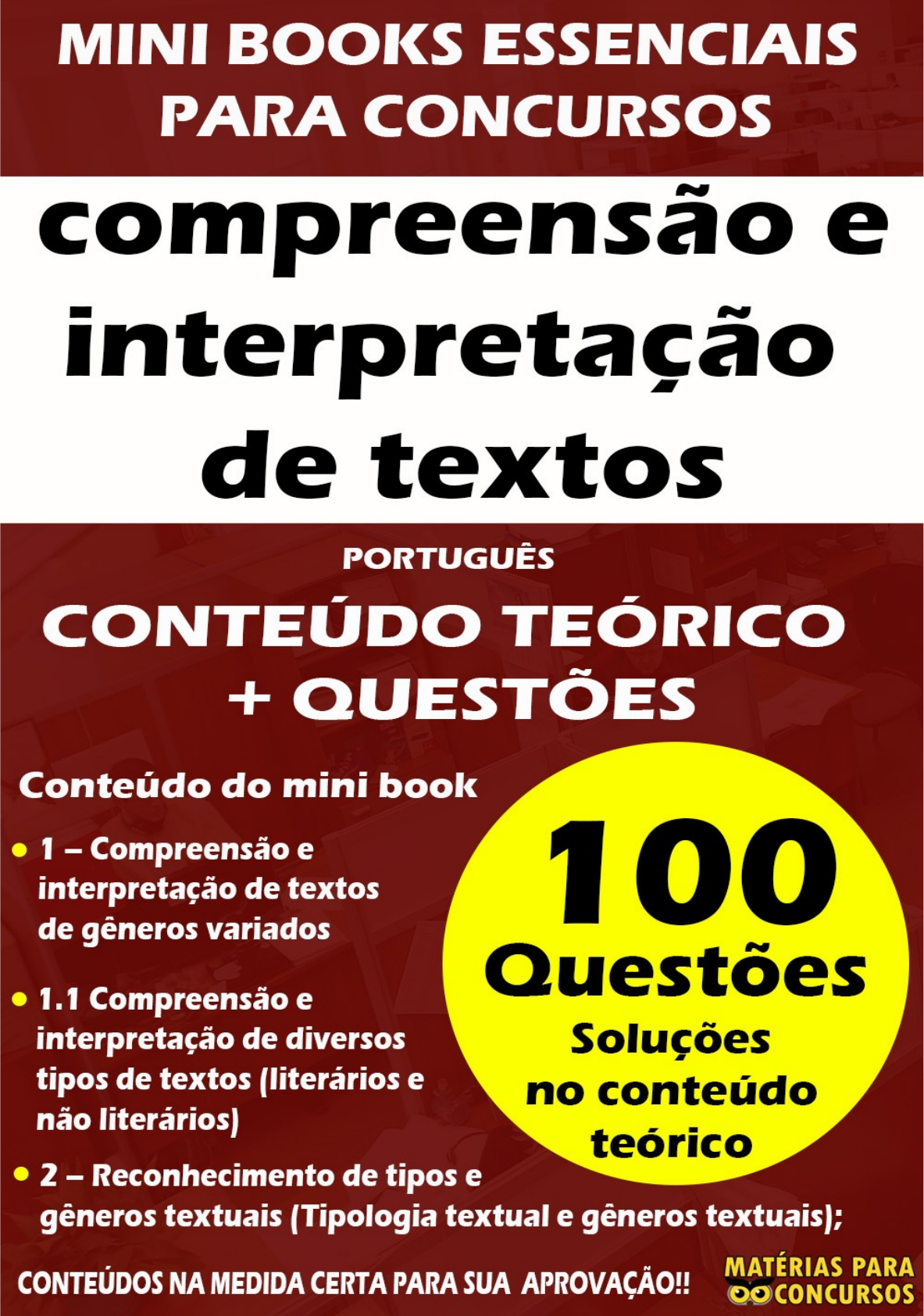 <p>1</p><p>ATENÇÃO</p><p>Leia com bastante atenção estas informações iniciais para entender por que você</p><p>adquiriu um excelente material de estudos.</p><p>Você acabou de adquirir o mini book Português essencial para concursos com o</p><p>conteúdo de Compreensão e interpretação de textos, e espero que ajude na sua</p><p>aprovação.</p><p>É fato que fazer questões é bom para praticar conteúdos adquiridos e descobrir que</p><p>conteúdos que ainda devem ser estudados.</p><p>Os mini books essenciais para concursos foram desenvolvidos baseados em questões</p><p>de concursos, ou seja, você vai aprender o que realmente cai sobre serviços públicos</p><p>em concursos;</p><p>Eu sempre digo que as apostilas que tem no mercado são boas e que são excelentes</p><p>materiais de apoio, mas abordam os assuntos de maneira resumida, senão elas teriam</p><p>milhares de páginas e não teriam o custo-benefício que têm;</p><p>Então se você estudar apenas por elas verá que deixará de acertar várias questões, e</p><p>que em concursos as vezes a distância da aprovação são apenas de 1 a 3 questões de</p><p>acertos a mais.</p><p>Com os mini books, você estudará o que realmente cai nos concursos de maneira</p><p>simples, sem se aprofundar em informações que não caem em concursos e com muito</p><p>mais conteúdos do que as apostilas do mercado;</p><p>São 13 páginas com conteúdo teórico e 100 questões para você praticar com um total</p><p>de 111 páginas.</p><p>Mini books essenciais para concursos,</p><p>conteúdos na medida certa para sua aprovação!!</p><p>Sou Eder Sabino Carlos do canal Matérias para concursos e dos Blogs Central de</p><p>Favoritos, Matérias para concursos e Método concursos.</p><p>Bons estudos e torcerei para que este mini book seja um grande material de apoio e</p><p>ajude você a passar em um concurso público.</p><p>2</p><p>Siga minhas redes sociais, canal e blogs</p><p>youtube.com/c/materiasparaconcursos https://www.facebook.com/materiasparaconcursos</p><p>instagram.com/materiasparaconcursos br.pinterest.com/materiasparaconcursos</p><p>twitter.com/materiasparacon https://www.metodoconcursos.com.br/</p><p>centraldefavoritos.com.br materiasparaconcursos.com.br</p><p>3</p><p>https://www.youtube.com/c/materiasparaconcursos</p><p>https://materiasparaconcursos.com.br/</p><p>https://centraldefavoritos.com.br/</p><p>https://www.metodoconcursos.com.br/</p><p>https://twitter.com/materiasparacon</p><p>https://br.pinterest.com/materiasparaconcursos/</p><p>https://www.instagram.com/materiasparaconcursos/</p><p>https://www.facebook.com/materiasparaconcursos</p><p>https://www.metodoconcursos.com.br/</p><p>Sumário</p><p>1 – Compreensão e interpretação de textos de gêneros variados.........................................................4</p><p>1.1 Compreensão e interpretação de diversos tipos de textos (literários e não literários)....................5</p><p>2 – Reconhecimento de tipos e gêneros textuais (Tipologia textual e gêneros textuais);....................7</p><p>QUESTÕES DE CONCURSOS........................................................................................................13</p><p>1 Compreensão e interpretação de textos de gêneros variados..........................................................13</p><p>2 Reconhecimento de tipos e gêneros textuais (Tipologia textual e gêneros textuais);.....................51</p><p>1 – Compreensão e interpretação de textos de gêneros</p><p>variados</p><p>A compreensão de um texto é fazer uma análise objetiva do texto. É verificar o que realmente está</p><p>escrito nele. Já a interpretação de texto imagina o que as ideias do texto tem a ver com a realidade.</p><p>O leitor tira conclusões subjetivas do texto.</p><p>Compreensão de textos</p><p>A compreensão de um texto é fazer uma análise objetiva do texto. É verificar o que realmente está</p><p>escrito nele. Tem que estar escrito e não imaginar o que o autor quis dizer, ou seja, todas as</p><p>informações devem estar presente no texto.</p><p>Deve-se analisar os dados concretos e objetivos do texto.</p><p>Existem algumas expressões que fica claro que o que se quer analisar é a compreensão do texto:</p><p>Segundo o autor….</p><p>Segundo o texto….</p><p>O texto informa que….</p><p>No texto…..</p><p>O autor afirma que….</p><p>De acordo com o autor….</p><p>De acordo com o texto….</p><p>Fica claro nas expressões acima que as respostas deverão estar clara no texto, ou seja, você deve</p><p>compreender o texto para tirar as conclusões.</p><p>4</p><p>Interpretação de textos</p><p>A interpretação de texto imagina o que as ideias do texto tem a ver com a realidade.</p><p>O leitor tira conclusões subjetivas do texto (deduzir o que o autor do texto quis dizer).</p><p>As informações não estão escrita claramente no texto, elas estão fora do texto, mas tem ligação com</p><p>ele. Você deve deduzir o que o autor está querendo dizer dentre as ideias que foram escritas no</p><p>texto.</p><p>Para você fazer uma boa interpretação de um texto é necessário que você tenha algum</p><p>conhecimento prévio sobre o assunto que está sendo abordado pelo autor. Você deve fazer uma</p><p>análise pessoal e crítica para ter uma conclusão mais completa.</p><p>Existem algumas expressões que fica claro que o que se quer analisar é a interpretação do texto:</p><p>Conforme o texto, podemos concluir…</p><p>Pela leitura do texto é possível perceber…</p><p>É possível inferir que através….</p><p>O texto permitem levantar a hipótese de que…..</p><p>Conclui-se do texto que…</p><p>O texto encaminha o leitor para…</p><p>Para você fazer uma boa compreensão e interpretação do texto você deve ler atentamente todo o</p><p>texto. Se possível releia o texto, pois você terá uma ideia melhor do que está escrito.</p><p>Grife as partes que você ache mais importante.</p><p>Analise 