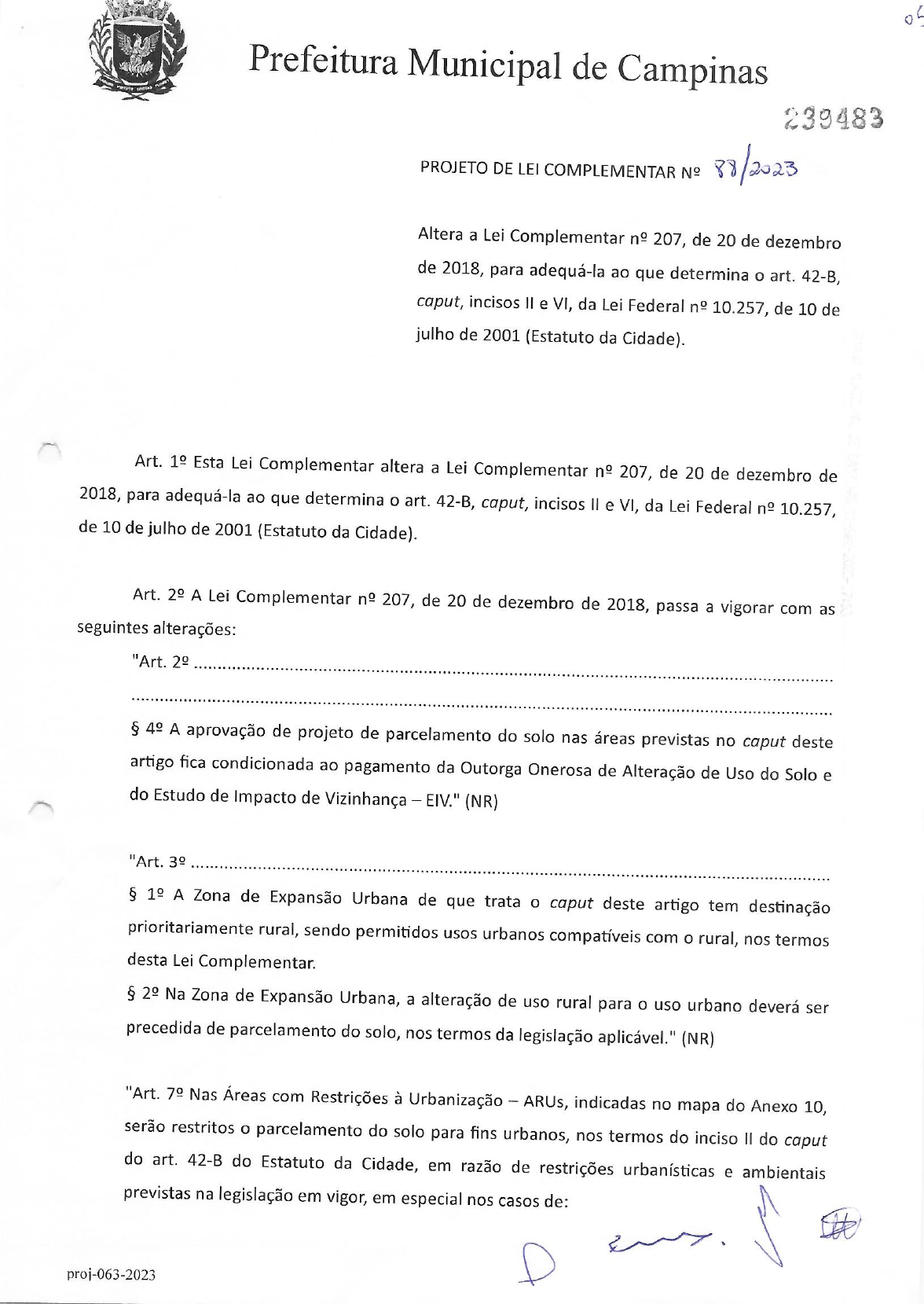 <p>Prefeitura Municipal de Campinas 239483 PROJETO COMPLEMENTAR 88/2023 DE LEI Altera a Lei Complementar 207, de 20 de dezembro de 2018, para adequá-la ao que determina o art. 42-B, caput, incisos II e VI, da Lei Federal n° 10.257, de 10 de julho de 2001 (Estatuto da Cidade). Art. Esta Lei Complementar altera a Lei Complementar 207, de 20 de dezembro de 2018, para adequá-la ao que determina o art. 42-B, caput, incisos e VI, da Lei Federal 10.257, de 10 de julho de 2001 (Estatuto da Cidade). Art. A Lei Complementar 207, de 20 de dezembro de 2018, passa a vigorar com as seguintes alterações: "Art. § A aprovação de projeto de parcelamento do solo nas áreas previstas no caput deste artigo fica condicionada ao pagamento da Outorga Onerosa de Alteração de Uso do Solo e do Estudo de Impacto de Vizinhança - EIV." (NR) "Art. § A Zona de Expansão Urbana de que trata o caput deste artigo tem destinação prioritariamente rural, sendo permitidos usos urbanos compatíveis com o rural, nos termos desta Lei Complementar. § Na Zona de Expansão Urbana, a alteração de uso rural para o uso urbano deverá ser precedida de parcelamento do solo, nos termos da legislação aplicável." (NR) "Art. Nas Áreas com Restrições à Urbanização - ARUs, indicadas no mapa do Anexo 10, serão restritos o parcelamento do solo para fins urbanos, nos termos do inciso II do caput do art. 42-B do Estatuto da Cidade, em razão de restrições urbanísticas e ambientais previstas na legislação em vigor, em especial nos casos de: proj-063-2023</p><p>6 Prefeitura Municipal de Campinas I terrenos alagadicos ou sujeitos a inundações, antes de tomadas as providências para assegurar o escoamento das águas; movimentos gravitacionais de massa, quando não for possível sua contenção; III preservação ambiental e hidrologia; IV declividade igual ou superior a 30% (trinta por cento), salvo se atendidas exigências específicas das autoridades competentes; V áreas em que a poluição impeça condições sanitárias suportáveis, até que ocorra sua correção; VI áreas aterradas com material nocivo à saúde pública, até que ocorra sua correção; VII demais restrições urbanísticas e ambientais previstas na legislação em vigor. § Não será permitido o parcelamento do solo para fins urbanos em áreas nas quais as condições geológicas não aconselhem a edificação. § A identificação das restrições será apurada no ato do cadastramento da gleba, mediante apresentação de levantamento planialtimétrico cadastral e demais elementos técnicos necessários." (NR) "Art. 12-A. Na Zona de Expansão Urbana deve ser mantida como área permeável, no mínimo, 30% (trinta por cento), 35% (trinta e cinco por cento) ou 40% (quarenta por cento) da área total da gleba objeto do parcelamento, conforme o Anexo 16 desta Lei Complementar. § Integram as áreas permeáveis de que trata o caput os Espaços Livres de Uso Público ELUPs (Áreas Verdes e Sistemas de Lazer) e os Equipamentos Públicos Urbanos EPUs permeáveis, respeitadas as condições estabelecidas a seguir: I - os Espaços Livres de Uso Público deverão ocupar, salvo maior exigência de legislação aplicável, no mínimo 20% (vinte por cento) da gleba objeto do parcelamento; II os Sistemas de Lazer deverão ser apresentados nos termos da legislação aplicável, representando, no mínimo, 5% (cinco por cento) da gleba objeto do parcelamento, com efetivo aproveitamento. § Consideram-se Equipamentos Públicos Urbanos Permeáveis, para fins de complementação das áreas permeáveis aplicáveis para a gleba: I - as faixas de tratamentos paisagístico, à exceção de taludes com declividade acima de 30%; lagos e espelhos d'água; proj-063-2023</p><p>Prefeitura Municipal de Campinas III - áreas permeáveis de servidões administrativas referentes às linhas de transmissão, gasodutos, oleodutos e faixas de domínio e faixas non aedificandi de rodovias e ferrovias; IV as porções de áreas institucionais destinadas à instalação de equipamentos públicos urbanos exclusivamente para captação de águas pluviais (bacias de detenção), desde que seja garantida sua permeabilidade; § Dispositivos viários permeáveis, tais como rotatórias, canteiros centrais e calçadas, quando enquadrados como Soluções Baseadas na Natureza SBNs, a exemplo dos jardins de chuva e biovaletas, também poderão integrar as áreas permeáveis de que trata o caput, desde que respeitadas as disposições do § deste artigo. § Prevalecerá a taxa de permeabilidade mais restritiva, nos casos em que houver incidência de mais de uma taxa de permeabilidade na mesma gleba, exceto quando a maior parte da gleba já estiver inserida em área urbana, cuja taxa de permeabilidade será aplicada sobre todo o imóvel, considerando-se a fração que for maior. § Deverá ser feita a demarcação, no momento do cadastramento da gleba, de Parques Lineares e/ou Corredores Ecológicos, conforme vocação do local e proposta de uso futuro da gleba, nos termos do parágrafo único do art. 12 desta Lei Complementar. § 6° Deverá ser garantida a conectividade das áreas verdes com função ecológica e a manutenção do fluxo gênico, privilegiando-se a alocação dos Espaços Livres de Uso Público com os demais elementos do Sistema de Áreas Verdes e Unidades de Conservação (SAV- UC), inclusive por meio da implantação e/ou adequação de dispositivos para mobilidade da fauna. § Fica vedada a supressão dos fragmentos de vegetação nativa mapeados no Plano Municipal do Verde (Decreto Municipal n° 19.167, de 6 de junho de 2016) e os novos fragmentos identificados nos processos de pré-cadastramento e cadastramento da gleba situados na zona de expansão urbana, salvo nas hipóteses de utilidade pública ou de baixo impacto, quando não houver alternativa técnica e locacional ao empreendimento proposto, conforme estabelecido na Lei Federal n° 12.651, de 25 de maio de 2012. § 