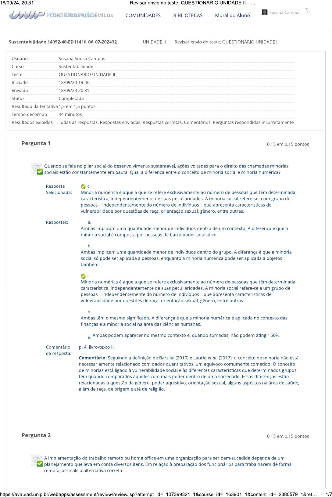 <p>18/09/24, 20:31 Revisar envio do teste: QUESTIONÁRIO UNIDADE UNIP Susana Campos 1 COMUNIDADES BIBLIOTECAS Mural do Aluno Sustentabilidade 14052-40-ED11410 06 07-202432 UNIDADE Revisar envio do teste: QUESTIONÁRIO UNIDADE Usuário Susana Sousa Campos Curso Sustentabilidade Teste QUESTIONÁRIO UNIDADE Iniciado 18/09/24 19:46 Enviado 18/09/24 20:31 Status Completada Resultado da tentativa 1,5 em 1,5 pontos Tempo decorrido 44 minutos Resultados exibidos Todas as respostas, Respostas enviadas, Respostas corretas, Comentários, Perguntas respondidas incorretamente Pergunta 1 0,15 em 0,15 pontos Quando se fala no pilar social do desenvolvimento sustentável, ações voltadas para o direito das chamadas minorias sociais estão constantemente em pauta. Qual a diferença entre o conceito de minoria social e minoria numérica? Resposta C. Selecionada: Minoria numérica é aquela que se refere exclusivamente ao número de pessoas que têm determinada característica, independentemente de suas peculiaridades. A minoria social refere-se a um grupo de pessoas independentemente do número de indivíduos que apresenta características de vulnerabilidade por questões de raça, orientação sexual, gênero, entre outras. Respostas: a. Ambas implicam uma quantidade menor de indivíduos dentro de um contexto. A diferença é que a minoria social é composta por pessoas de baixo poder aquisitivo. b. Ambas implicam uma quantidade menor de indivíduos dentro do grupo. A diferença é que a minoria social só pode ser aplicada a pessoas, enquanto a minoria numérica pode ser aplicada a objetos também. Minoria numérica é aquela que se refere exclusivamente ao número de pessoas que têm determinada característica, independentemente de suas peculiaridades. A minoria social refere-se a um grupo de pessoas independentemente do número de indivíduos que apresenta características de vulnerabilidade por questões de raça, orientação sexual, gênero, entre outras. d. Ambas têm o mesmo significado. A diferença é que a minoria numérica é aplicada no contexto das finanças e a minoria social na área das ciências Ambas podem aparecer no mesmo contexto e, quando somadas, não podem atingir e. Comentário p. 4, livro-texto II. da resposta: Comentário: Seguindo a definição de Barzilai (2010) e Laurie et al. (2017), o conceito de minoria não está necessariamente relacionado com dados quantitativos, um comumente cometido. conceito de minorias está ligado à vulnerabilidade social e às diferentes características que determinados grupos têm quando comparados com mais poder dentro de uma sociedade. Essas diferenças estão relacionadas à questão de gênero, poder aquisitivo, orientação sexual, alguns aspectos na área de saúde, além de raça, de origem e até de Pergunta 2 0,15 em 0,15 pontos A implementação do trabalho remoto ou home office em uma organização para ser bem-sucedida depende de um planejamento que leva em conta diversos itens. Em relação à preparação dos funcionários para trabalharem de forma remota, assinale a alternativa correta. 1/7</p><p>18/09/24, 20:31 Revisar envio do teste: QUESTIONÁRIO UNIDADE Resposta e. Selecionada: A empresa precisa preparar tanto o funcionário que trabalhará em sistema home office quanto sua família, além dos colegas que vão ficar na empresa para que eles não se sintam colocados em segundo plano. Respostas: a. A empresa não tem responsabilidade em preparar os funcionários para o sistema home office. Isso fica a cargo de cada profissional de adequar. b. A empresa deve preparar o funcionário, mas não deve em como ele tratará disso com a família. C. Quanto menos a empresa interferir em como o funcionário irá organizar seu trabalho remoto, melhor. d. A empresa deve aplicar um teste para selecionar quem poderá ou não trabalhar remotamente. e. A empresa precisa preparar tanto o funcionário que trabalhará em sistema home office quanto sua família, além dos colegas que vão ficar na empresa para que eles não se sintam colocados em segundo plano. Comentário da p. 24, livro-texto II. resposta: Comentário: A implementação do sistema de home office, trabalho remoto ou teletrabalho necessita de um projeto estruturado de implementação. Quando ele é uma medida emergencial apenas para cortar custos, tende a não dar certo. que um projeto de implementação de trabalho remoto precisa levar em conta: A cultura organizacional da empresa culturas centralizadoras ou muito burocráticas não são propícias. A preparação da liderança líderes precisam aprender a gerir, motivar e engajar pessoas à distância. Análise financeira dos investimentos necessários versus economia gerada. Afinidade com tecnologia as ferramentas de gestão on-line são imprescindíveis para o sucesso do projeto. Investimento em sistemas de monitoramento, acompanhamento e interatividade. Saber os limites entre monitoramento e acompanhamento, e controle excessivo. Um programa de home office só dá certo quando há confiança entre as partes envolvidas. Preparação do funcionário que vai trabalhar em casa - o aprendizado para a mudança de hábitos em função da nova realidade é de responsabilidade da empresa. Conscientização da família - empresa precisa preparar também a família do profissional para compreender a nova dinâmica. Conscientização de quem não será beneficiado - os funcionários que não puderem contar com esse recurso tendem a se sentir colocados em segundo plano. Proporcionar algum benefício extra para aqueles que não poderão ser contemplados pode ser uma solução. Criação de uma política estruturada e documentada da nova realidade. Pergunta 3 0,15 em 0,15 pontos</p><p>18/09/24, 20:31 Revisar envio do teste: QUESTIONÁRIO UNIDADE Além dos acidentes, a área de Saúde e Segurança do Trabalho das empresas cuida também das chamadas doenças ocupacionais. o que são doenças ocupacionais? Resposta b. Selecionada: São doen