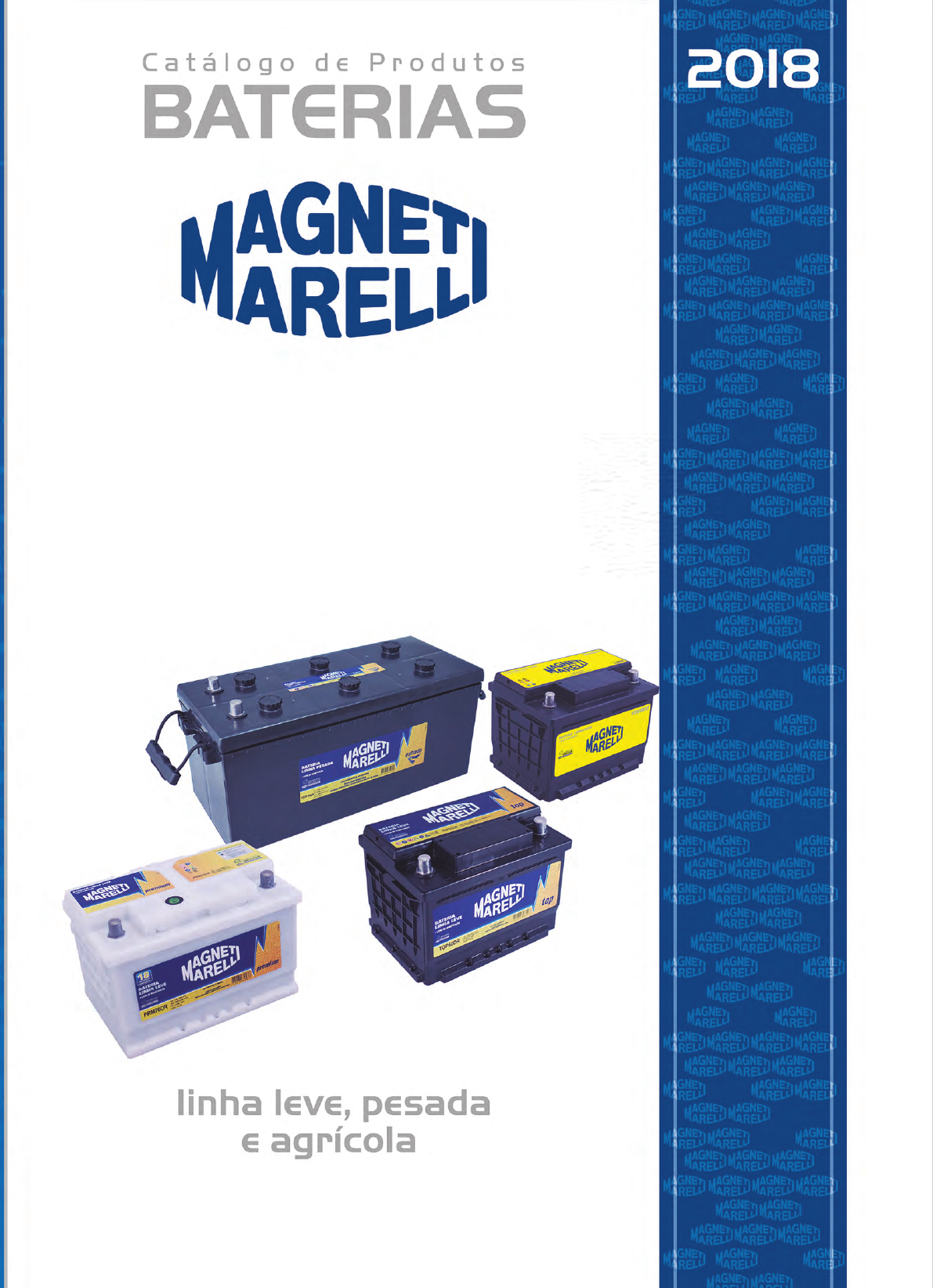 <p>LINHA LEVE</p><p>Dados Técnicos.................................................................................................................................. 3</p><p>Características Técnicas.................................................................................................................... 4</p><p>Composição da Linha......................................................................................................................... 5</p><p>Cross registro..................................................................................................................................... 6</p><p>LINHA LEVE - aplicação em veículos de passeio e utilitários leves.</p><p>Agrale, Alfa Romeo, Asia Motors, Audi, BMW, Chery e Chevrolet..................................................... 9</p><p>Chrysler e Citroën.............................................................................................................................10</p><p>Daewoo, Daihatsu, Dodge, Effa e Fiat..............................................................................................11</p><p>Ford...................................................................................................................................................12</p><p>Honda, Hyundai, Jac Motors, Jaguar e Jeep....................................................................................13</p><p>JPX, Kia Motors, Land Rover, Mazda e Mercedes-Benz................................................................. 14</p><p>Mini, Mitsubishi, Nissan e Peugeot...................................................................................................15</p><p>Porsche e Renault............................................................................................................................ 16</p><p>Seat, Subaru, Suzuki, Toyota,Troller e Volkswagen..........................................................................17</p><p>Volvo..................................................................................................................................................18</p><p>LINHA PESADA - aplicação em veículos utilitários, caminhões e ônibus.</p><p>Agrale, Chevrolet, Chrysler e Ford................................................................................................... 21</p><p>Iveco e Mercedes-Benz.................................................................................................................... 22</p><p>Scania e Volkswagen........................................................................................................................23</p><p>Volvo................................................................................................................................................. 24</p><p>LINHA AGRÍCOLA - aplicação em tratores e motores estacionários.</p><p>Agco-Massey Ferguson, Agrale Tratores e Case (J.J.Case)........................................................... 27</p><p>Caterpillar, Clark Tratores, Fiat Allis, Huber Warco/ Dresser e John Deere..................................... 28</p><p>Komatsu, Malves, Müller, New Holland, Poclain, Randon, Svedala Dynapac e Tema Terra............29</p><p>Terex, Valmet/ Valtra, Volvo Construction Equipament, Wabco, Yale e Zector.................................30</p><p>ÍNDICE BATERIAS</p><p>C a t á l o g o d e p r o d u t o s</p><p>3</p><p>ba</p><p>te</p><p>ri</p><p>a</p><p>A bateria é um componente integrante do sis-</p><p>tema elétrico e o principal responsável pelo cor-</p><p>reto funcionamento da parte eletroeletrônica do</p><p>veículo. Trata-se de um dispositivo de armazena-</p><p>mento de energia química que a transforma em</p><p>energia elétrica quando necessário.</p><p>• Fornecer energia elétrica para acionar o motor de partida;</p><p>• Fornecer corrente elétrica para o sistema de injeção/ ignição durante a partida;</p><p>• Fornecer energia elétrica aos componentes que poderão ser utilizados enquanto o motor</p><p>estiver desligado;</p><p>• Agir como estabilizador de tensão para o sistema de carga;</p><p>• Suprir corrente elétrica, quando a demanda de energia do automóvel exceder a capacidade</p><p>de carga do alternador.</p><p>As baterias Magneti Marelli foram desenvolvidas para atender as mais rigorosas situações</p><p>de uso.</p><p>São fabricadas e testadas com tecnologia de ponta e atendem os requisitos de certificação do</p><p>Inmetro, o que garante o alto desempenho de seus produtos.</p><p>Diferencial das baterias Magneti Marelli:</p><p>Tecnologia de grades estampadas que evita o desgaste prematuro das baterias, proporciona</p><p>mais resistência à corrosão e maior condutividade elétrica, ou seja, mais energia no momento</p><p>da partida. A qualidade da grade de uma bateria automotiva é um dos fatores que mais influ-</p><p>enciam a durabilidade do produto. Por isso, a evolução tecnológica das baterias ao longo do</p><p>tempo aconteceu principalmente em função de novas formas de fabricação e ligas que</p><p>compõem as grades.</p><p>Principais cuidados ao manipular a bateria (normas de segurança):</p><p>• Usar sempre óculos de proteção;</p><p>• Ler as instruções contidas no manual/ certificado de garantia;</p><p>• Evitar chamas de qualquer espécie;</p><p>• Manter a parte superior da bateria sempre limpa e seca;</p><p>• Fixar corretamente a bateria no veículo;</p><p>• Não lixar ou bater nos bornes da bateria;</p><p>• Não deixe a bateria inativa por muito tempo, se necessário desconecte o borne negativo;</p><p>• Após a troca, envie a bateria usada para a reciclagem.</p><p>Para preservar a vida útil da bateria, verificar:</p><p>• As ligações elétricas estão feitas corretamente – Fixação e polaridade;</p><p>• Com o motor a cerca de 3000 RPM, a tensão medida nos bornes esta entre 13,7 a 14,7V;</p><p>• O valor mínimo de 13,7 V deve ser obtido com os faróis ligados e o va