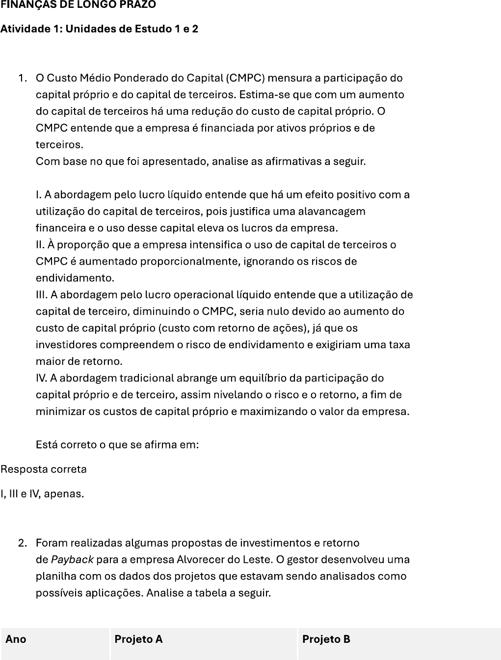 <p>FINANÇAS DE LONGO PRAZO Atividade 1: Unidades de Estudo 1 e 2 1. Custo Médio Ponderado do Capital (CMPC) mensura a participação do capital próprio e do capital de terceiros. Estima-se que com um aumento do capital de terceiros há uma redução do custo de capital próprio. O CMPC entende que a empresa é financiada por ativos próprios e de terceiros. Com base no que foi apresentado, analise as afirmativas a seguir. I. A abordagem pelo lucro líquido entende que há um efeito positivo com a utilização do capital de terceiros, pois justifica uma alavancagem financeira e o uso desse capital eleva os lucros da empresa. II. À proporção que a empresa intensifica o uso de capital de terceiros o CMPC é aumentado proporcionalmente, ignorando os riscos de endividamento. III. A abordagem pelo lucro operacional líquido entende que a utilização de capital de terceiro, diminuindo o CMPC, seria nulo devido ao aumento do custo de capital próprio (custo com retorno de ações), já que os investidores compreendem o risco de endividamento e exigiriam uma taxa maior de retorno. IV. A abordagem tradicional abrange um equilíbrio da participação do capital próprio e de terceiro, assim nivelando o risco e o retorno, a fim de minimizar os custos de capital próprio e maximizando o valor da empresa. Está correto o que se afirma em: Resposta correta I, III e IV, apenas. 2. Foram realizadas algumas propostas de investimentos e retorno de Payback para a empresa Alvorecer do Leste. gestor desenvolveu uma planilha com os dados dos projetos que estavam sendo analisados como possíveis aplicações. Analise a tabela a seguir. Ano Projeto A Projeto B</p><p>0 (75.000) (150.000) 1 28.000 48.000 2 25.000 52.000 3 15.000 25.000 4 32.000 44.0000 Fonte: Elaborada pela autora. Com base na tabela apresentada, assinale a alternativa que indica os projetos mais viáveis para serem adotados na empresa. Resposta correta: Projetos B e D. 3. Leia o trecho a seguir. A TIR pode conter alguns problemas, como a presença de múltiplas . Podendo existir devido a alterações de sinais entre os Isto é, em determinado momento o fluxo pode estar positivo e em outro, negativo. Entretanto, a soluciona essa questão e proporciona uma taxa de retorno mais precisa. Assinale a alternativa que preencha correta e sequencialmente as lacunas. Resposta correta: Taxas de retorno, fluxos de caixa, TIR-M. 4. dono da empresa Moraes e CIA LTDA cogita a possibilidade de fazer um investimento inicial de R$85.000,00 e quer proporcionar uma entrada de caixa de R$ 7.500,00 por ano em um período de 15 anos. Assinale a alternativa, a seguir, que mostra quanto tempo levará para se obter lucro nessa empresa. Resposta correta: 11,3 anos. 5. Leia o trecho a seguir. A produz um percentual da rentabilidade que facilita a compreensão sobre o retorno investido, quando contraposto ao , no qual evidencia um , o que dificulta o entendimento pois a taxa de retorno do investimento não é conhecida. Entretanto, a taxa</p><p>interna de retorno mostra restrições e distinções em relação ao valor presente líquido, que precisam ser estudadas para optar entre as alternativas de com melhores resultados. Assinale a alternativa que preenche correta e sequencialmente as lacunas. Resposta correta: TIR, VPL, valores absolutos, investimento. 6. Leia o trecho a seguir. "Um projeto de investimento convencional apresenta desembolsos, na fase inicial e recebimentos, nos períodos futuros. Claro que para haver retorno sobre o investimento, será necessário que o total das entradas de caixa supere o das saídas. Dessa forma, admitida uma taxa de juros mínima aceitável pelo investidor, denominada Taxa Mínima de Atratividade (TMA), o projeto de investimento terá condições de ser aceito". BARBIERI, J. C.; ÁLVARES, A. C. T.; MACHLINE, C. Taxa Interna de Retorno: controvérsias e interpretações. Revista GEPROS, n. 4, p. 131, 2007. Nesse sentido, considere a taxa mínima de atratividade e analise as afirmativas a seguir. I. A TIR sempre deverá ser menor do que a TMA. II. Por conta da aversão ao risco de cada investidor, a TMA é única para cada indivíduo. III. A TMA pode ser tratada como uma taxa de retorno, isto é, a TMA irá influir diretamente no nível da TIR. Está correto o que se afirma em: II, apenas. 7. Método da Taxa de Retorno Incremental é uma variação da TIR e deve ser utilizada para comparar alternativas de investimentos iniciais distintos. Portanto, a TIR incremental se refere ao incremento de receita dos investimentos em relação a outros investimentos. Nesse sentido, considere a Taxa de Retorno Incremental e analise as afirmativas a seguir. I. A TIR incremental traz os fluxos de caixa ao valor presente. II. A TIR incremental deve ser utilizada ao se analisar projetos mutuamente exclusivos, isto é, quando o fato de se executar um projeto irá prejudicar os benefícios do outro.</p><p>III. A TIR incremental apresenta resultados associados entre os projetos, ou seja, os aumentos ou diminuições nos fluxos de caixa de um acompanham as variações do outro na mesma direção. Está correto o que se afirma em: II, apenas. 8. A teoria denominada Modigliani-Miller se baseia em uma percepção de que estrutura de capital é irrelevante, isto é, não tem importância e, portanto, compreende alguns pressupostos na concepção dessa teoria. Acerca desses pressupostos, assinale a alternativa correta. Está correto o que se afirma em: Inexistência de custos de fricção de mercado: não se considera custos de impostos, custos de transação e custo de falência. 9. Um projeto só é válido quando ele gera lucro. Esse lucro é o aumento de suas receitas e diminuição dos custos de produção, porém precisamos saber que, para um projeto gerar lucro, é necessário avaliar suas capacidades. Para isso, alguns métodos entram em ação, objetivando trazer entendimento a respeito do comportamento dos investimentos. Com base no texto apresenta