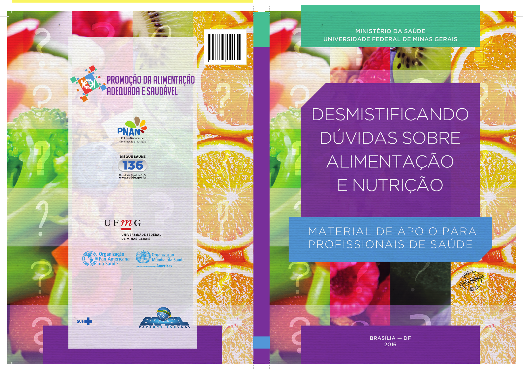 <p>DESMISTIFICANDO</p><p>DÚVIDAS SOBRE</p><p>ALIMENTAÇÃO</p><p>E NUTRIÇÃO</p><p>MATERIAL DE APOIO PARA</p><p>PROFISSIONAIS DE SAÚDE</p><p>MINISTÉRIO DA SAÚDE</p><p>UNIVERSIDADE FEDERAL DE MINAS GERAIS</p><p>BRASÍLIA — DF</p><p>2016</p><p>D</p><p>E</p><p>S</p><p>M</p><p>IS</p><p>T</p><p>IF</p><p>IC</p><p>A</p><p>N</p><p>D</p><p>O</p><p>D</p><p>Ú</p><p>V</p><p>ID</p><p>A</p><p>S</p><p>S</p><p>O</p><p>B</p><p>R</p><p>E</p><p>A</p><p>L</p><p>IM</p><p>E</p><p>N</p><p>T</p><p>A</p><p>Ç</p><p>Ã</p><p>O</p><p>E</p><p>N</p><p>U</p><p>T</p><p>R</p><p>IÇ</p><p>Ã</p><p>O</p><p>9 7 8 8 5 3 3 4 2 4 0 9 8</p><p>ISBN 978-85-334-2409-8</p><p>Biblioteca Virtual em Saúde do Ministério da Saúde</p><p>www.saude.gov.br/bvs</p><p>MINISTÉRIO DA</p><p>SAÚDE</p><p>DESMISTIFICANDO</p><p>DÚVIDAS SOBRE</p><p>ALIMENTAÇÃO</p><p>E NUTRIÇÃO</p><p>MATERIAL DE APOIO PARA</p><p>PROFISSIONAIS DE SAÚDE</p><p>MINISTÉRIO DA SAÚDE</p><p>UNIVERSIDADE FEDERAL DE MINAS GERAIS</p><p>BRASÍLIA — DF</p><p>2016</p><p>___________________________________________________________________________________________________</p><p>Brasil. Ministério da Saúde.</p><p>Desmistificando dúvidas sobre alimentação e nutrição : material de apoio para profissionais de saúde / Ministério da Saúde,</p><p>Universidade Federal de Minas Gerais. – Brasília : Ministério da Saúde, 2016.</p><p>164 p. : il.</p><p>ISBN 978-85-334-2409-8</p><p>1. Alimentação e Nutrição. 2. Frutas. 3. Hortaliças. I. Título. II. Universidade Federal de Minas Gerais.</p><p>CDU 641.1</p><p>____________________________________________________________________________________________________</p><p>Catalogação na fonte – Coordenação-Geral de Documentação e Informação – Editora MS – OS 2016/0017</p><p>Título para indexação:</p><p>Demystifying questions about food and nutrition: material support for health professionals</p><p>2016 Ministério da Saúde. Universidade Federal de Minas Gerais.</p><p>Esta obra é disponibilizada nos termos da Licença Creative Commons – Atribuição – Não</p><p>Comercial – Compartilhamento pela mesma licença 4.0 Internacional. É permitida a repro-</p><p>dução parcial ou total desta obra, desde que citada a fonte.</p><p>A coleção institucional do Ministério da Saúde pode ser acessada, na íntegra, na Biblioteca Virtual em Saúde do Ministério da</p><p>Saúde: <www.saude.gov.br/bvs>.</p><p>Tiragem: 1ª edição – 2016 – 5.000 exemplares</p><p>Elaboração, distribuição e informações:</p><p>MINISTÉRIO DA SAÚDE</p><p>Secretaria de Atenção à Saúde</p><p>Departamento de Atenção Básica</p><p>Edifício Premium, SAF Sul, Quadra 2</p><p>Lotes 5/6, bloco II, subsolo</p><p>CEP: 70070-600 – Brasília/DF</p><p>Tel.: (61) 3315-9031</p><p>Site: dab.saude.gov.br</p><p>E-mail: dab@saude.gov.br</p><p>UNIVERSIDADE FEDERAL DE MINAS GERAIS</p><p>Escola de Enfermagem</p><p>Departamento de Nutrição</p><p>Av. Prof. Alfredo Balena, 190, Bairro Santa Efigênia</p><p>CEP: 30130-100 – Belo Horizonte/MG</p><p>Site: www.ufmg.br/</p><p>Coordenação técnica geral:</p><p>Michele Lessa de Oliveira – Coordenação-Geral de</p><p>Alimentação e Nutrição do Ministério da Saúde</p><p>Elaboração de texto:</p><p>Aline Cristine Souza Lopes – Universidade Federal de Minas</p><p>Gerais</p><p>Caroline Schilling Soares – Secretaria Municipal de Saúde</p><p>de Belo Horizonte</p><p>Mariana Carvalho de Menezes – Universidade Federal de</p><p>Minas Gerais</p><p>Patrícia Pinheiro de Freitas – Universidade Federal de Minas</p><p>Gerais</p><p>Colaboração:</p><p>Ana Carolina Feldenheimer da Silva – Organização Pan-</p><p>-Americana da Saúde</p><p>Ana Lucia Sousa Pinto – Coordenação-Geral de Alimentação</p><p>e Nutrição do Ministério da Saúde</p><p>Ana Luisa Souza de Paiva – Coordenação-Geral de</p><p>Alimentação e Nutrição do Ministério da Saúde</p><p>Gisele Ane Bortolini – Coordenação-Geral de Alimentação e</p><p>Nutrição do Ministério da Saúde</p><p>Kimielle Cristina Silva – Coordenação-Geral de Alimentação</p><p>e Nutrição do Ministério da Saúde</p><p>Mônica Rocha Gonçalves – Coordenação-Geral de</p><p>Alimentação e Nutrição do Ministério da Saúde</p><p>Renata Guimarães Mendonça de Santana – Coordenação-</p><p>-Geral de Alimentação e Nutrição do Ministério da Saúde</p><p>Patrícia Constante Jaime – Universidade Estadual de São</p><p>Paulo</p><p>Janete dos Reis Coimbra – Secretaria Municipal de Saúde</p><p>de Belo Horizonte</p><p>Nathália Luiza Ferreira – Universidade Federal de Minas</p><p>Gerais</p><p>Raquel de Deus Mendonça – Universidade Federal de Minas</p><p>Gerais</p><p>Rayane Jeniffer Rodrigues Marques – Universidade Federal</p><p>de Minas Gerais</p><p>Capa, projeto gráfico e diagramação:</p><p>Firma Comunicação e Design</p><p>Editora responsável:</p><p>MINISTÉRIO DA SAÚDE</p><p>Secretaria-Executiva</p><p>Subsecretaria de Assuntos Administrativos</p><p>Coordenação-Geral de Documentação e Informação</p><p>Coordenação de Gestão Editorial</p><p>SIA, Trecho 4, lotes 540/610</p><p>CEP: 71200-040 – Brasília/DF</p><p>Tels.: (61) 3315-7790 / 3315-7794</p><p>Fax: (61) 3233-9558</p><p>Site: http://editora.saude.gov.br</p><p>E-mail: editora.ms@saude.gov.br</p><p>Equipe editorial:</p><p>Normalização: Delano de Aquino Silva</p><p>Revisão: Tatiane Souza e Khamila Silva</p><p>Ficha Catalográfica</p><p>Impresso no Brasil / Printed in Brazil</p><p>LISTA DE TABELAS</p><p>TABELA 1</p><p>Composição de diferentes tipos de óleos vegetais por 100 gramas 55</p><p>TABELA 2</p><p>Composição de alimentos embutidos por 100 gramas 73</p><p>TABELA 3</p><p>Composição de diferentes tipos de chocolates por 100 gramas 75</p><p>TABELA 4</p><p>Características dos principais edulcorantes 103</p><p>TABELA 5</p><p>Composição nutricional de quatro tipos de refeições</p><p>consumidas no horário do ja
