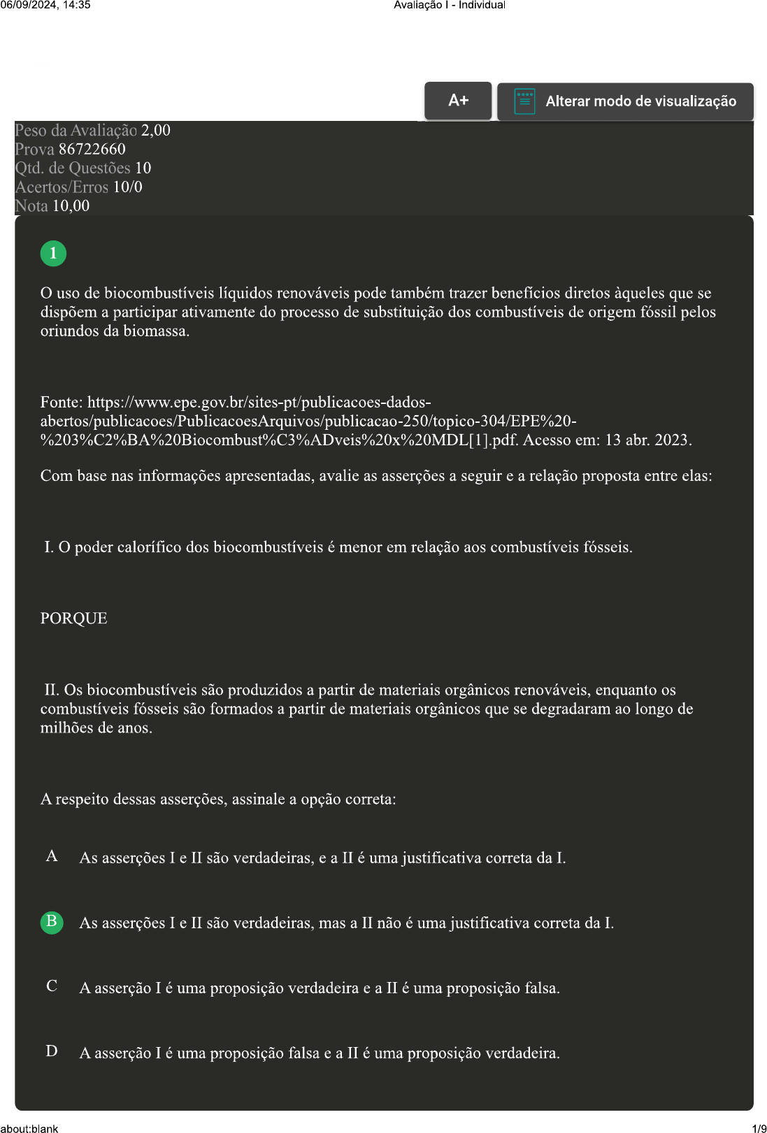 <p>06/09/2024, 14:35 Avaliação - Individual A+ Alterar modo de visualização Peso da Avaliação 2,00 Prova 86722660 Qtd. de Questões 10 Acertos/Erros 10/0 Nota 10,00 1 O uso de biocombustíveis líquidos renováveis pode também trazer benefícios diretos àqueles que se dispõem a participar ativamente do processo de substituição dos combustíveis de origem fóssil pelos oriundos da biomassa. Fonte: https://www.epe.gov.br/sites-pt/publicacoes-dados- em: 13 abr. 2023. Com base nas informações apresentadas, avalie as asserções a seguir e a relação proposta entre elas: I. O poder calorífico dos biocombustíveis é menor em relação aos combustíveis PORQUE II. Os biocombustíveis são produzidos a partir de materiais orgânicos renováveis, enquanto os combustíveis fósseis são formados a partir de materiais orgânicos que se degradaram ao longo de milhões de anos. A respeito dessas asserções, assinale a opção correta: A As asserções I e II são verdadeiras, e a II é uma justificativa correta da I. B As asserções I e II são verdadeiras, mas a II não é uma justificativa correta da I. C A asserção I é uma proposição verdadeira e a II é uma proposição falsa D A asserção I é uma proposição falsa e a II é uma proposição verdadeira. about:blank 1/9</p><p>06/09/2024, 14:35 Avaliação - Individual 2 A bioenergia corresponde à energia produzida a partir da biomassa, assim como os Isso inclui álcool combustível, produzido a partir de cana-de-acúcar e usado como combustível nos automóveis. O biodiesel é definido pela American Society for Testing Materials (ASTM) como um combustível líquido sintético, originário de matéria-prima renovável e constituído por mistura de ésteres alquílicos, de ácidos graxos de cadeias longas, derivados de óleos vegetais ou gorduras animais. Fonte: PHILIPPI A.; REIS, L. B. dos. Energia e sustentabilidade. São Paulo: Manole, 2016. Sobre os processos de produção e uso do biodiesel e etanol, analise as afirmativas a seguir: I. O biodiesel é produzido a partir de óleos vegetais e gorduras animais, enquanto etanol é produzido a partir de açúcares fermentáveis. II. O biodiesel emite menos gases de efeito estufa do que etanol. III. O biodiesel tem um conteúdo energético maior que etanol. É correto que se afirma em: A II e III, apenas. B I e II, apenas. C I, apenas. D III, apenas. 3 Desde meados dos anos 2000, papel dos biocombustíveis na dinâmica global dos preços e da oferta de alimentos tem sido objeto de considerável discussão e atenção. Por trás deste aparente dilema está a questão do uso e disponibilidade de recursos escassos em alguns países. Esta não é, entretanto, a realidade do Brasil. about:blank 2/9</p><p>06/09/2024, 14:35 Avaliação - Individual Fonte: EPE EMPRESA DE PESQUISA ENERGÉTICA. Nota Técnica EPE/DPG/SDB/2022/02. Análise de Conjuntura dos Biocombustíveis - Ano 2020, 2021. Disponível em: https://www.epe.gov.br/sites-pt/publicacoes-dados- 3_Analise_de_Conjuntura_dos_Biocombustiveis_ano_2020.pdf.Acesso em: 13 abr. 2023. Com a crescente preocupação em relação à sustentabilidade e às mudanças climáticas, os biocombustíveis vêm sendo considerados como uma alternativa aos combustíveis Entretanto, além da preocupação ambiental, a viabilidade econômica também é um fator importante a ser considerado na adoção dos Nesse sentido, sobre os principais fatores que afetam a viabilidade econômica dos biocombustíveis, assinale a alternativa CORRETA: A Tipo de solo, clima, volume de produção e legislação ambiental. B Localização geográfica, prazo de validade, densidade energética e tamanho das plantações. C Rendimento energético, resistência a pragas, política tributária e perfil do consumidor. D Matéria-prima, tecnologia empregada, custos de produção e preço de mercado. 4 As decisões políticas visando à estabilidade da inflação contribuíram fortemente para a perda de competitividade do etanol hidratado relativo à gasolina a partir de 2011, ano em que a relação entre os preços dos dois combustíveis ultrapassou a barreira dos 70%, muito em função de adoção mecanismos tributários favoráveis ao etanol. Fonte: NUNES C. M. Política Nacional de Biocombustíveis: avaliação ex post do impacto dos instrumentos regulatórios do RenovaBio na expansão do etanol na matriz energética brasileira. 2022. Monografia (Especialização em Controle da Desestatização e da Regulação) Instituto Serzedello Corrêa, Escola Superior do Tribunal de Contas da União, Brasília, DF, 2022. Com relação às políticas e legislações existentes no Brasil para os biocombustíveis, analise as afirmativas a seguir: I. O Programa Nacional de Produção e Uso do Biodiesel (PNPB) foi criado em 2017 com objetivo de promover a importação e uso de biocombustíveis no país. II. O RenovaBio é um programa do governo brasileiro que tem como objetivo expandir a produção de biocombustíveis e reduzir as emissões de gases de efeito estufa no país. about:blank 3/9</p><p>06/09/2024, 14:35 Avaliação - Individual III. O RenovaBio estabelece metas de redução de emissões de gases de efeito estufa para os produtores de biocombustíveis, que podem ser convertidas em créditos de descarbonização (CBIOs). IV. Os CBIOs são comercializados no mercado financeiro e são uma forma de incentivar os produtores de biocombustíveis a reduzir suas emissões de gases de efeito estufa. É correto que se afirma em: A II e III, apenas. B II, III e IV, apenas. C I e IV, apenas. D III e IV, apenas. 5 A Política Nacional de Biocombustíveis (RenovaBio) iniciou sua operacionalização em abril de 2020 com a inserção do CBIO em mercado organizado, tendo enfrentado inúmeros desafios, que trouxeram maior conhecimento para os agentes da cadeia de combustíveis. O ano de 2021 foi seu primeiro ciclo completo, ainda com a realização de alguns ajustes e internalização do aprendi