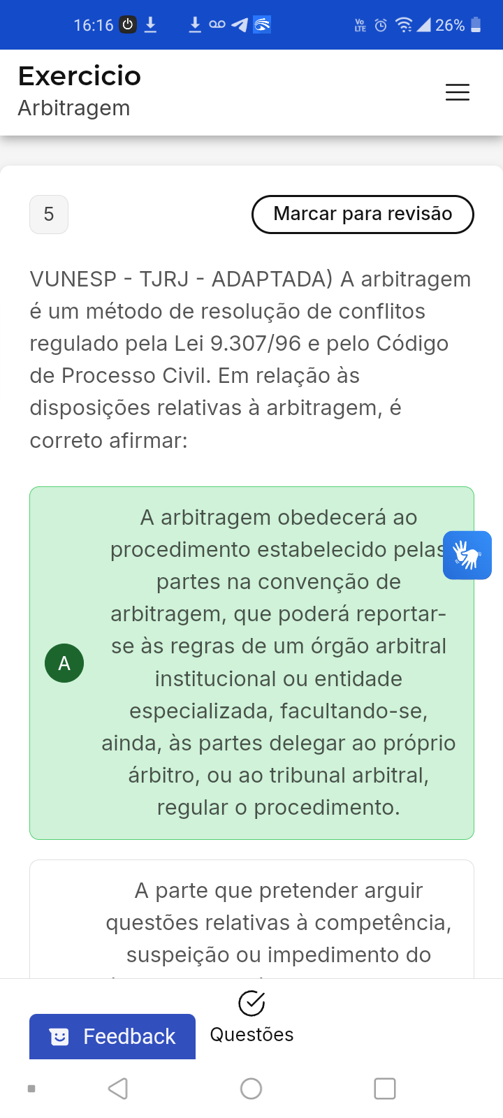 <p>16:16 16 Vo LTE L 26% Exercicio Arbitragem 5 Marcar para revisão VUNESP - TJRJ - ADAPTADA) A arbitragem é um método de resolução de conflitos regulado pela Lei 9.307/96 e pelo Código de Processo Civil. Em relação às disposições relativas à arbitragem, é correto afirmar: A arbitragem obedecerá ao procedimento estabelecido pelas partes na convenção de arbitragem, que poderá reportar- se às regras de um órgão arbitral A institucional ou entidade especializada, facultando-se, ainda, às partes delegar ao próprio árbitro, ou ao tribunal arbitral, regular o procedimento. A parte que pretender arguir questões relativas à competência, suspeição ou impedimento do Feedback Questões</p>