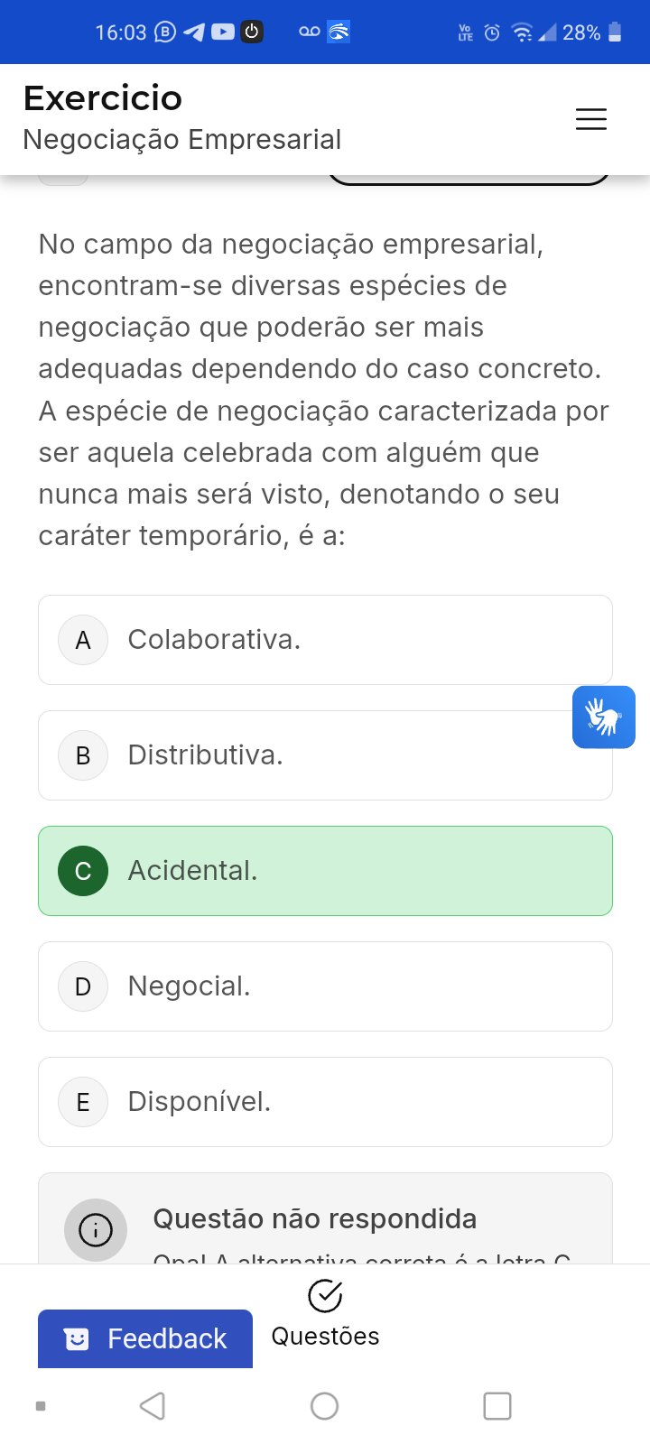 <p>16:03 B Vo LTE L 28% Exercicio Negociação Empresarial No campo da negociação empresarial, encontram-se diversas espécies de negociação que poderão ser mais adequadas dependendo do caso concreto. A espécie de negociação caracterizada por ser aquela celebrada com alguém que nunca mais será visto, denotando o seu caráter temporário, é a: A Colaborativa. B Distributiva. C Acidental. D Negocial. E Disponível. i Questão não respondida Feedback Questões</p>