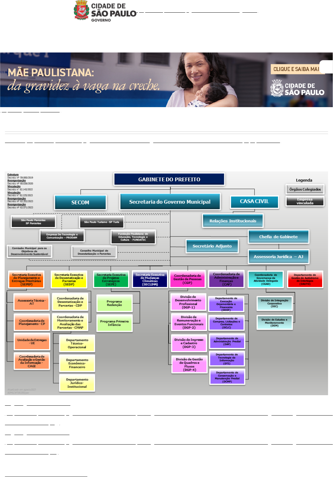 <p>06/11/2023, 19:16 Organograma | Secretaria de Governo Municipal | Prefeitura da Cidade de São Paulo</p><p>https://www.prefeitura.sp.gov.br/cidade/secretarias/governo/acesso_a_informacao/index.php?p=177964 1/2</p><p>(https://www.prefeitura.sp.gov.br/cidade/secretarias/governo/)</p><p>Organograma</p><p>< voltar (http://www.prefeitura.sp.gov.br/cidade/secretarias/governo/acesso_a_informacao/index.php?p=177963)</p><p>Organograma_SGM_PNG</p><p>(https://www.prefeitura.sp.gov.br/cidade/secretarias/upload/governo/acesso_a_informacao/SGM_CAF_elrog/2023/Org%20SGM%20-</p><p>%2002_08_2023.png)</p><p>Organograma_SGM_PDF</p><p>(https://www.prefeitura.sp.gov.br/cidade/secretarias/upload/governo/acesso_a_informacao/SGM_CAF_elrog/2023/Org%20SGM%20-</p><p>%2002_08_2023.pdf)</p><p>ESTRUTURA ADMINISTRATIVA</p><p>(https://bit.ly/s-mae-paulistana)</p><p>https://www.prefeitura.sp.gov.br/cidade/secretarias/governo/</p><p>https://www.prefeitura.sp.gov.br/cidade/secretarias/governo/</p><p>http://www.prefeitura.sp.gov.br/cidade/secretarias/governo/acesso_a_informacao/index.php?p=177963</p><p>http://www.prefeitura.sp.gov.br/cidade/secretarias/governo/acesso_a_informacao/index.php?p=177963</p><p>https://www.prefeitura.sp.gov.br/cidade/secretarias/upload/governo/acesso_a_informacao/SGM_CAF_elrog/2023/Org%20SGM%20-%2002_08_2023.png</p><p>https://www.prefeitura.sp.gov.br/cidade/secretarias/upload/governo/acesso_a_informacao/SGM_CAF_elrog/2023/Org%20SGM%20-%2002_08_2023.png</p><p>https://www.prefeitura.sp.gov.br/cidade/secretarias/upload/governo/acesso_a_informacao/SGM_CAF_elrog/2023/Org%20SGM%20-%2002_08_2023.png</p><p>https://www.prefeitura.sp.gov.br/cidade/secretarias/upload/governo/acesso_a_informacao/SGM_CAF_elrog/2023/Org%20SGM%20-%2002_08_2023.pdf</p><p>https://www.prefeitura.sp.gov.br/cidade/secretarias/upload/governo/acesso_a_informacao/SGM_CAF_elrog/2023/Org%20SGM%20-%2002_08_2023.pdf</p><p>https://www.prefeitura.sp.gov.br/cidade/secretarias/upload/governo/acesso_a_informacao/SGM_CAF_elrog/2023/Org%20SGM%20-%2002_08_2023.pdf</p><p>https://bit.ly/s-mae-paulistana</p><p>https://bit.ly/s-mae-paulistana</p><p>https://bit.ly/s-mae-paulistana</p><p>https://bit.ly/s-mae-paulistana</p><p>06/11/2023, 19:16 Organograma | Secretaria de Governo Municipal | Prefeitura da Cidade de São Paulo</p><p>https://www.prefeitura.sp.gov.br/cidade/secretarias/governo/acesso_a_informacao/index.php?p=177964 2/2</p><p>Secretário Municipal</p><p>Edson Aparecido dos Santos</p><p>Secretário Adjunto</p><p>Clodoaldo Pelissioni</p><p>Chefe de Gabinete</p><p>Armando Luis Palmieri</p><p>Assessoria Jurídica - AJ</p><p>Tiago Rossi</p><p>Secretário Executivo de Projetos Estratégicos</p><p>Edsom Ortega Marques</p><p>Secretária Executiva de Desestatização e Parcerias</p><p>Paulo José Galli</p><p>Secretário Executivo de Mudanças Climáticas</p><p>Gilberto Tanos Natalini</p><p>Secretário Executivo de Planejamento e Entregas Prioritárias</p><p>Fernando Barrancos Chucre</p><p>Coordenadoria de Governança da Atividade Delegada</p><p>Celso Luiz Pinheiro</p><p>Coordenadoria de Administração e Finanças - CAF</p><p>Rita de Cássia Emery Sachse</p><p>Coordenadoria de Gestão de Pessoas - CGP</p><p>Marcia Harumi Kurokawa Gushiken</p><p>Secretarias</p><p>Selecione</p><p>Subprefeituras</p><p>Selecione</p><p>Outros Órgãos</p><p>Selecione</p><p>Secretaria de Governo Municipal</p><p>Ed. Matarazzo - Viaduto do Chá, 15 Telefone: (11) 3113-8000</p><p>Contatos</p><p>156</p><p>(https://call.icom-libras.com.br/smped/autentica?uId=ee999750d403b59da5d5678f76c34977dd080a58dbf0772ff137d668e2f362fe&svId=6a144745-</p><p>22d2-408c-9649-356872449766&type=video&preCall=true)</p><p>(http://selodigital.imprensaoficial.com.br/validacao/SMPED/0119ba3e2aae687b1c)</p><p>https://call.icom-libras.com.br/smped/autentica?uId=ee999750d403b59da5d5678f76c34977dd080a58dbf0772ff137d668e2f362fe&svId=6a144745-22d2-408c-9649-356872449766&type=video&preCall=true</p><p>https://call.icom-libras.com.br/smped/autentica?uId=ee999750d403b59da5d5678f76c34977dd080a58dbf0772ff137d668e2f362fe&svId=6a144745-22d2-408c-9649-356872449766&type=video&preCall=true</p><p>https://call.icom-libras.com.br/smped/autentica?uId=ee999750d403b59da5d5678f76c34977dd080a58dbf0772ff137d668e2f362fe&svId=6a144745-22d2-408c-9649-356872449766&type=video&preCall=true</p><p>http://selodigital.imprensaoficial.com.br/validacao/SMPED/0119ba3e2aae687b1c</p>