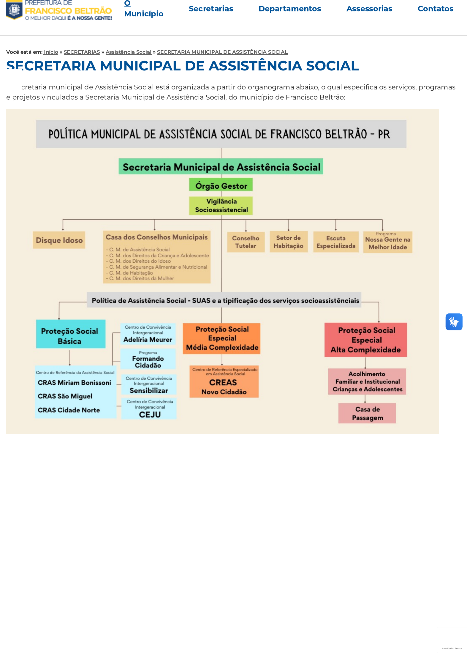 <p>06/11/2023, 19:11 SECRETARIA MUNICIPAL DE ASSISTÊNCIA SOCIAL | Prefeitura de Francisco Beltrão</p><p>https://franciscobeltrao.pr.gov.br/secretarias/assistencia-social/a-secretaria/ 1/7</p><p>O</p><p>Município</p><p>Secretarias Departamentos Assessorias Contatos</p><p>Você está em: Início » SECRETARIAS » Assistência Social » SECRETARIA MUNICIPAL DE ASSISTÊNCIA SOCIAL</p><p>SECRETARIA MUNICIPAL DE ASSISTÊNCIA SOCIAL</p><p>A Secretaria municipal de Assistência Social está organizada a partir do organograma abaixo, o qual especi�ca os serviços, programas</p><p>e projetos vinculados a Secretaria Municipal de Assistência Social, do município de Francisco Beltrão:</p><p>Privacidade - Termos</p><p>https://franciscobeltrao.pr.gov.br/index.php</p><p>https://franciscobeltrao.pr.gov.br/index.php</p><p>https://franciscobeltrao.pr.gov.br/o-municipio/</p><p>https://franciscobeltrao.pr.gov.br/o-municipio/</p><p>https://franciscobeltrao.pr.gov.br/secretarias/</p><p>https://franciscobeltrao.pr.gov.br/departamentos/</p><p>https://franciscobeltrao.pr.gov.br/assessorias/</p><p>https://franciscobeltrao.pr.gov.br/o-municipio/contatos/</p><p>https://franciscobeltrao.pr.gov.br/</p><p>https://franciscobeltrao.pr.gov.br/secretarias/</p><p>https://franciscobeltrao.pr.gov.br/secretarias/assistencia-social/</p><p>https://franciscobeltrao.pr.gov.br/secretarias/assistencia-social/a-secretaria/</p><p>https://www.google.com/intl/pt-BR/policies/privacy/</p><p>https://www.google.com/intl/pt-BR/policies/terms/</p><p>javascript:void(0);</p><p>06/11/2023, 19:11 SECRETARIA MUNICIPAL DE ASSISTÊNCIA SOCIAL | Prefeitura de Francisco Beltrão</p><p>https://franciscobeltrao.pr.gov.br/secretarias/assistencia-social/a-secretaria/ 2/7</p><p>javascript:void(0);</p><p>06/11/2023, 19:11 SECRETARIA MUNICIPAL DE ASSISTÊNCIA SOCIAL | Prefeitura de Francisco Beltrão</p><p>https://franciscobeltrao.pr.gov.br/secretarias/assistencia-social/a-secretaria/ 3/7</p><p>Com o organograma, temos um panorama do trabalho realizado pela secretaria. A seguir trazemos a descrição de cada um destes</p><p>serviços:</p><p>javascript:void(0);</p><p>06/11/2023, 19:11 SECRETARIA MUNICIPAL DE ASSISTÊNCIA SOCIAL | Prefeitura de Francisco Beltrão</p><p>https://franciscobeltrao.pr.gov.br/secretarias/assistencia-social/a-secretaria/ 4/7</p><p>ÓRGÃO GESTOR</p><p>Secretária Municipal de Assistencia Social: Nádia Bonatto</p><p>Coordenadora da SMAS: Flávia Bedin Tognon</p><p>Planejamento e orçamento: Ritinha Biscoli</p><p>Setor de compras e licitações: Rejane Eichenberg e Emmanuel Tornquist Ferreira de Fama</p><p>Vigilância Socioassistencial:</p><p>Flávia Bedin Tognon: Economista Doméstico</p><p>Sueza Oldoni: Assistente Social</p><p>Daniele Fagundes: Psicóloga</p><p>Pâmela Ferreira da Cruz: Economista Doméstico e Supervisora do Programa Criança Feliz</p><p>Organização administrativa: Clarice Spada</p><p>Recepção: Lorene Cavasini</p><p>Motorista: Cleverson Lourenço</p><p>Endereço: Rua Octaviano Teixeira dos Santos, n° 1306, fundos, Centro</p><p>javascript:void(0);</p><p>06/11/2023, 19:11 SECRETARIA MUNICIPAL DE ASSISTÊNCIA SOCIAL | Prefeitura de Francisco Beltrão</p><p>https://franciscobeltrao.pr.gov.br/secretarias/assistencia-social/a-secretaria/ 5/7</p><p>Telefone: 3520-2194</p><p>E-mail: assistenciasocial@franciscobeltrao.com.br</p><p>A Secretaria Municipal de Assistência Social – SMAS é o Órgão Gestor municipal da Política Pública de Assistência Social em Francisco</p><p>Beltrão. É responsável por promover a organização, articulação e coordenação do sistema municipal de assistência social, administrar</p><p>os recursos orçamentários com vistas à oferta de serviços, programas, projetos e benefícios de assistência social desenvolvidos no</p><p>âmbito governamental. Dentre as ações, destacam-se:</p><p>– Gerenciar o Fundo Municipal de Assistência Social – FMAS, Fundo Municipal da Criança e Adolescente – FMCA e Fundo Municipal do</p><p>Idoso – FMI com apoio das secretarias a�ns;</p><p>– Realizar a prestação de contas dos recursos repassados à Secretaria Municipal de Assistência Social;</p><p>– Preencher os instrumentos de gestão Federal no SUAS Web;</p><p>– Preencher os instrumentos de gestão Estadual;</p><p>– Elaborar convênios com a rede socioassistencial;</p><p>– Prestar orientações à rede socioassistencial em matéria de convênios;</p><p>– Participar dos processos de prestações de contas dos convênios �rmados com a rede sócioassistencial, referentes aos recursos</p><p>repassados pelo Município e Governo Federal.</p><p>– Organizar e coordenar a rede de serviços socioassistenciais de Proteção Social Básica e Especial no âmbito do SUAS;</p><p>– Acompanhar a execução dos serviços de proteção social básica e especial da rede socioassistencial governamental;</p><p>– Garantir as condições adequadas para o funcionamento das unidades de serviços sócioassistencias, quanto a estrutura física,</p><p>veículos, equipamentos e recursos humanos, aprimorando os equipamento e serviços de acordo com os indicadores de</p><p>monitoramento e avaliação;</p><p>– Construir instrumentos de gestão da Política Municipal de Assistência Social, de acordo com a necessidade, visando aprimoramento</p><p>da gestão e dos serviços, programas e projetos de assistência social;</p><p>– Participar da construção/atualização dos diagnósticos sociais da área de Assistência Social e acompanhar o mapeamento dos</p><p>usuários da rede socioassistencial, junto à Vigilância Sócioassistencial;</p><p>– Realizar o processo de monitoramento e avaliação do SUAS no âmbito municipal da Proteção Social Básica e Especial, junto a</p><p>Vigilância Sócioassistencial;</p><p>– Elaborar e monitorar a execução dos Planos Municipais junto a Vigilância Sócoassistencial, aos respectivos conselhos vinculados a</p><p>SMAS e em consonância com Plano Pl