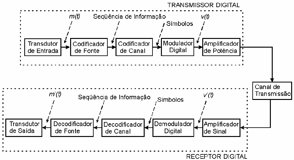 <p>Comunicação Digital Codificação de Canal</p><p>Codificação de Canal 1</p><p>Codificação de Canal</p><p>Comunicação Digital Codificação de Canal</p><p>Codificação de Canal 2</p><p>Codificação de canal</p><p>• Quando informação digital é enviada através de um canal de transmissão, ruído e interferência inerentes a qualquer canal</p><p>prático degradam o sinal de forma que os dados recebidos contêm erros.</p><p>• O usuário do sistema de transmissão digital geralmente estabelece uma taxa de erro máxima aceitável – uma mensagem</p><p>errada em 610×1 mensagens recebidas, por exemplo (i.e., uma taxa de erro de 6−10×1 ) – acima da qual os dados recebidos</p><p>não são considerados utilizáveis pelo usuário. Esta taxa de erro máxima aceitável depende da informação que transita</p><p>pelo canal.</p><p>• A título de comparação, a taxa máxima de erro permitida para transmissão de voz através de telefonia celular é muito</p><p>maior do que a taxa exigida para transmissão de dados, por exemplo (porque, na pior das hipóteses, mesmo sob uma alta</p><p>taxa de erro e conseqüente distorção, o sistema auditivo humano é capaz de compreender o significado das frases pelo</p><p>contexto da conversa, o que já não acontece quando dois computadores trocam dados).</p><p>O Codificador de Canal é o responsável em um sistema digital por manter a taxa de erro dentro</p><p>de um limite máximo aceitável pelo usuário.</p><p>A possibilidade do uso de codificação para controlar com eficiência a taxa de erro de um sistema de comunicação digital foi</p><p>demonstrada por Shannon em 1948, através do denominado Teorema Fundamental de Shannon:</p><p>Se a taxa (= velocidade) de transmissão R [ ]sbits da informação a ser enviada pelo canal é menor que uma quantidade</p><p>C [ ]sbits denominada de Capacidade do Canal, então a comunicação através do canal pode ser estabelecida com</p><p>probabilidade de erro tão baixa quanto se deseje, através do uso de um código adequado para correção de erro.</p><p>Comunicação Digital Codificação de Canal</p><p>Codificação de Canal 3</p><p>Teorema Fundamental</p><p>de Shannon:</p><p>Se a taxa de transmissão R [ ]sbits ≤ capacidade do canal C [ ]sbits →</p><p>existe um código corretor de erro tal que a informação pode ser transmitida</p><p>através do canal com uma taxa de erro definida e baixa.</p><p>Lei de Shannon-Hartley:</p><p>⎟</p><p>⎠</p><p>⎞</p><p>⎜</p><p>⎝</p><p>⎛ +=≤</p><p>N</p><p>PBCR 1log2 [ ]sbits</p><p>• B é a largura de banda do canal em Hz ,</p><p>• P é a potência do sinal transmitido e</p><p>• N é a potência do ruído Gaussiano adicionado ao sinal no canal.</p><p>Em essência, o Teorema Fundamental de Shannon estabelece que a potência do sinal transmitido, a potência de ruído no</p><p>canal e a largura de banda do canal estabelecem um limite máximo para a taxa de transmissão R.</p><p>• Infelizmente, o Teorema Fundamental de Shannon apenas demonstra que, se CR ≤ existe um código</p><p>corretor de erro tal que a informação pode ser transmitida através do canal com uma taxa de erro</p><p>arbitrariamente baixa, mas não especifica como construir tal código corretor.</p><p>• Talvez a maior utilidade prática do Teorema Fundamental de Shannon seja demonstrar que para CR ></p><p>não é possível transmitir informação sem erro através do canal, mesmo que se utilize o mais</p><p>poderoso código corretor de erro que se possa conceber.</p><p>• É importante salientar que, não raro, o maior valor possível para a taxa de transmissão R é dado não</p><p>por C, mas sim, pela complexidade computacional do código corretor necessário para que aquele valor</p><p>de R possa ser alcançado.</p><p>Comunicação Digital Codificação de Canal</p><p>Codificação de Canal 4</p><p>4.1 Códigos Corretores de Erro</p><p>Vimos que o Teorema Fundamental de Shannon estabelece a existência de um código corretor de erro</p><p>tal que a informação pode ser transmitida através do canal de comunicação com uma taxa de erro</p><p>arbitrariamente baixa, caso a taxa de transmissão R [ ]sbits seja menor ou igual à capacidade do</p><p>canal C [bits/s].</p><p>Estudaremos agora como construir tais códigos.</p><p>Especificamente, estudaremos os membros mais importantes de duas grandes classes de códigos para</p><p>correção de erro:</p><p>os códigos de bloco e os códigos convolucionais.</p><p>É importante lembrar que o processo de correção de erros através de codificação/decodificação é realizado</p><p>no Codificador/Decodificador de Canal.</p><p>Comunicação Digital Codificação de Canal</p><p>Codificação de Canal 5</p><p>4.2 Códigos de Bloco</p><p>Podemos considerar um código de bloco de maneira semelhante àquela que adotamos para os códigos</p><p>compressores por entropia já estudados.</p><p>Ou seja, um código de bloco pode ser considerado como um operador {}⋅θ , tal que { }XθC = , onde:</p><p>{ } { }110 ,,, −== Mi xxxx LX é o conjunto de M possíveis mensagens ix a serem codificadas e</p><p>{ } { }110 ,,, −== Mi cccc LC é o conjunto de M possíveis palavras-código ic resultantes da codificação,</p><p>com 1,,1,0 −= Mi L .</p><p>O operador {}⋅θ efetua um mapeamento unívoco entre cada mensagem ix e a respectiva palavra-código ic .</p><p>O conjunto de caracteres do código ou alfabeto do código é o conjunto { }110 ,,, −= Daaa LΑ composto</p><p>por D elementos, de cuja composição são formadas cada mensagem e sua respectiva palavra-código (para</p><p>códigos binários { }1,0=Α ).</p><p>Comunicação Digital Codificação de Canal</p><p>Codificação de Canal 6</p><p>No contexto de códigos corretores de erro:</p><p>• Cada mensagem X∈ix é considerada como um vetor [ ]0121 )()( iikikii xxxxx L−−= de</p><p>k componentes, A∈ijx , 0,1,,2,1 L−−= kkj .</p><p>• Visto que os k componentes da i-ési