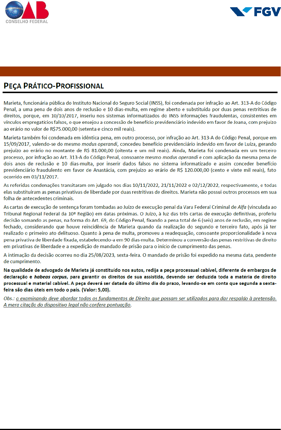 <p>ORDEM DOS ADVOGADOS DO BRASIL</p><p>XXXVIII Exame de Ordem Unificado</p><p>Prova Prático-Profissional Aplicada em 10/09/2023</p><p>ÁREA: DIREITO PENAL</p><p>Padrão de Resposta da Prova Prático-Profissional – XXXVIII Exame de Ordem Unificado Página 1 de 8</p><p>PADRÃO DE RESPOSTA – PEÇA PROFISSIONAL</p><p>Enunciado</p><p>ORDEM DOS ADVOGADOS DO BRASIL</p><p>XXXVIII Exame de Ordem Unificado</p><p>Prova Prático-Profissional Aplicada em 10/09/2023</p><p>ÁREA: DIREITO PENAL</p><p>Padrão de Resposta da Prova Prático-Profissional – XXXVIII Exame de Ordem Unificado Página 2 de 8</p><p>Gabarito Comentado</p><p>A hipótese narrada revela uma decisão judicial proferida no curso da execução penal, razão pela qual a</p><p>peça a ser apresentada é o agravo em execução, na forma do Art. 197 da LEP, direcionado ao Juízo da Vara</p><p>Federal Criminal de Alfa, a ser interposto no prazo de cinco dias, consoante enunciado nº 700 da súmula da</p><p>jurisprudência do STF ou Art. 586, do CPP. Deveria ser requerido efeito regressivo do recurso de agravo,</p><p>com base no Art. 589 do CPP, seguindo o rito do recurso em sentido estrito.</p><p>Em seguida, deveria a interposição ser acompanhada das respectivas razões, dirigidas ao Tribunal Regional</p><p>Federal da 10ª Região.</p><p>Sobre os pedidos, deveria ser requerido, em favor de Marieta, inicialmente, a aplicação da continuidade</p><p>delitiva entre todos os delitos que lhe foram imputados, na forma do Art. 71, caput, do CP.</p><p>De fato, a conduta atribuída a Marieta é exatamente a mesma (conforme é expressamente mencionado no</p><p>enunciado) e, pelas circunstâncias de tempo, lugar e maneira de execução, vê-se que todas as condutas</p><p>subsequentes devem ser reputadas continuação das anteriores. Portanto, a unificação de penas deve ser</p><p>realizada na forma do Art. 111, da LEP e do Art. 71, caput, do CP (continuidade delitiva), com a aplicação da</p><p>fração de aumento entre 1/6 a 2/3, de forma proporcional ao fato de haver 3 infrações idênticas, tendo em</p><p>vista que a vítima é a mesma em todos os delitos (o INSS).</p><p>Portanto, o regime prisional deve ser o aberto, na forma do Art. 33, § 2º, alínea c, do CP.</p><p>Ainda que assim não fosse, inadmissível a reconversão das penas restritivas de direito em privativa de</p><p>liberdade, pois as penas alternativas são compatíveis entre si, podem ser executadas de forma simultânea</p><p>ou sucessiva, não se justificando a reconversão por ausência de autorização legal, com aplicação dos Arts.</p><p>44, §§ 4º e 5º e 69, § 2º, do Código Penal e 181, § 1º, da LEP.</p><p>Em acréscimo, deve ser destacada a ausência de reincidência, pois, para a configuração da reincidência, é</p><p>necessário que o trânsito em julgado da condenação ocorra antes da prática do novo crime, na forma do</p><p>Art. 63, do CP, o que não ocorreu no caso narrado. Nesse caso, admite-se que, subsidiariamente, seja</p><p>defendida a fixação de regime semiaberto, na forma do Art. 33, § 2º, alínea b, do CP.</p><p>Quanto à pena de multa, a jurisprudência do Superior Tribunal de Justiça reconhece a aplicação da regra da</p><p>exasperação às penas de multa (Art. 71 do CP), afastando-se a aplicação do Art. 72 do CP ao caso concreto.</p><p>Alternativamente, admite-se com igual pontuação a aplicação da soma das penas de multa originárias, na</p><p>forma do Art. 72 do CP, sendo defeso ao Juízo de Execução promover nova aplicação de multa, em</p><p>desrespeito ao título executivo transitado em julgado.</p><p>Por fim, deve ser formulado pedido de conhecimento e provimento do recurso.</p><p>Ainda, deve ser postulada a imediata expedição de contramandado de prisão em favor de Marieta (ou</p><p>recolhimento do mandado de prisão).</p><p>Ao final, deve ser indicada a data de interposição do recurso no dia 1º de setembro de 2023 e, finalizada,</p><p>com local, data, advogado e OAB, sem identificação e sem numeração.</p><p>ORDEM DOS ADVOGADOS DO BRASIL</p><p>XXXVIII Exame de Ordem Unificado</p><p>Prova Prático-Profissional Aplicada em 10/09/2023</p><p>ÁREA: DIREITO PENAL</p><p>Padrão de Resposta da Prova Prático-Profissional – XXXVIII Exame de Ordem Unificado Página 3 de 8</p><p>Distribuição dos Pontos</p><p>ITEM PONTUAÇÃO</p><p>Petição de Interposição</p><p>1. Endereçamento: Juízo Federal da Vara Federal Criminal de Alfa (0,10). 0,00/0,10</p><p>2. Fundamento legal: Art. 197 da LEP (0,10). 0,00/0,10</p><p>3. Tempestividade: prazo de 5 dias (0,10), na forma da Súmula 700 do STF ou do</p><p>Art. 586 do CPP (0,10).</p><p>0,00/0,10/0,20</p><p>4. Pedido de retratação (0,20), na forma do Art. 589 do CPP (0,10). 0,00/0,20/0,30</p><p>Razões</p><p>5. Endereçamento: Tribunal Regional Federal da 10ª Região (0,10) 0,00/0,10</p><p>Mérito</p><p>6.1. Unificação de penas pela continuidade delitiva (0,35), na forma do Art. 71,</p><p>caput, do CP, ou Art. 111 da LEP (0,10), devendo ser aplicada a lógica do sistema</p><p>da exasperação (0,20).</p><p>0,00/0,20/0,30/0,35/</p><p>0,45/0,55/0,65</p><p>6.2. Tendo em vista a prática de delitos da mesma espécie (0,20), nas mesmas</p><p>circunstâncias de tempo, lugar e maneira de execução (0,35).</p><p>0,00/0,20/0,35/0,55</p><p>6.3. Repercussão da continuidade delitiva na pena de multa ou promoção da</p><p>soma das penas de multa aplicadas (0,30), consoante entendimento</p><p>Jurisprudencial do Superior Tribunal de Justiça ou na forma do Art. 72 do CP</p><p>(0,10).</p><p>0,00/0,30/0,40</p><p>7. Manutenção da substituição da pena privativa de liberdade por penas</p><p>restritivas de direito (0,40), pois as penas alternativas são compatíveis entre si,</p><p>podendo ser executadas de forma simultânea ou sucessiva ou por estar fora das</p><p>hipóteses legais de conversão (0,15), na forma do Art. 69, § 2º, do CP, ou do Art.</p><p>44, §§ 4º e 5º, do 